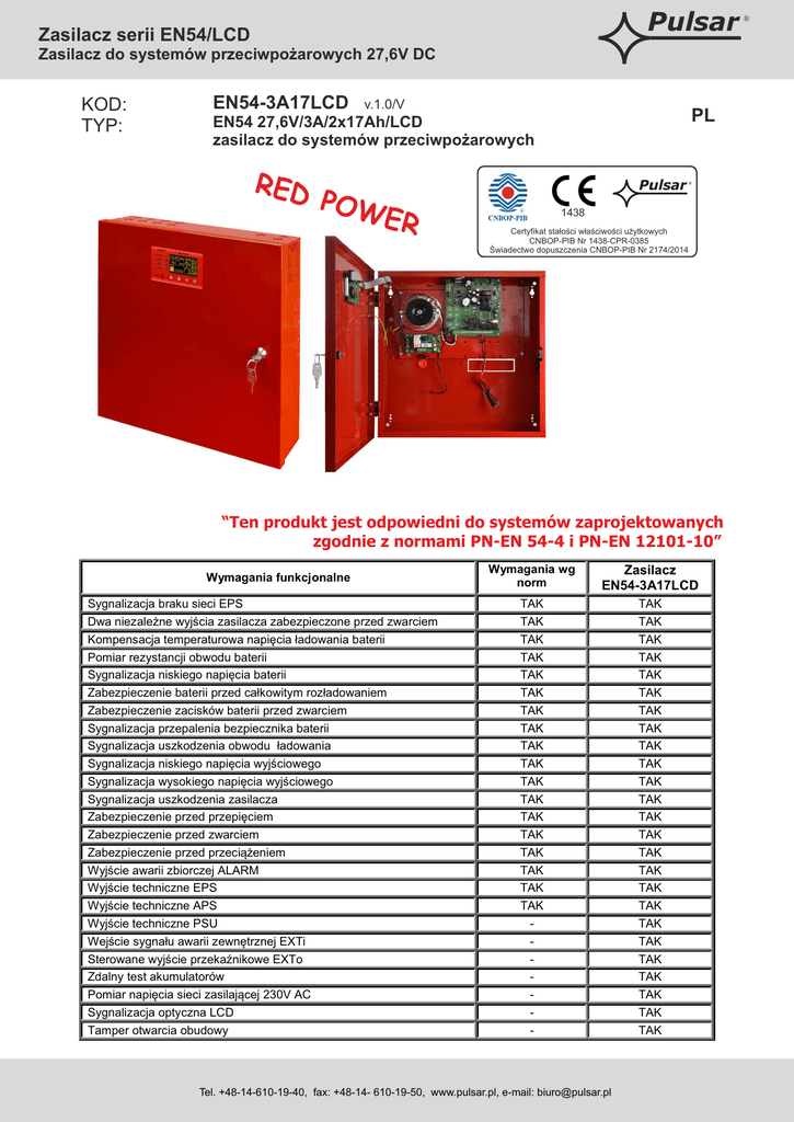 Pulsar Zasilacz serii EN54/LCD Zasilacz do systemów przeciwpożarowych 27,6V DC KOD: TYP: EN54-3A17LCD v.1.0/V PL EN54 27,6V/3A/2x17Ah/LCD zasilacz do systemów przeciwpożarowych RED POW ER 1438 Certyfikat stałości właściwości użytkowych CNBOP-PIB Nr 1438-CPR-0385 Świadectwo dopuszczenia CNBOP-PIB Nr 2174/2014 “Ten produkt jest odpowiedni do systemów zaprojektowanych zgodnie z normami PN-EN 54-4 i PN-EN 12101-10” Wymagania funkcjonalne Sygnalizacja braku sieci EPS Dwa niezależne wyjścia zasilacza zabezpieczone przed zwarciem Kompensacja temperaturowa napięcia ładowania baterii Pomiar rezystancji obwodu baterii Sygnalizacja niskiego napięcia baterii Zabezpieczenie baterii przed całkowitym rozładowaniem Zabezpieczenie zacisków baterii przed zwarciem Sygnalizacja przepalenia bezpiecznika baterii Sygnalizacja uszkodzenia obwodu ładowania Sygnalizacja niskiego napięcia wyjściowego Sygnalizacja wysokiego napięcia wyjściowego Sygnalizacja uszkodzenia zasilacza Zabezpieczenie przed przepięciem Zabezpieczenie przed zwarciem Zabezpieczenie przed przeciążeniem Wyjście awarii zbiorczej ALARM Wyjście techniczne EPS Wyjście techniczne APS Wyjście techniczne PSU Wejście sygnału awarii zewnętrznej EXTi Sterowane wyjście przekaźnikowe EXTo Zdalny test akumulatorów Pomiar napięcia sieci zasilającej 230V AC Sygnalizacja optyczna LCD Tamper otwarcia obudowy Wymagania wg norm Zasilacz EN54-3A17LCD TAK TAK TAK TAK TAK TAK TAK TAK TAK TAK TAK TAK TAK TAK TAK TAK TAK TAK - TAK TAK TAK TAK TAK TAK TAK TAK TAK TAK TAK TAK TAK TAK TAK TAK TAK TAK TAK TAK TAK TAK TAK TAK TAK Tel. +48-14-610-19-40, fax: +48-14- 610-19-50, www.pulsar.pl, e-mail: [email protected] ® Pulsar Zasilacz serii EN54/LCD Zasilacz do systemów przeciwpożarowych 27,6V DC Cechy zasilacza: · zgodność z wymaganiami norm PN-EN 54-4, PN-EN12101-10 oraz pkt. 12.2 wg Rozp.MSWiA z dn.20.06.2007 · bezprzerwowe zasilanie 27,6V DC/ 3A · miejsce na akumulatory 2x17Ah/12V · niezależnie zabezpieczone wyjścia zasilacza AUX1 i AUX2 · wysoka sprawność 84% · niski poziom tętnień napięcia · mikroprocesorowy system automatyki · inteligentna ochrona zasilacza w stanie przeciążenia · pomiar rezystancji obwodu akumulatorów · automatyczna kompensacja temperaturowa ładowania akumulatorów · test akumulatorów · dwufazowy proces ładowania akumulatorów · funkcja przyspieszonego ładowania akumulatorów · kontrola ciągłości obwodu akumulatorów · kontrola napięcia akumulatorów · kontrola stanu bezpiecznika akumulatorów · kontrola ładowania i konserwacji akumulatorów · ochrona akumulatorów przed nadmiernym rozładowaniem (UVP) · ochrona akumulatorów przed przeładowaniem · zabezpieczenie wyjścia akumulatorów przed zwarciem i odwrotnym podłączeniem · kontrola prądu obciążenia · kontrola napięcia wyjściowego · kontrola stanu bezpieczników wyjść AUX1 i AUX2 · pomiar napięcia sieci zasilającej 230V AC · port komunikacyjny „SERIAL” z zaimplementowanym protokołem MODBUS RTU · darmowy program “PowerSecurity” do monitorowania parametrów pracy zasilacza · zdalny monitoring (opcja: WiFi, Ethernet, RS485, USB) · zdalny test akumulatorów (wymagane dodatkowe moduły) · współpraca z modułami bezpiecznikowymi EN54LB4 i EN54-LB8 (opcjonalnie) · optyczna sygnalizacja przeciążenia zasilacza OVL · sygnalizacja akustyczna awarii · wybór czasu sygnalizacji zaniku sieci 230V AC · wyjście awarii zbiorczej ALARM · wejście awarii zbiorczej EXTi · sterowane wyjście przekaźnikowe EXTo · wejścia/wyjścia techniczne z izolacją galwaniczną · wyjście techniczne EPS sygnalizacji zaniku sieci 230V AC · wyjście techniczne PSU sygnalizacji awarii zasilacza · wyjście techniczne APS sygnalizacji awarii akumulatorów · wewnętrzna pamięć stanu pracy zasilacza · sygnalizacja optyczna - panel LCD · wskazania parametrów elektrycznych, np.: napięcie, prąd, rezystancja obwodu, napięcie sieci zasilającej 230V AC · sygnalizacja awarii · konfiguracja ustawień zasilacza z poziomu panelu · 2 poziomy dostępu zabezpieczone hasłami · historia pracy zasilacza · historia awarii · zegar czasu rzeczywistego z podtrzymaniem bateryjnym · zabezpieczenia: · przeciwzwarciowe SCP · przeciążeniowe OLP · termiczne OHP · nadnapięciowe OVP · przepięciowe · antysabotażowe: otwarcie obudowy TAMPER · zamykanie obudowy - zamek · chłodzenie konwekcyjne · gwarancja - 5 lat od daty produkcji Opis ogólny Zasilacz buforowy przeznaczony jest do bezprzerwowego zasilania urządzeń sygnalizacji pożarowej, systemów kontroli rozprzestrzeniania dymu i ciepła oraz urządzeń przeciwpożarowych i automatyki pożarowej wymagających stabilizowanego napięcia 24V DC (±15%). Zasilacz wyposażony jest w dwa niezależnie zabezpieczone wyjścia AUX1 i AUX2 które dostarczają napięcia 27,6V DC o sumarycznej wydajności prądowej: Praca ciągła Prąd wyjściowy Imax a=2A Praca chwilowa Prąd wyjściowy Imax b=3A W przypadku zaniku napięcia sieciowego następuje bezprzerwowe przełączenie na źródło zasilania rezerwowego w postaci akumulatorów. Zasilacz umieszczony jest w obudowie metalowej (kolor RAL 3001 - czerwony) z miejscem na akumulatory 2x17Ah/12V. Zasilacz współpracuje z bezobsługowymi akumulatorami kwasowo-ołowiowymi wykonanymi w technologii AGM lub żelowej. Tel. +48-14-610-19-40, fax: +48-14- 610-19-50, www.pulsar.pl, e-mail: [email protected] ® Pulsar Zasilacz serii EN54/LCD Zasilacz do systemów przeciwpożarowych 27,6V DC Klasa funkcjonalna PN-EN 12101-10:2007 Napięcie zasilania Pobór prądu Częstotliwość zasilania Moc zasilacza Sprawność Napięcie wyjściowe w 20 ºC Prąd wyjściowy Maksymalna rezystancja obwodu akumulatorów Napięcie tętnienia Pobór prądu na potrzeby własne zasilacza podczas pracy bateryjnej Prąd ładowania akumulatorów Współczynnik kompensacji temperaturowej napięcia akumulatorów Sygnalizacja niskiego napięcia 