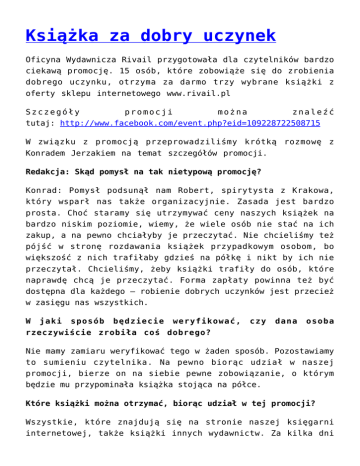Książka za dobry uczynek Oficyna Wydawnicza Rivail przygotowała dla czytelników bardzo ciekawą promocję. 15 osób, które zobowiąże się do zrobienia dobrego uczynku, otrzyma za darmo trzy wybrane książki z oferty sklepu internetowego www.rivail.pl Szczegóły promocji można znaleźć tutaj: http://www.facebook.com/event.php?eid=109228722508715 W związku z promocją przeprowadziliśmy krótką rozmowę z Konradem Jerzakiem na temat szczegółów promocji. Redakcja: Skąd pomysł na tak nietypową promocję? Konrad: Pomysł podsunął nam Robert, spirytysta z Krakowa, który wsparł nas także organizacyjnie. Zasada jest bardzo prosta. Choć staramy się utrzymywać ceny naszych książek na bardzo niskim poziomie, wiemy, że wiele osób nie stać na ich zakup, a na pewno chciałyby je przeczytać. Nie chcieliśmy też pójść w stronę rozdawania książek przypadkowym osobom, bo większość z nich trafiłaby gdzieś na półkę i nikt by ich nie przeczytał. Chcieliśmy, żeby książki trafiły do osób, które naprawdę chcą je przeczytać. Forma zapłaty powinna też być dostępna dla każdego – robienie dobrych uczynków jest przecież w zasięgu nas wszystkich. W jaki sposób będziecie weryfikować, czy dana osoba rzeczywiście zrobiła coś dobrego? Nie mamy zamiaru weryfikować tego w żaden sposób. Pozostawiamy to sumieniu czytelnika. Na pewno biorąc udział w naszej promocji, bierze on na siebie pewne zobowiązanie, o którym będzie mu przypominała książka stojąca na półce. Które książki można otrzymać, biorąc udział w tej promocji? Wszystkie, które znajdują się na stronie naszej księgarni internetowej, także książki innych wydawnictw. Za kilka dni powróci do naszej oferty chociażby książka „Niebo i piekło według spirytyzmu” Allana Kardeca – ją także będzie można otrzymać. Co ważne, można również wybrać jako jedną z pozycji prenumeratę kwartalnika „Spirytyzm”. Osoby, które się na to zdecydują, otrzymają pierwszy i drugi numer czasopisma już w przyszłym tygodniu, a kolejne dwa, gdy tylko się ukażą. Dlaczego warto wziąć udział w tej promocji? Są właściwie ku temu dwa powody. Po pierwsze, zawsze warto jest pomagać innym. Jeśli nasza promocja kogoś do tego skłoni, to będzie ogromny sukces. Po drugie, dlatego że książki spirytystyczne przynoszą odpowiedzi na pytania, które nurtują wielu ludzi. Jaki jest sens życia? Dlaczego cierpimy? Co powinniśmy robić, by osiągnąć szczęście tutaj na Ziemi i po śmierci? Czy będą niedługo kolejne książki w ofercie księgarni? Tak. Do końca roku powinniśmy wydać ok. 5-10 książek. Niestety proces wydawniczy jest dość długi i choć niektóre tłumaczenia są już niemal gotowe, należy poczekać jeszcze kilka tygodni, zanim ukażą się drukiem. Na pewno warto odwiedzać stronę naszego wydawnictwa. Co należy zatem zrobić, by wziąć udział w promocji? Oto kilka kroków, które należy przejść. Trzeba: 1) polubić profil naszego wydawnictwa Facebooku: http://www.facebook.com/ksiazkispirytystyczne na 2) śledzić nasz profil 1 sierpnia – podamy tam kod promocyjny, który należy wykorzystać przy składaniu zamówienia 3) wybrać dowolne 3 pozycje w naszym sklepie 4) złożyć zamówienie i wprowadzić kod 5) czekać na książkę, którą wyślemy pocztą 6) zrobić dobry uczynek W promocji może wziąć udział aż 15 osób. O której godzinie zostanie podany kod? Tego nie możemy zdradzić. Zapraszamy do śledzenia naszego profilu… Kod pojawi się na pewno 1 sierpnia, a godzina niech pozostanie na razie tajemnicą Dziękujemy za rozmowę!