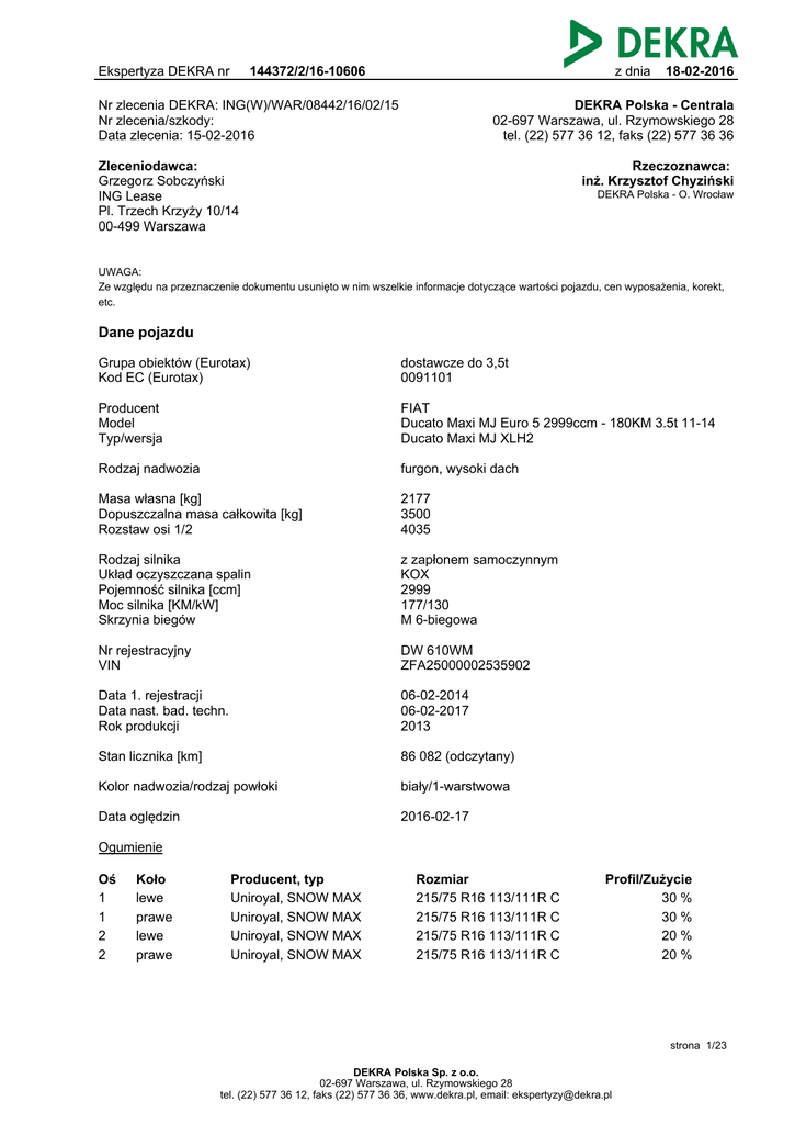 Ekspertyza DEKRA nr 144372/2/16-10606 z dnia Nr zlecenia DEKRA: ING(W)/WAR/08442/16/02/15 Nr zlecenia/szkody: Data zlecenia: 15-02-2016 18-02-2016 DEKRA Polska - Centrala 02-697 Warszawa, ul. Rzymowskiego 28 tel. (22) 577 36 12, faks (22) 577 36 36 Zleceniodawca: Grzegorz Sobczyński ING Lease Pl. Trzech Krzyży 10/14 00-499 Warszawa Rzeczoznawca: inż. Krzysztof Chyziński DEKRA Polska - O. Wrocław UWAGA: Ze względu na przeznaczenie dokumentu usunięto w nim wszelkie informacje dotyczące wartości pojazdu, cen wyposażenia, korekt, etc. Dane pojazdu Grupa obiektów (Eurotax) Kod EC (Eurotax) dostawcze do 3,5t 0091101 Producent Model Typ/wersja FIAT Ducato Maxi MJ Euro 5 2999ccm - 180KM 3.5t 11-14 Ducato Maxi MJ XLH2 Rodzaj nadwozia furgon, wysoki dach Masa własna [kg] Dopuszczalna masa całkowita [kg] Rozstaw osi 1/2 2177 3500 4035 Rodzaj silnika Układ oczyszczana spalin Pojemność silnika [ccm] Moc silnika [KM/kW] Skrzynia biegów z zapłonem samoczynnym KOX 2999 177/130 M 6-biegowa Nr rejestracyjny VIN DW 610WM ZFA25000002535902 Data 1. rejestracji Data nast. bad. techn. Rok produkcji 06-02-2014 06-02-2017 2013 Stan licznika [km] 86 082 (odczytany) Kolor nadwozia/rodzaj powłoki biały/1-warstwowa Data oględzin 2016-02-17 Ogumienie Oś 1 1 2 2 Koło lewe prawe lewe prawe Producent, typ Uniroyal, SNOW MAX Uniroyal, SNOW MAX Uniroyal, SNOW MAX Uniroyal, SNOW MAX Rozmiar 215/75 R16 113/111R C 215/75 R16 113/111R C 215/75 R16 113/111R C 215/75 R16 113/111R C Profil/Zużycie 30 % 30 % 20 % 20 % strona 1/23 DEKRA Polska Sp. z o.o. 02-697 Warszawa, ul. Rzymowskiego 28 tel. (22) 577 36 12, faks (22) 577 36 36, www.dekra.pl, email: [email protected] Ekspertyza DEKRA nr 144372/2/16-10606 z dnia 18-02-2016 Wyposażenie standardowe wg Eurotax 1. 2. 3. 4. 5. 6. ABS Airbag kierowcy Drzwi boczne prawe przesuwne - nieoszklone Drzwi tylne 180 st., nieprzeszklone Immobilizer Koło zapasowe pełnowymiarowe + zestaw Fix&Go 7. Lusterka prawe i lewe ustawiane mechanicznie 8. Mechaniczna regulacja położenia kierownicy 9. Osłony przeciwbłotne tylne 10. 11. 12. 13. 14. 15. Podłokietnik fotela kierowcy Servotronic Siedz. kier. z mech. regulacją wysokości Siedzenie podwójne pasażera Skrzynia biegów manualna System zabezpieczenia ładunku z bocznymi listwami 16. Zamykany schowek w desce rozdzielczej 17. Ścianka działowa z oknem Wyposażenie dealerskie 1. Czujnik odległości przy parkowaniu - tył ................................................................................................. 2. Pakiet SX z klimatyzacją ........................................................................................................................ 3. Półka pod sufitem ................................................................................................................................... Wyposażenie dodatkowe 1. Ściany przestrzeni ładunkowej wyłożone sklejką ................................................................................... - Wartość bazowa pojazdu Wartość bazowa pojazdu wg Eurotax (netto/zakup)¹ .............................................................................. - Korekty Pierwsza rejestracja Przebieg Wyposażenie Ogumienie Inne Stwierdzone braki i uszkodzenia ................................................................................................................ - Powyższą wartość określono w oparciu o notowania cen samochodów używanych na rynku polskim Eurotax (baza danych nr 02-2016 POL) z uwzględnieniem parametrów technicznych i rynkowych mających wpływ na wartość pojazdu. Dla pojazdów zarejestrowanych w Polsce powyższa wartość została określona na dzień sporządzenia wyceny. Jeżeli pojazd nie jest zarejestrowany w kraju - podana wartość jest wartością hipotetyczną przy założeniu uiszczenia wszelkich opłat i podatków należnych przy wprowadzeniu pojazdu na polski obszar celny. strona 2/23 DEKRA Polska Sp. z o.o. 02-697 Warszawa, ul. Rzymowskiego 28 tel. (22) 577 36 12, faks (22) 577 36 36, www.dekra.pl, email: [email protected] Ekspertyza DEKRA nr 144372/2/16-10606 z dnia 18-02-2016 Wydruk podstawowy bez informacji o wartości pojazdu - ze względu na przeznaczenie dokumentu usunięto w nim wszelkie informacje dotyczące wartości pojazdu, cen wyposażenia, korekt, etc. Data: 18-02-2016 Rzeczoznawca DEKRA: inż. Krzysztof Chyziński Dokument wystawiony elektronicznie ważny bez podpisu. strona 3/23 DEKRA Polska Sp. z o.o. 02-697 Warszawa, ul. Rzymowskiego 28 tel. (22) 577 36 12, faks (22) 577 36 36, www.dekra.pl, email: [email protected] Ekspertyza DEKRA nr 144372/2/16-10606 z dnia 18-02-2016 Pomiar grubości powłoki lakierowej poj. Nr punktu kontroli 1 2 3 4 6 7 8 10 11 13 14 15 16 17 18 19 20 21 Kontrolowany element Pokrywa przednia Błotnik przedni lewy Słupek przedni lewy Drzwi przednie lewe Dach część lewa Słupek środkowy lewy Próg lewy Ściana boczna lewa Drzwi tyłu lewe Drzwi tyłu prawe Ściana boczna prawa Dach część prawa Drzwi boczne prawe Słupek środkowy prawy Drzwi przednie prawe Próg prawy Słupek przedni prawy Błotnik przedni prawy Zmierzony przedział grubości powłoki lakierowej [µm] 85 - 100 85 - 100 85 - 100 85 - 100 85 - 100 70 - 85 75 - 90 85 - 100 85 - 100 85 - 100 85 - 100 85 - 100 85 - 100 70 - 80 85 - 100 80 - 90 85 - 100 85 - 100 strona 4/23 DEKRA Polska Sp. z o.o. 02-697 Warszawa, ul. Rzymowskiego 28 tel. (22) 577 36 12, faks (22) 577 36 36, www.dekra.pl, email: [email protected] Ekspertyza DEKRA nr 144372/2/16-10606 z dnia 18-02-2016 Opis stanu technicznego Nadwozie/Elementy karoserii Nazwa elementu Próg Opis elementu lew. Drzwi Drzwi przed. l. tyln. p. Rodzaj uszkodzenia Umiejscowienie / Rozmiar ubytek powłoki lakierowej zarysowanie w części środkowej wgniecenie/nia, płytkie na krawędzi Uwagi drzwi przesuwne Stan techniczny nadwozia Stan techniczny nadwozia opisano w załączonej tabeli. Przeprowadzona naprawa blacharsko-lakiernicza Nie stwierdzono Nadwoz