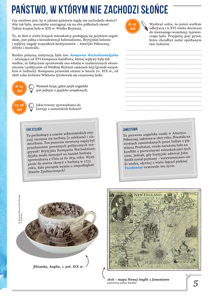 PaŃsTwO, w kTóRyM nIe zAcHoDzI sŁoŃcE Czy możliwe jest, by w jakimś państwie nigdy nie zachodziło słońce? Aby tak było, musiałoby rozciągnąć się na obu półkulach ziemi! Takim krajem była w XIX w. Wielka Brytania. 8-12 lat To, że dziś w wielu krajach mieszkańcy posługują się językiem angielskim, jest jedną z konsekwencji kolonializmu. Brytyjskie kolonie i wpływy sięgały wszystkich kontynentów – Ameryki Północnej, Afryki i Australii. Wyobraź sobie, że jesteś wielkim odkrywcą i w XVI wieku docierasz do nieznanego wcześniej, tajemniczego lądu. Przygotuj pięć pytań, które chciałbyś zadać spotkanym tam ludziom. Bardzo potężną instytucją była tzw. Kompania Wschodnioindyjska – istniejąca od XVI kompania handlowa, której wpływy były tak wielkie, że faktycznie sprawowała ona władzę w uzależnionych ekonomicznie i politycznie od Wielkiej Brytanii częściach Azji (przede wszystkim w Indiach). Kompania przestała istnieć w latach 70. XIX w., od 1876 roku królowa Wiktoria tytułowała się cesarzową Indii. 8-14 lat 12-16 lat Wymień kraje, gdzie język angielski jest jednym z języków urzędowych. Jakie towary sprowadzano do Europy z zamorskich kolonii? FiVe o’cLoCk JaMeStOwN a osada w Ameryce To pierwsza angielsk 1607 roku. Powstała na Północnej, założona w ch przez Indian z pleziemiach zamieszkany da narażona była na mienia Powhatan, osa i mieszkańcami tych konflikt z pierwotnym tyjski admirał John ziem. Jednak, gdy bry – wstawiennictwo córSmith został pojmany elu legend pięknej ki wodza, słynnej z wi mu życie. Pocahontas uratowało Ze zbiorów Muzeum Narodowego w Krakowie wiktoriańskich zwyTo pochodzący z czasów tą (z mlekiem) i ciaczaj raczenia się herba niewinny napój był steczkiem. Ten pozornie ych politycznych roz przedmiotem poważn nioi dn cho Ws ia mpan grywek! Brytyjska Ko na handel herbatą l po no mo ała mi dyjska do 1834 roku. Wysysprowadzaną z Chin aż z herbatą w 1773 panie do morza skrzyń jnie o niepodległość roku, dało początek wo ! Stanów Zjednoczonych filiżanka, Anglia, 1. poł. XIX w. 1616 – mapa Nowej Anglii z Jamestown autorstwa Johna Smitha 5