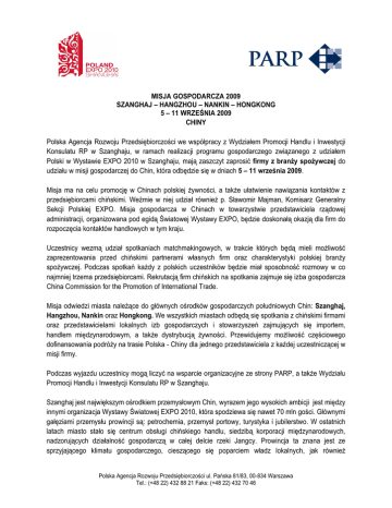 MISJA GOSPODARCZA 2009 SZANGHAJ – HANGZHOU – NANKIN – HONGKONG 5 – 11 WRZEŚNIA 2009 CHINY Polska Agencja Rozwoju Przedsiębiorczości we współpracy z Wydziałem Promocji Handlu i Inwestycji Konsulatu RP w Szanghaju, w ramach realizacji programu gospodarczego związanego z udziałem Polski w Wystawie EXPO 2010 w Szanghaju, mają zaszczyt zaprosić firmy z branŜy spoŜywczej do udziału w misji gospodarczej do Chin, która odbędzie się w dniach 5 – 11 września 2009. Misja ma na celu promocję w Chinach polskiej Ŝywności, a takŜe ułatwienie nawiązania kontaktów z przedsiębiorcami chińskimi. Weźmie w niej udział równieŜ p. Sławomir Majman, Komisarz Generalny Sekcji Polskiej EXPO. Misja gospodarcza w Chinach w towarzystwie przedstawiciela rządowej administracji, organizowana pod egidą Światowej Wystawy EXPO, będzie doskonałą okazją dla firm do rozpoczęcia kontaktów handlowych w tym kraju. Uczestnicy wezmą udział spotkaniach matchmakingowych, w trakcie których będą mieli moŜliwość zaprezentowania przed chińskimi partnerami własnych firm oraz charakterystyki polskiej branŜy spoŜywczej. Podczas spotkań kaŜdy z polskich uczestników będzie miał sposobność rozmowy w co najmniej trzema przedsiębiorcami. Rekrutacją firm chińskich na spotkania zajmuje się izba gospodarcza China Commission for the Promotion of International Trade. Misja odwiedzi miasta naleŜące do głównych ośrodków gospodarczych południowych Chin: Szanghaj, Hangzhou, Nankin oraz Hongkong. We wszystkich miastach odbędą się spotkania z chińskimi firmami oraz przedstawicielami lokalnych izb gospodarczych i stowarzyszeń zajmujących się importem, handlem międzynarodowym, a takŜe dystrybucją Ŝywności. Przewidujemy moŜliwość częściowego dofinansowania podróŜy na trasie Polska - Chiny dla jednego przedstawiciela z kaŜdej uczestniczącej w misji firmy. Podczas wyjazdu uczestnicy mogą liczyć na wsparcie organizacyjne ze strony PARP, a takŜe Wydziału Promocji Handlu i Inwestycji Konsulatu RP w Szanghaju. Szanghaj jest największym ośrodkiem przemysłowym Chin, wyrazem jego wysokich ambicji jest między innymi organizacja Wystawy Światowej EXPO 2010, która spodziewa się nawet 70 mln gości. Głównymi gałęziami przemysłu prowincji są: petrochemia, przemysł portowy, turystyka i jubilerstwo. W ostatnich latach miasto stało się centrum obsługi chińskiego handlu, siedzibą korporacji międzynarodowych, nadzorujących działalność gospodarczą w całej delcie rzeki Jangcy. Prowincja ta znana jest ze sprzyjającego klimatu gospodarczego, cieszącego się poparciem władz lokalnych, jak równieŜ Polska Agencja Rozwoju Przedsiębiorczości ul. Pańska 81/83, 00-834 Warszawa Tel.: (+48 22) 432 88 21 Faks: (+48 22) 432 70 46 wieloletnią tradycją współpracy międzynarodowej. Wśród chińskich miast Szanghaj jest drugim najwaŜniejszym miastem, po Pekinie, dla polskich kontaktów handlowych. Hangzhou, stolica prowincji Zhejiang, osiągnęła w ostatnich latach znaczący sukces gospodarczy, to na jej terenie powstawały pierwsze w Chinach prywatne przedsiębiorstwa. Głównymi gałęziami przemysłu prowincji są: artykuły spoŜywcze, urządzenia elektromaszynowe, tekstylia, skóry. Eksport z Polski do prowincji Zhejiang wyniósł 54,5 mln USD, wartość importu sięgnęła 1 940 mln USD, co przekracza 21% chińskiego importu do Polski. Nankin to silny ośrodek przemysłowy prowincji Jiangsu, drugiej pod względem wysokości PKB gospodarki Chin. Do głównych gałęzi przemysłu naleŜy rolnictwo, a takŜe chemia, sól, tekstylia, materiały budowlane. Eksport z Polski wyniósł 124 mln USD, natomiast import z Jiangsu – ponad 2 272 mln USD. Hongkong to specjalny region administracyjny Chińskiej Republiki Ludowej, znajdujący się nad Morzem Południowochińskim, przy ujściu Rzeki Perłowej. NaleŜący do najbogatszych miast na świecie Hongkong od lat pełni rolę jednego ze światowych centrów handlowo-finansowych. Do głównych gałęzi przemysłu naleŜą m.in. przemysł spoŜywczy, chemiczny (głównie tworzywa sztuczne), metalowy, elektroniczny, precyzyjny i optyczny (zegarki, aparaty fotograficzne). Polska jest największym partnerem gospodarczym Chin w Europie Centralnej. Znaczący wpływ na wzrost zainteresowania Polską miało wejście Polski do Unii Europejskiej, w jego wyniku polskie wyroby zaczęły być uwaŜane produkty o wysokiej, europejskiej jakości, lecz tańsze niŜ ich odpowiedniki z Europy Zachodniej. Wszystkich zainteresowanych uczestnictwem w misji gospodarczej, uprzejmie prosimy o wypełnienie załączonego formularza zgłoszeniowego i przesłanie go mailem na adres: [email protected]. Po otrzymaniu Państwa zgłoszenia skontaktujemy się w celu ustalenia szczegółów dotyczących udziału firmy w misji. Termin przyjmowania zgłoszeń upływa 21 sierpnia 2009 r. Dodatkowych informacji udziela: Aleksandra Ptak Biuro Komisarza Generalnego Sekcji Polskiej EXPO 2010 Polska Agencja Rozwoju Przedsiębiorczości ul. Pańska 81/83, 00-834 Warszawa Tel.: (+48 22) 432 88 21 Faks: (+48 22) 432 70 46 E-mail: [email protected] Polska Agencja Rozwoju Przedsiębiorczości ul. Pańska 81/83, 00-834 Warszawa Tel.: (+48 22) 432 88 21 Faks: (+48 22) 432 70 46