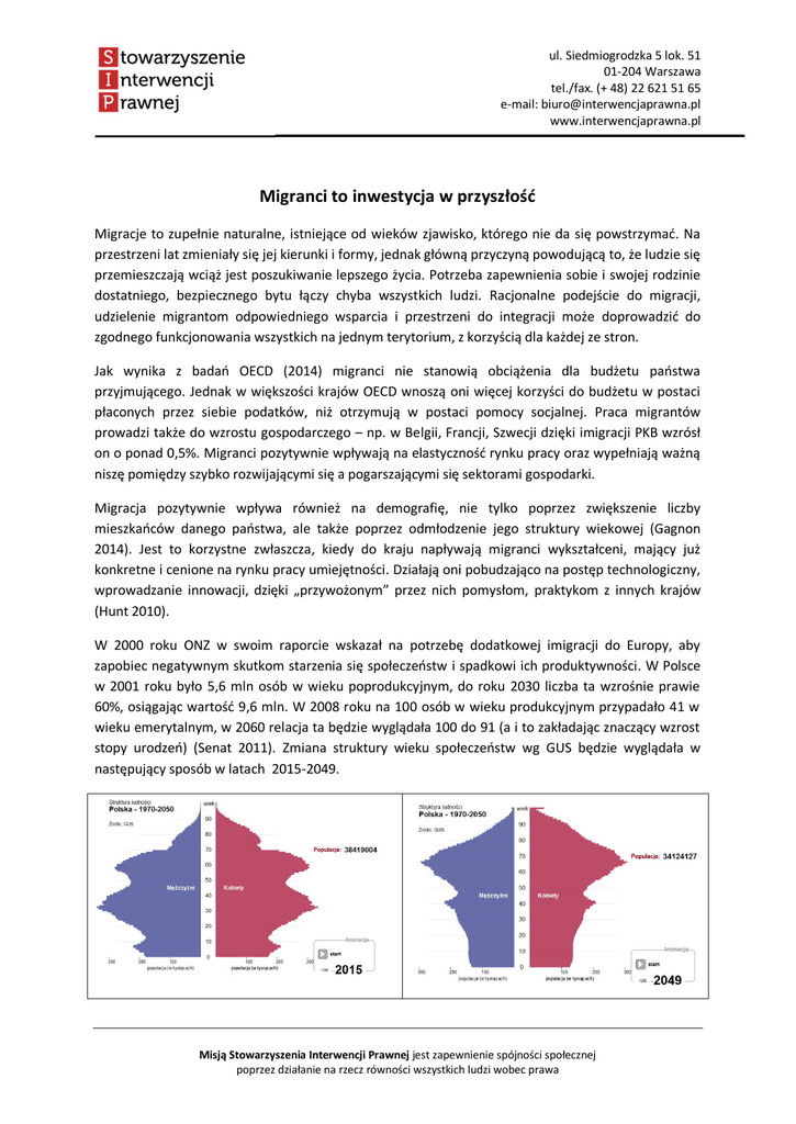 ul. Siedmiogrodzka 5 lok. 51 01-204 Warszawa tel./fax. (+ 48) 22 621 51 65 e-mail: [email protected] www.interwencjaprawna.pl Migranci to inwestycja w przyszłość Migracje to zupełnie naturalne, istniejące od wieków zjawisko, którego nie da się powstrzymać. Na przestrzeni lat zmieniały się jej kierunki i formy, jednak główną przyczyną powodującą to, że ludzie się przemieszczają wciąż jest poszukiwanie lepszego życia. Potrzeba zapewnienia sobie i swojej rodzinie dostatniego, bezpiecznego bytu łączy chyba wszystkich ludzi. Racjonalne podejście do migracji, udzielenie migrantom odpowiedniego wsparcia i przestrzeni do integracji może doprowadzić do zgodnego funkcjonowania wszystkich na jednym terytorium, z korzyścią dla każdej ze stron. Jak wynika z badań OECD (2014) migranci nie stanowią obciążenia dla budżetu państwa przyjmującego. Jednak w większości krajów OECD wnoszą oni więcej korzyści do budżetu w postaci płaconych przez siebie podatków, niż otrzymują w postaci pomocy socjalnej. Praca migrantów prowadzi także do wzrostu gospodarczego – np. w Belgii, Francji, Szwecji dzięki imigracji PKB wzrósł on o ponad 0,5%. Migranci pozytywnie wpływają na elastyczność rynku pracy oraz wypełniają ważną niszę pomiędzy szybko rozwijającymi się a pogarszającymi się sektorami gospodarki. Migracja pozytywnie wpływa również na demografię, nie tylko poprzez zwiększenie liczby mieszkańców danego państwa, ale także poprzez odmłodzenie jego struktury wiekowej (Gagnon 2014). Jest to korzystne zwłaszcza, kiedy do kraju napływają migranci wykształceni, mający już konkretne i cenione na rynku pracy umiejętności. Działają oni pobudzająco na postęp technologiczny, wprowadzanie innowacji, dzięki „przywożonym” przez nich pomysłom, praktykom z innych krajów (Hunt 2010). W 2000 roku ONZ w swoim raporcie wskazał na potrzebę dodatkowej imigracji do Europy, aby zapobiec negatywnym skutkom starzenia się społeczeństw i spadkowi ich produktywności. W Polsce w 2001 roku było 5,6 mln osób w wieku poprodukcyjnym, do roku 2030 liczba ta wzrośnie prawie 60%, osiągając wartość 9,6 mln. W 2008 roku na 100 osób w wieku produkcyjnym przypadało 41 w wieku emerytalnym, w 2060 relacja ta będzie wyglądała 100 do 91 (a i to zakładając znaczący wzrost stopy urodzeń) (Senat 2011). Zmiana struktury wieku społeczeństw wg GUS będzie wyglądała w następujący sposób w latach 2015-2049. Misją Stowarzyszenia Interwencji Prawnej jest zapewnienie spójności społecznej poprzez działanie na rzecz równości wszystkich ludzi wobec prawa ul. Siedmiogrodzka 5 lok. 51 01-204 Warszawa tel./fax. (+ 48) 22 621 51 65 e-mail: [email protected] www.interwencjaprawna.pl Spadek liczby osób w wieku produkcyjnym (mający największy wpływ na procesy ekonomicznospołeczne) może mieć katastrofalne skutki dla rozwiniętych społeczeństw. ONZ stwierdza, że migracja może mieć pozytywny wpływ na zmniejszenie ubytku demograficznego i utrzymanie liczby osób w wieku produkcyjnym na stabilnym poziomie. Wobec tego, że poziom wieku emerytalnego nie można w nieskończoność wydłużać, imigracja pozostaje jedynym rozwiązaniem problemu zapewnienia stabilności świadczeń emerytalnych. Warto też podkreślić, że imigranci często podejmują pracę opiekunów domowych, co również jest istotne w kontekście dominacji liczby osób starszych, wymagających takiej opieki nad młodszymi, czynnymi zawodowo. Należy tak kształtować politykę migracyjną, by sprzyjała wzrostowi dobrobytu i spójności społecznej, by budować postrzeganie migrantów w kategorii inwestycji, która może służyć nam wszystkim. oprac. Witold Klaus, Karolina Mazurczak 2 Misją Stowarzyszenia Interwencji Prawnej jest zapewnienie spójności społecznej poprzez działanie na rzecz równości wszystkich ludzi wobec prawa