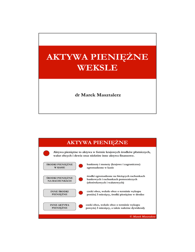 AKTYWA PIENIĘśNE WEKSLE dr Marek Masztalerz AKTYWA PIENIĘśNE Aktywa pienięŜne to aktywa w formie krajowych środków płatniczych, walut obcych i dewiz oraz niektóre inne aktywa finansowe. ŚRODKI PIENIĘśNE W KASIE banknoty i monety (krajowe i zagraniczne) zgromadzone w kasie ŚRODKI PIENIĘśNE NA RACHUNKACH środki zgromadzone na bieŜących rachunkach bankowych i rachunkach pomocniczych (złotówkowych i walutowych) INNE ŚRODKI PIENIĘśNE czeki obce, weksle obce o terminie wykupu poniŜej 3 miesięcy, środki pienięŜne w drodze INNE AKTYWA PIENIĘśNE czeki obce, weksle obce o terminie wykupu powyŜej 3 miesięcy, a takŜe naleŜne dywidendy © Marek Masztalerz 1 EWIDENCJA GOTÓWKI W KASIE Operacje w kasie potwierdzają dowody: KP – Kasa przyjmie KW – Kasa wyda RK – Raport kasowy © Marek Masztalerz EWIDENCJA GOTÓWKI W KASIE 100 KASA wpłaty gotówkowe wypłaty gotówkowe nadwyŜki w kasie niedobory w kasie dodatnie róŜnice kursowe ujemne róŜnice kursowe © Marek Masztalerz 2 EWIDENCJA ŚRODKÓW PIENIĘśNYCH NA RACHUNKU BANKOWYM Operacje na rachunku bankowym potwierdza wyciąg bankowy (WB). Przykładowy uproszczony wyciąg z rachunku bankowego: Data 19.04.2009 Treść operacji Winien STYPENDIUM NAUKOWE Ma 300,00 21.04.2009 WYPŁATA Z BANKOMATU 22.04.2009 WYGRANA NA LOTERII 23.04.2009 PŁATNOŚĆ KARTĄ STARY BROWAR 200,00 1 000,00 140,00 Wyciąg bankowy jest wydrukiem z systemu księgowego banku, a zatem strony konta dla poszczególnych operacji są podane z punktu widzenia banku. © Marek Masztalerz EWIDENCJA ŚRODKÓW PIENIĘśNYCH NA RACHUNKU BANKOWYM 130 RACHUNEK BANKOWY wpłaty gotówkowe wypłaty gotówkowe przelewy przychodzące przelewy wychodzące płatności kartą zaciągnięcie kredytu spłata kredytu odsetki (przychody) odsetki (koszty) dodatnie róŜnice kursowe ujemne róŜnice kursowe zamknięcie akredytywy otwarcie akredytywy © Marek Masztalerz 3 EWIDENCJA RÓśNIC KURSOWYCH Op. Treść operacji 1 WB - Zakupiono 12 000 USD. 2 WB - Sprzedano 2 000 USD. 3 Dokonano wyceny bilansowej walut. Rachunek PLN 2) 4 300 26 400 (1 2) 100 Kurs sprzedaŜy banku Kurs średni NBP 2,09 2,15 2,10 2,20 2,29 2,25 2,14 2,22 2,29 Kwota 26 400 4 300 22 900* Rachunek USD 1) 26 400 3) Koszty finansowe Kurs kupna banku 4 400 (2 900 Przychody finansowe 900 (3 * Kwota 22 900 zł oznacza wartość posiadanych USD na dzień bilansowy. RóŜnice kursowe wynoszą: 22 900 – 22 000 = 900 zł. © Marek Masztalerz WEKSEL Weksel jest bezwarunkowym zobowiązaniem wystawcy weksla do zapłaty określonej kwoty (suma wekslowa) w określonym terminie. Weksel własny jest składnikiem zobowiązań wystawcy weksla. Weksel obcy wchodzi w skład krótkoterminowych aktywów finansowych posiadacza weksla. Weksle obce o terminie wykupu poniŜ poniŜej 3 miesię miesięcy zalicza się nych. się do środków pienięŜ pienięŜnych. © Marek Masztalerz 4 DYSKONTO WEKSLA Weksel obcy moŜe zostać ZDYSKONTOWANY w banku. W efekcie tej operacji bank wypłaca posiadaczowi weksla określoną kwotę, niŜszą od sumy wekslowej (bank potrąca dyskonto, które jest „ceną” za realizację weksla przed terminem) a prawa do otrzymania sumy wekslowej przechodzą na nowego posiadacza weksla. weksel weksel POSIADACZ WEKSLA dyskonto weksla redyskonto weksla BANK gotówka DYSKONTO = suma wekslowa ⋅ NBP gotówka liczba dni dyskonta ⋅ stopa dyskontowa 365 Stopa redyskonta weksli NBP wynosi obecnie 4% rocznie. © Marek Masztalerz INDOS WEKSLA Weksel obcy moŜe być wykorzystany do pokrycia własnych zobowiązań w drodze INDOSU. Operacja ta polega na uregulowaniu zobowiązania obcym wekslem. Prawa do otrzymania sumy wekslowej przechodzą na nowego posiadacza weksla. Wartość zobowiązania jest niŜsza od sumy wekslowej (dyskonto). weksel obcy INDOSANT Zmniejsza się stan weksli obcych oraz stan zobowiązań wobec indosatariusza. Zwiekszają się koszty finansowe (dyskonto). INDOSATARIUSZ Zwiększa się stan weksli obcych oraz przychody finansowe (dyskonto). Zmniejsza się stan naleŜności od indosanta. © Marek Masztalerz 5 EWIDENCJA WEKSLI (1) Firma Alfa wystawiła weksel na pokrycie zobowiązania z tytułu dostaw 650 zł wobec firmy Omega. Suma wekslowa wynosi 700 zł. RóŜnica między wartością zobowiązania z tytułu dostawy towarów a sumą wekslową to dyskonto, które jest „ceną” za odroczenie płatności. Księgi rachunkowe wystawcy weksla (Alfa) Księgi rachunkowe posiadacza weksla (Omega) © Marek Masztalerz EWIDENCJA WEKSLI (2) Po upływie terminu firma Alfa wykupiła weksel dokonując przelewu sumy wekslowej na konto dostawcy. Księgi rachunkowe wystawcy weksla (Alfa) Księgi rachunkowe posiadacza weksla (Omega) © Marek Masztalerz 6 EWIDENCJA WEKSLI (3) Firma Delta oddała do dyskonta weksel obcy o wartości nominalnej 400 zł. Stopa dyskontowa w banku wynosi 10 %. Do dnia wykupu weksla pozostało 73 dni. Księgi rachunkowe posiadacza weksla (Delta) © Marek Masztalerz EWIDENCJA WEKSLI (4) Firma Gamma uregulowała zobowiązanie wobec dostawcy Beta w wysokości 880 zł w drodze indosu weksla obcego o wartości nominalnej 900 zł. Księgi rachunkowe INDOSANTA (Gamma) Księgi rachunkowe INDOSATARIUSZA (Beta) © Marek Masztalerz 7
