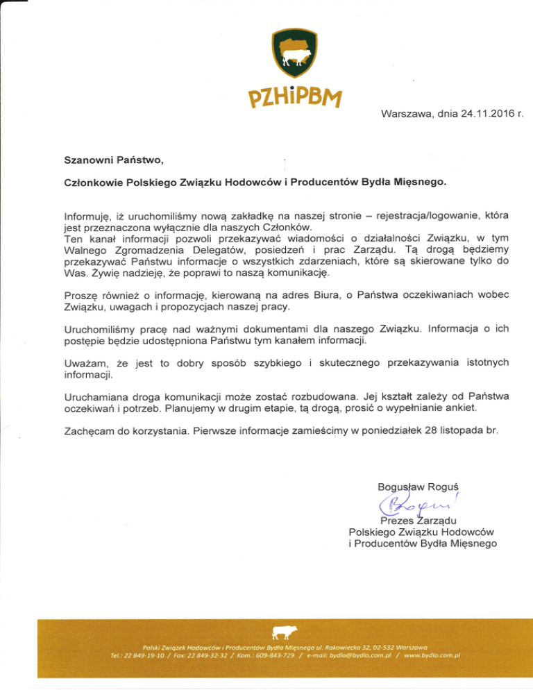 pIHiPBftt Warszawa. dnia 24.11.2016 Szanowni Państwo' . członkowie PolskiegoZwiązku Hodowców i Producentów Bydła Mięsnego. |nformuję, ii uruchomi|iŚmy nową zakładkę na naszej stronie jest przeznaczona wyłącznie d|a naszych Członkow. - rejestracja/|ogowanie, która Ten kanał informacji pozwo|i przekazywać wiadomościo działa|nościZwiązku, w tym Walnego Zgromadzenia De|egatów, posiedzeń i prac Zarządu' Tą drogą będziemy przekazywaó Państwu informacje o wszystkich zdarzeniach, które są skierowane ty|ko do Was. Żywię nadzieję, ze poprawi to naszą komunikację. Proszę równiez o informację, kierowaną na adres Biura, o Państwa oczekiwaniach wobec Związku, uwagach i propozycjach naszej pracy. Uruchomi|iśmy pracę nad waznymi dokumentami d|a naszego Związku. lnformacja postępie będzie udostępniona Państwu tym kanałem informacji. Uwaiam, Że jest to dobry sposÓb szybkiego informacji. i o ich skutecznego przekazywania istotnych Uruchamiana droga komunikacji moze zostać rozbudowana. Jej kształt za|eŻy od Państwa oczekiwań i potrzeb. Planujemy w drugim etapie, tą drogą, prosiÓ o wypełnianie ankiet' Zachęcam do korzystania. Pieru.usze informacje zamieścimy w poniedziałek 28 |istopada br. BogĄaw Roguś V* , ,, / Prezes Zarządu Po|skiego Związku H od owcow i Producentow Bydła Mięsnego r.