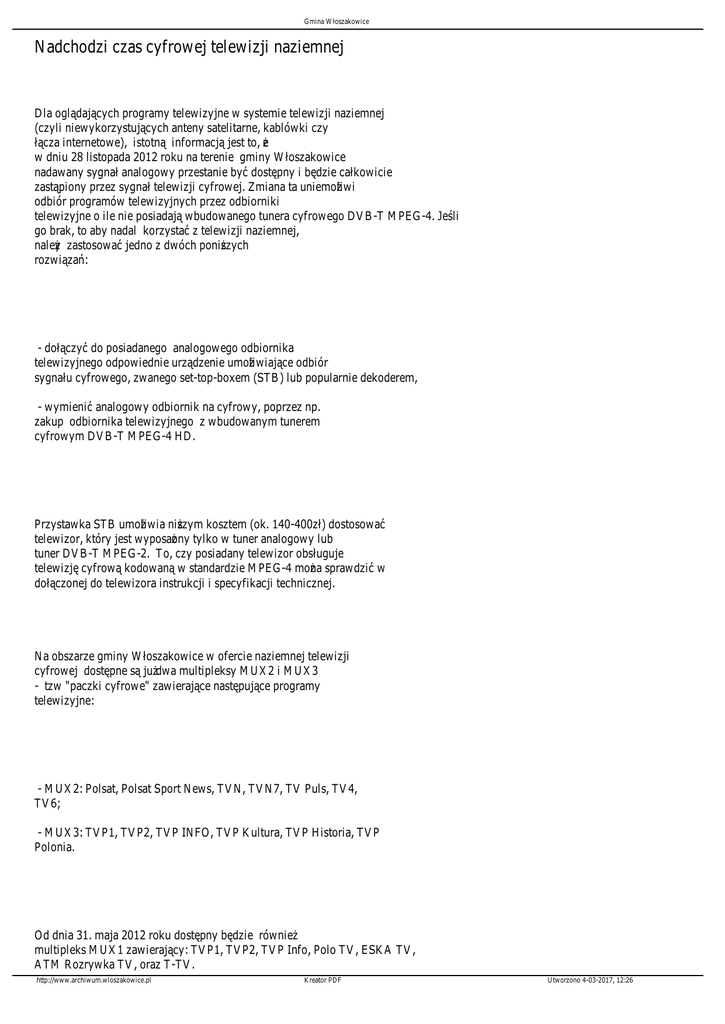 Gmina Włoszakowice Nadchodzi czas cyfrowej telewizji naziemnej Dla oglądających programy telewizyjne w systemie telewizji naziemnej (czyli niewykorzystujących anteny satelitarne, kablówki czy łącza internetowe), istotną informacją jest to, że w dniu 28 listopada 2012 roku na terenie gminy Włoszakowice nadawany sygnał analogowy przestanie być dostępny i będzie całkowicie zastąpiony przez sygnał telewizji cyfrowej. Zmiana ta uniemożliwi odbiór programów telewizyjnych przez odbiorniki telewizyjne o ile nie posiadają wbudowanego tunera cyfrowego DVB-T MPEG-4. Jeśli go brak, to aby nadal korzystać z telewizji naziemnej, należy zastosować jedno z dwóch poniższych rozwiązań: - dołączyć do posiadanego analogowego odbiornika telewizyjnego odpowiednie urządzenie umożliwiające odbiór sygnału cyfrowego, zwanego set-top-boxem (STB) lub popularnie dekoderem, - wymienić analogowy odbiornik na cyfrowy, poprzez np. zakup odbiornika telewizyjnego z wbudowanym tunerem cyfrowym DVB-T MPEG-4 HD. Przystawka STB umożliwia niższym kosztem (ok. 140-400zł) dostosować telewizor, który jest wyposażony tylko w tuner analogowy lub tuner DVB-T MPEG-2. To, czy posiadany telewizor obsługuje telewizję cyfrową kodowaną w standardzie MPEG-4 można sprawdzić w dołączonej do telewizora instrukcji i specyfikacji technicznej. Na obszarze gminy Włoszakowice w ofercie naziemnej telewizji cyfrowej dostępne są już dwa multipleksy MUX2 i MUX3 - tzw "paczki cyfrowe" zawierające następujące programy telewizyjne: - MUX2: Polsat, Polsat Sport News, TVN, TVN7, TV Puls, TV4, TV6; - MUX3: TVP1, TVP2, TVP INFO, TVP Kultura, TVP Historia, TVP Polonia. Od dnia 31. maja 2012 roku dostępny będzie również multipleks MUX1 zawierający: TVP1, TVP2, TVP Info, Polo TV, ESKA TV, ATM Rozrywka TV, oraz T-TV. http://www.archiwum.wloszakowice.pl Kreator PDF Utworzono 4-03-2017, 12:26 Gmina Włoszakowice Najbliższy nadajnik cyfrowej telewizji naziemnej znajduje się w Śremie, dlatego by uzyskać maksymalne natężenie sygnału należy przekierować anteny w kierunku pólnocno-wschodnim. Odległość w linii prostej od nadajnika dla mieszkańców gminy Włoszakowice jest wystarczająca by poprawny odbiór sygnału realizowały zwykłe anteny kierunkowe, które stosowane były przy odbiorze sygnału telewizji analogowej. Odbiorcy, których domy położone są w zagłębieniach terenu, jak w przypadku większej części mieszkańców Grotnik, mogą być zmuszeni do zastosowania anten ze wzmacniaczem sygnału. Oto kilka powodów dla których warto dostosować swój odbiornik do odbioru naziemnej telewizji cyfrowej: - dostęp do większej liczby programów telewizyjnych, niż w dotychczasowej ofercie analogowej, - poprawa jakości obrazu i dźwięku (brak zakłóceń np. w postaci tzw. odbić sygnału czy śnieżenia), - wysoka rozdzielczość obrazu, - równoległe nadawanie kilku ścieżek dźwiękowych do wyboru (np. w kilku językach, dźwięku przestrzennego). oraz danych dodatkowych (np. napisów), - dostęp do usług dodatkowych, w tym o charakterze interaktywnym, wtedy gdy odbiornik lub STB podłączony jest także do Internetu, - brak dodatkowych opłat za dostarczanie sygnału w przeciwieństwie do znanych komercyjnych dostawców działających na polskim rynku. Warto zapamiętać: - 28 listopada 2012 r. - termin zakończenia emisji sygnału analogowego telewizji naziemnej, - do odbioru naziemnej telewizji cyfrowej konieczny jest tuner DVB-T MPEG-4. - do odbioru sygnału może służyć zwykła wykorzystywana dotychczas antena (może być konieczna zmiana jej orientacji przestrzennej), http://www.archiwum.wloszakowice.pl Kreator PDF Utworzono 4-03-2017, 12:26 Gmina Włoszakowice Marek Wodawski http://www.archiwum.wloszakowice.pl Kreator PDF Utworzono 4-03-2017, 12:26