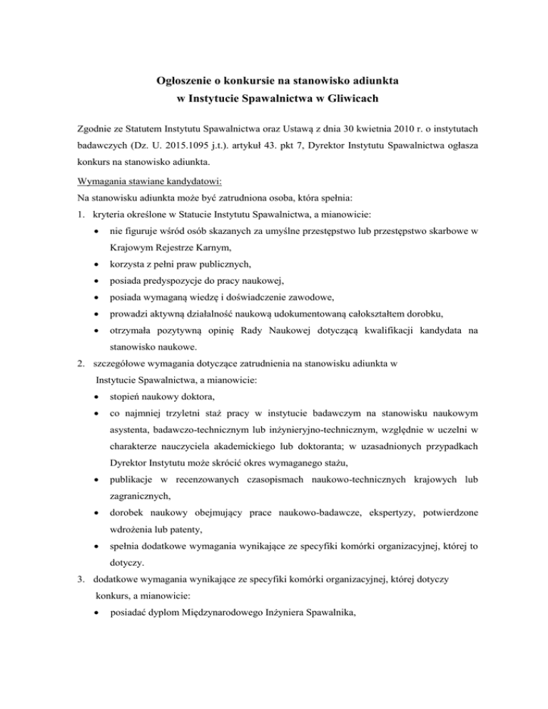 Ogłoszenie o konkursie na stanowisko adiunkta w Instytucie Spawalnictwa w Gliwicach Zgodnie ze Statutem Instytutu Spawalnictwa oraz Ustawą z dnia 30 kwietnia 2010 r. o instytutach badawczych (Dz. U. 2015.1095 j.t.). artykuł 43. pkt 7, Dyrektor Instytutu Spawalnictwa ogłasza konkurs na stanowisko adiunkta. Wymagania stawiane kandydatowi: Na stanowisku adiunkta może być zatrudniona osoba, która spełnia: 1. kryteria określone w Statucie Instytutu Spawalnictwa, a mianowicie: nie figuruje wśród osób skazanych za umyślne przestępstwo lub przestępstwo skarbowe w Krajowym Rejestrze Karnym, korzysta z pełni praw publicznych, posiada predyspozycje do pracy naukowej, posiada wymaganą wiedzę i doświadczenie zawodowe, prowadzi aktywną działalność naukową udokumentowaną całokształtem dorobku, otrzymała pozytywną opinię Rady Naukowej dotyczącą kwalifikacji kandydata na stanowisko naukowe. 2. szczegółowe wymagania dotyczące zatrudnienia na stanowisku adiunkta w Instytucie Spawalnictwa, a mianowicie: stopień naukowy doktora, co najmniej trzyletni staż pracy w instytucie badawczym na stanowisku naukowym asystenta, badawczo-technicznym lub inżynieryjno-technicznym, względnie w uczelni w charakterze nauczyciela akademickiego lub doktoranta; w uzasadnionych przypadkach Dyrektor Instytutu może skrócić okres wymaganego stażu, publikacje w recenzowanych czasopismach naukowo-technicznych krajowych lub zagranicznych, dorobek naukowy obejmujący prace naukowo-badawcze, ekspertyzy, potwierdzone wdrożenia lub patenty, spełnia dodatkowe wymagania wynikające ze specyfiki komórki organizacyjnej, której to dotyczy. 3. dodatkowe wymagania wynikające ze specyfiki komórki organizacyjnej, której dotyczy konkurs, a mianowicie: posiadać dyplom Międzynarodowego Inżyniera Spawalnika, posiadać aktualny certyfikat w zakresie następujących badań nieniszczących: - badań wizualnych stopnia 2 ( VT-2) w sektorach 6 i 7, - badań penetracyjnych stopnia 2 (PT-2) w sektorach 6 i 7, ukończony kurs obróbki cieplnej złączy spawanych, aktualne badania wysokościowe do pracy powyżej 3 metrów, posiadać doświadczenie i umiejętność samodzielnej obsługi symulatora cykli cieplnoodkształceniowych typu Gleeble 3500. Wykaz dokumentów: „Wniosek o zatrudnienie na stanowisku adiunkta w Zakładzie Badań Spawalności i Konstrukcji Spawanych Instytutu Spawalnictwa" z załącznikami: kopia dyplomu ukończenia studiów wyższych (dotyczy kandydatów spoza Instytutu Spawalnictwa), życiorys naukowy, informacja o dorobku naukowym i zawodowym, w tym: - wykaz wykonanych prac naukowo-badawczych, ekspertyz, wdrożeń i patentów, - wykaz publikacji, - wykaz otrzymanych wyróżnień i nagród, informacja o działalności dydaktycznej, kopia dyplomu uzyskania stopnia naukowego doktora lub doktora habilitowanego, oświadczenie o czynnej znajomości jednego języka obcego, opinia kierownika komórki organizacyjnej, w której pracuje osoba ubiegająca sięo stanowisko, oświadczenie kandydata o niekaralności, oświadczenie kandydata, że Instytut Spawalnictwa będzie dla niego podstawowym miejscem pracy. Uwaga: Za dokumenty potwierdzające kwalifikacje zawodowe kandydata uważa się oryginały lub kopie uwierzytelnione przez Dział Spraw Pracowniczych. Termin składania dokumentów: do dnia 30.11.2016 Komplet wymaganych dokumentów konkursowych należy dostarczyć w zaklejonej kopercie z dopiskiem „Konkurs na stanowisko adiunkta w Zakładzie Badań Spawalności i Konstrukcji Spawanych Instytutu Spawalnictwa", w terminie 30 dni od daty opublikowania ogłoszenia, na adres: Instytut Spawalnictwa Dział Spraw Pracowniczych ul. Błogosławionego Czesława 16-18 44-100 Gliwice Termin rozstrzygnięcia konkursu: do 60 dni od daty upływu terminu składania dokumentów.