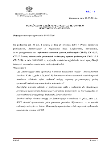 RBL - 5 2 REGIONALNA BAZA LOGISTYCZNA 04-470 470 Warszawa, ul. Marsa 110 Warszawa, dnia 18.03.2016 r. WYJAŚNIENIE NIENIE TRE TREŚCI CI SPECYFIKACJI ISTOTNYCH WARUNKÓW ZAMÓWIENIA Dotyczy: numer postępowania: powania: U/41/2016 Na podstawie art. 38 ust. 1 ustawy z dnia 29 stycznia 2004 r. Prawo zamówień zamówie publicznych, Zamawiający ący 2 Regionalna Baza Logistyczna Logistyczna, zawiadamia, że w postępowaniu na wykonania remontu cystern paliwowych CD-10; CD CN -33D, CN-27 27 D oraz odtworzenia sprawności sprawno ci technicznej cystern paliwowych CN CN-21 D i CD 7,5B), w dniu 10.03.2016 r., wpłynęły wnioski o wyjaśnienie śnienie treści treś specyfikacji istotnych warunków zamówienia następującej nast treści: Wniosek nr 1 Czy Zamawiający cy uzna spełnienie warunku posiadania wiedzy i doświadczenia do (rozdział V pkt. 1, ppkt. 1.2), jeżeli je eli Wykonawca w okresie ostatnich trzech lat przed terminem składania ofert, wykonał usługę usług naprawy przywracaj przywracającej pełną sprawność technicznąą samochodów autocystern? Zawężającc warunki udziału w postępowaniu post tylko i wyłącznie ącznie do okre określonego przedmiotu zamówienia Zamawiający Zamawiaj ogranicza konkurencję, ę, co jest niezgodne ze stanowiskiem Europejskiego Trybunału Sprawiedliwości Sprawiedliwo Zwrócić należyy również uwag uwagę, że Zamawiający w rozdziale V, pkt.1, ppkt 1.1. SIWZ określił lił uprawnienia, jakie powinien posiadać posiada Wykonawca, co w sposób całkowity zabezpiecza interes Zamawiającego Zamawiaj a jednocześnie nie zapewnia wykonania zamówienia zgodnie z SIWZ. RBL-5 Strona 1 Wniosek nr 2 Mając na uwadze postanowienia art. 38 ust. 1 ustawy z dnia 29 stycznia 2004 r. Prawo zamówień publicznych , zwanej dalej ustawą zwraca się z prośbą o wyjaśnienie zapisów rozdziału V ppkt. 1.1.1 SIWZ oraz sekcji iii.2.1 ogłoszenia o zamówienie. W podanych dokumentach określono warunek podmiotowy do art. 22 ust. 1 pkt. 1 ustawy w zakresie posiadania uprawnień do wykonywania usługi stanowiącej przedmiot zamówienia w sposób następujący; 1.1.1. posiada uprawnienia Wojskowego Dozoru Technicznego (WDT) do naprawy: a) zbiorników cystern do przewozu materiałów niebezpiecznych b) urządzeń do napełniania i opróżniania zbiorników transportowych c) urządzeń do napełniania uzbrojenie i sprzętu wojskowego W wymienionym zakresie w naszej ocenie brak jest określenia uprawnień do naprawy zbiorników stałych, określonych w §1 pkt. 1 lit. d rozporządzenia rady ministrów z dnia 7 grudnia 2012 r w sprawie rodzajów urządzeń technicznych podlegających dozorowi technicznemu (Dz. U. z 2012 r. poz. 1468), w odniesieniu do filtra dokładnego oczyszczenia w układzie węzła dystrybucyjnego. Zbiornik stały filtra dokładnego oczyszczanie podlega obsłudze (wymiana filtrów dokładnego oczyszczania), kontroli (rewizja wewnętrzna) i naprawie (odtworzenie powłok lakierniczych, naprawa spawalnicza ewentualnych uszkodzeń konstrukcji zbiornika) podobnie jak zbiornik cysterny. Co więcej zbiornik stały łącznie z rurociągiem dystrybutora poddawany jest próbie szczelności przy ciśnieniu 1,00 MPa (dla porównania zbiornik cysterny – 0,02 MPa) Jednoznaczną i decydującą podstawą do złożenia wniosku o zmianę zakresu uprawnień przez wykonawcę jest treść pism z Wojskowego Dozoru Technicznego, która precyzyjnie określa niezbędne uprawnienia jakie musi posiadać zakład do naprawy cystern paliwowych. Biorąc pod uwagę terminy ustawowe na składanie ofert wnoszę o niezwłoczne potwierdzenie obowiązku posiadania wymaganego uprawnienia i o pilna modyfikację opisanego warunku podmiotowego w SIWZ i ogłoszeniu o zamówienie stosownie do art. 38 ust. 4 a pkt. 2 ustawy. RBL-5 Strona 2 Ponadto pragnę zaznaczyć, że dokonanie modyfikacji w terminie do 18.03.2016 r. zgodnie z art. 12 ust. 2 pkt. 1 ustawy nie będzie wymagała wydłużenia terminu składania ofert. Na podstawie art. 38 ust.2 ustawy PZP, zamawiający informuje, iż udzielił wyjaśnienia: Odpowiedź nr 1: Zamawiający podtrzymuje zapisy SIWZ w przedmiocie sprawy. m Na obecnym etapie postępowania Zamawiający nie ma możliwości oceny czy „wykonanie usługi naprawy przywracającej pełną sprawność techniczną samochodów autocystern” uzna za spełnienie warunku wiedzy i doświadczenia oraz nie znajduje podstaw do dokonania interpretacji określonego przez siebie warunku wiedzy i doświadczenia przy tak sformułowanym pytaniu przez Wykonawcę Warunki udziału należy rozumieć literalnie z uwzględnieniem zawodowego charakteru konkretnego przedmiotu zamówienia. Odpowiedź nr 2: Zamawiający dokonał zmiany treści SIWZ w przedmiocie sprawy. Zamawiający informuje, iż w wyniku złożonych wyjaśnień treści SIWZ, nie przedłuża terminu składania ofert. KIEROWNIK ZAMAWIAJĄCEGO /-/ z up. mgr Elżbieta KALWASIŃSKA RBL-5 Strona 3
