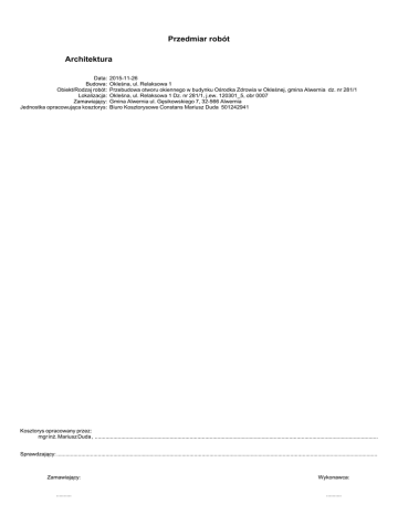 Przedmiar robót Architektura Data: Budowa: Obiekt/Rodzaj robót: Lokalizacja: Zamawiający: Jednostka opracowująca kosztorys: 2015-11-26 Okleśna, ul. Relaksowa 1 Przebudowa otworu okiennego w budynku Ośrodka Zdrowia w Okleśnej, gmina Alwernia dz. nr 281/1 Okleśna, ul. Relaksowa 1 Dz. nr 281/1, j.ew. 120301_5, obr 0007 Gmina Alwernia ul. Gęsikowskiego 7, 32-566 Alwernia Biuro Kosztorysowe Constans Mariusz Duda 501242941 Kosztorys opracowany przez: mgr inż. Mariusz Duda , ....................................................................................................................................................................................................... Sprawdzający: ................................................................................................................................................................................................................................ Zamawiający: Wykonawca: .......... .......... 1581Vcad v2 Zuzia10 (C) Datacomp 1994-2011(lic. 329) strona nr: 2 Przedmiar robót Podstawa nakładu, opis pozycji, wyliczenie ilości robót Ilość Krot. J.m. Architektura 1 Demontaże 1 KNRW 401/353/4 Wykucie z muru, ościeżnic okiennych( demontaż okna)- analogia 2 KNR 404/602/1 Burzenie murów z cegły na zaprawie cementowej przy użyciu młotów pneumatycznych, mury ponad terenem, wysokości do 4m, z cegły zwykłej 3 kalkulacja indywidualna:Załadunek i wywóz gruzu na wysypisko ( odległość do decyzji wykonawcy) wraz z opłatą za składowanie i utylizację 4 kalkulacja indywidualna:Przeniesienie istniejącego stojaka na rowery 5 kalkulacja indywidualna:Usunięcie kwietnika 1 szt 0,69 m3 0,69 1 1,4 m3 kpl m2 0,75 m2 0,75 m2 3,2 m2 1,50 m2 0,75 m2 0,75 m2 12,800 m2 12,800 4,8 m2 6,50 m3 8,200 m 8,400 1,3 m 2 Roboty budowlane 6 KNRW 202/904/1 Tynki cementowe kategorii III, wykonywane ręcznie, ściany płaskie i powierzchnie poziome (balkony, loggie) 7 KNRW 202/803/5 Tynki zwykłe wykonywane ręcznie, stropy i podciągi, kategoria II 8 KNRW 202/1040/1 Drzwi aluminiowe zewnętrzne- analogia 9 KNRW 202/830/3 Gładzie gipsowe, na ścianach z elementów prefabrykowanych i betonów wylewanych, 1-warstwowa 10 KNRW 202/1503/2 Malowanie zwykłe farbą klejową tynków wewnętrznych, ręcznie ściany 11 KNRW 202/1519/1 Malowanie tynków zewnętrznych w kolorze jak obecny kolor elewacji- analogia 12 KNR 231/101/1 Koryta wykonywane na całej szerokości jezdni i chodników, mechanicznie, grunt kategorii I-IV, na głębokości 20˙cm 7,5+5,3 = 12,800000 Ogółem: 12,800 13 KNR 231/101/2 Koryta wykonywane na całej szerokości jezdni i chodników, mechanicznie, grunt kategorii I-IV, dodatek za każde dalsze 5˙cm głębokości 14 KNRW 201/306/3 Wykopy wąskoprzestrzenne lub jamiste ze skarpami o szerokości dna do 1,5˙m ze złożeniem urobku na odkład, wykopy o głębokości do 1,5˙m, grunt kategorii IV pod słupki fundamentowe- analogia (0,5*0,5*1)*26 = 6,500000 Ogółem: 6,50 15 KNR 231/401/4 Rowki pod obrzeża 30x8˙cm, grunt kategorii III-IV- analogia 16 KNR 231/401/8 Rowki pod palisady 60˙cm, grunt kategorii III-IV- analogia 17 KNR 231/103/4 Profilowanie i zagęszczanie podłoża pod warstwy konstrukcyjne nawierzchni, mechanicznie, grunt kategorii I-IV 18 KNRW 201/312/2 (1) Zasypywanie wykopów liniowych o ścianach pionowych, głębokość wykopu do 1,5˙m, grunt kategorii III-IV, szerokość wykopu 0.8-1.5˙m 6,50-(0,2*0,2*1)*26 = 5,460000 Ogółem: 5 19 KNR 231/114/5 Podbudowy z kruszyw, tłuczeń, warstwa dolna, grubość warstwy po zagęszczeniu 15˙cm 20 KNR 231/114/6 Podbudowy z kruszyw, tłuczeń, warstwa dolna, dodatek za każdy dalszy 1˙cm grubości 21 KNR 231/105/7 Warstwy podsypkowe, podsypka cementowo-piaskowa, zagęszczenie mechaniczne, grubość warstwy po zagęszczeniu 3˙cm 22 KNR 231/302/1 Nawierzchnie z kostki brukowej kolor szary gr 6cm- analogia 23 KNR 231/302/1 Nawierzchnie z kostki brukowej kolor grafit gr 6cm- analogia 24 KNR 231/407/5 Obrzeża betonowe, 30x8˙cm na podsypce cementowo-piaskowej z wypełnieniem spoin zaprawą cementową 25 KNR 231/407/5 Palisady betonowe, 60˙cm na podsypce cementowo-piaskowej z wypełnieniem spoin zaprawą cementową- analogia 26 kalkulacja indywidualna:Załadunek i wywóz ziemi na wysypisko ( odległość do decyzji wykonawcy) wraz z opłatą za składowanie i utylizację 6,97+1,5 = 8,470000 Ogółem: 8,47 27 kalkulacja indywidualna:Dostawa i montaż- Prefabrykowane słupki fundamentowe 30x30c100cm z izolacją przeciwwilgociową 28 kalkulacja indywidualna:Dostawa i montaż- BALUSTRADA z ogranicznikiem 29 kalkulacja indywidualna:Dostawa i montaż- KRATA WCISKANA 12,800 m2 5 m3 12,800 m2 12,800 20 m2 12,800 m2 7,500 m2 5,300 m2 8,200 m 8,400 m 8,47 m3 26 64 35 kpl m m2 Architektura 1581Vcad v2 Zuzia10 (C) Datacomp 1994-2011(lic. 329) strona nr: 3 Podstawa nakładu, opis pozycji, wyliczenie ilości robót 30 KNR 205/207/2 Dostawa i montaż elementów z blachy stalowej i kształtowników łączonych na połączenia śrubowe- analogia 1,746+0,160 = 1,906000 Ogółem: 1,906 31 KNRW 712/105/1 Odtłuszczanie konstrukcje pełnościenne 56,55+10,5 = 67,050000 Ogółem: 67,05 32 KNRW 712/107/1 Czyszczenie strumieniowo - ścierne do trzeciego stopnia czystości stan wyjściowy powierzchni B konstrukcje pełnościenne 56,55+10,5 = 67,050000 Ogółem: 67,05 33 KNRW 712/205/1 (2) Malowanie pędzlem farby do gruntowania epoksydowe konstrukcje pełnościenne 56,55+10,5 = 67,050000 Ogółem: 67,05 34 KNRW 712/209/1 (1) Malowanie pędzlem farby nawierzchniowe i emalie olejne konstrukcje pełnościenne 56,55+10,5 = 67,050000 Ogółem: 67,05 Ilość Krot. J.m. 1,906 t 67,05 m2 67,05 m2 67,05 m2 67,05 m2 Tabela elementów scalonych Nazwa elementu 1 2 Wartość z narzutami Demontaże Roboty budowlane Architektura