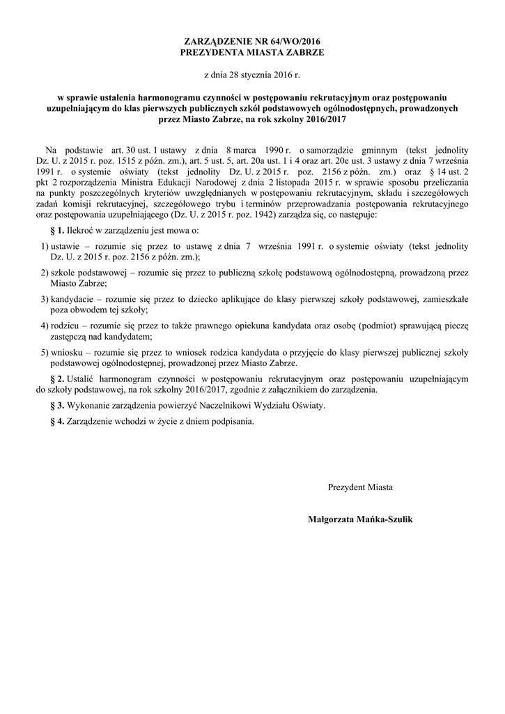 ZARZĄDZENIE NR 64/WO/2016 PREZYDENTA MIASTA ZABRZE z dnia 28 stycznia 2016 r. w sprawie ustalenia harmonogramu czynności w postępowaniu rekrutacyjnym oraz postępowaniu uzupełniającym do klas pierwszych publicznych szkół podstawowych ogólnodostępnych, prowadzonych przez Miasto Zabrze, na rok szkolny 2016/2017 Na podstawie art. 30 ust. 1 ustawy z dnia 8 marca 1990 r. o samorządzie gminnym (tekst jednolity Dz. U. z 2015 r. poz. 1515 z późn. zm.), art. 5 ust. 5, art. 20a ust. 1 i 4 oraz art. 20e ust. 3 ustawy z dnia 7 września 1991 r. o systemie oświaty (tekst jednolity Dz. U. z 2015 r. poz. 2156 z późn. zm.) oraz § 14 ust. 2 pkt 2 rozporządzenia Ministra Edukacji Narodowej z dnia 2 listopada 2015 r. w sprawie sposobu przeliczania na punkty poszczególnych kryteriów uwzględnianych w postępowaniu rekrutacyjnym, składu i szczegółowych zadań komisji rekrutacyjnej, szczegółowego trybu i terminów przeprowadzania postępowania rekrutacyjnego oraz postępowania uzupełniającego (Dz. U. z 2015 r. poz. 1942) zarządza się, co następuje: § 1. Ilekroć w zarządzeniu jest mowa o: 1) ustawie – rozumie się przez to ustawę z dnia 7 września 1991 r. o systemie oświaty (tekst jednolity Dz. U. z 2015 r. poz. 2156 z późn. zm.); 2) szkole podstawowej – rozumie się przez to publiczną szkołę podstawową ogólnodostępną, prowadzoną przez Miasto Zabrze; 3) kandydacie – rozumie się przez to dziecko aplikujące do klasy pierwszej szkoły podstawowej, zamieszkałe poza obwodem tej szkoły; 4) rodzicu – rozumie się przez to także prawnego opiekuna kandydata oraz osobę (podmiot) sprawującą pieczę zastępczą nad kandydatem; 5) wniosku – rozumie się przez to wniosek rodzica kandydata o przyjęcie do klasy pierwszej publicznej szkoły podstawowej ogólnodostępnej, prowadzonej przez Miasto Zabrze. § 2. Ustalić harmonogram czynności w postępowaniu rekrutacyjnym oraz postępowaniu uzupełniającym do szkoły podstawowej, na rok szkolny 2016/2017, zgodnie z załącznikiem do zarządzenia. § 3. Wykonanie zarządzenia powierzyć Naczelnikowi Wydziału Oświaty. § 4. Zarządzenie wchodzi w życie z dniem podpisania. Prezydent Miasta Małgorzata Mańka-Szulik Załącznik do Zarządzenia Nr 64/WO/2016 Prezydenta Miasta Zabrze z dnia 28 stycznia 2016 r. Harmonogram czynności w postępowaniu rekrutacyjnym oraz postępowaniu uzupełniającym do klas pierwszych szkół podstawowych, na rok szkolny 2016/2017 Rodzaj czynności Złożenie wniosku o przyjęcie do szkoły podstawowej wraz z dokumentami potwierdzającymi spełnianie przez kandydata kryteriów branych pod uwagę w postępowaniu rekrutacyjnym. Weryfikacja przez komisję rekrutacyjną wniosków o przyjęcie do szkoły podstawowej i dokumentów potwierdzających spełnianie przez kandydata kryteriów branych pod uwagę w postępowaniu rekrutacyjnym, w tym dokonanie przez przewodniczącego komisji rekrutacyjnej czynności, o których mowa w art. 20t ust. 7 ustawy. Podanie do publicznej wiadomości przez komisję rekrutacyjną listy kandydatów zakwalifikowanych i kandydatów niezakwalifikowanych. Potwierdzenie przez rodzica kandydata woli przyjęcia w postaci pisemnego oświadczenia. Podanie do publicznej wiadomości przez komisję rekrutacyjną listy kandydatów przyjętych i kandydatów nieprzyjętych. Termin w postępowaniu rekrutacyjnym Termin w postępowaniu uzupełniającym od 25 kwietnia do 9 maja 2016 r. od 14 do 16 czerwca 2016 r. od 10 do 16 maja 2016 r. od 17 do 21 czerwca 2016 r. 7 czerwca 2016 r. 11 lipca 2016 r. od 8 do 10 czerwca 2016 r. od 12 do 13 lipca 2016 r. 13 czerwca 2016 r. 14 lipca 2016 r.