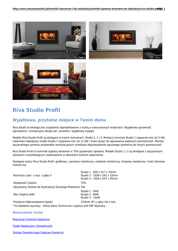 http://www.stovaxkominki.pl/kominki-nascienne-i-do-zabudowy/kominki-opalane-drewnem-do-zabudowy/riva-studio-profil/ Page 1 Riva Studio Profil Wyjątkowe, przytulne miejsce w Twoim domu Riva Studio to ekologiczne urządzenia zaprojektowane z myślą o nowoczesnych wnętrzach. Wyjątkowa sprawność ogrzewania i innowacyjny design jak i prostota i wyjątkowy wygląd. Modele Riva Studio Profil są dostępne w trzech rozmiarach: Studio 1, 2 i 3. Mniejszy kominek Studio 1 zapewnia moc do 5 kW, natomiast największy model Studio 3 zapewnia moc do 11 kW i może służyć do ogrzewania większych pomieszczeń. Montaż opcjonalnego systemu przewodów wentylacyjnych umożliwia doprowadzenie ogrzanego powietrza do innych pomieszczeń. Riva Studio Profil to kominek opalany drewnem o 75% sprawności spalania. Modele Studio 1 i 2 są dostępne z opcjonalnym zestawem umożliwiającym zastosowanie w obszarach kontroli zadymienia. Dostępne kolory Riva Studio Profil: grafitowy, czerwony metaliczny, niebieski metaliczny, brązowy metaliczny i kość słoniowa metaliczna. Rozmiary (szer. x wys. x głęb.)* Studio 1 - 839 x 517 x 33mm Studio 2 - 1039 x 542 x 33mm Studio 3 - 1426 x 547 x 45mm Wydajność Cieplna 75% Opcjonalny Zestaw do Dystrybucji Gorącego Powietrza Tak Moc Cieplna (kW) Studio 1 - 5kW Studio 2 - 8kW Studio 3 - 11kW Przyłącze Odprowadzania Spalin 153mm (6") z góry lub z tyłu * Po dokładne wymiary - kliknij Dane Techniczne i wybierz plik PDF Wymiary. Nowoczesne Cechy Regulacja Ciśnienia Dopalacza Ciepło Radiacyjne i Konwekcyjne Zestaw Zewnętrznego Dopływu Powietrza http://www.stovaxkominki.pl/kominki-nascienne-i-do-zabudowy/kominki-opalane-drewnem-do-zabudowy/riva-studio-profil/ Page 2