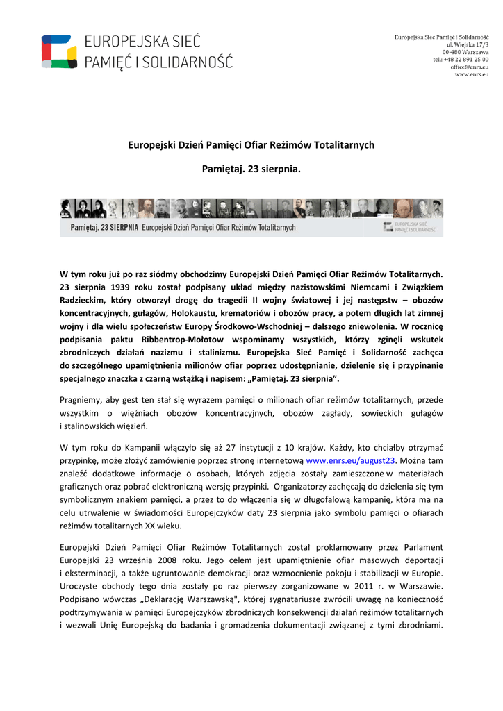 Europejski Dzień Pamięci Ofiar Reżimów Totalitarnych Pamiętaj. 23 sierpnia. W tym roku już po raz siódmy obchodzimy Europejski Dzień Pamięci Ofiar Reżimów Totalitarnych. Totalitarnych 23 sierpnia 1939 roku został podpisany układ między nazistowskimi Niemcami i Związkiem Radzieckim, który otworzył drogę do tragedii II wojny światowej i jej następstw – obozów koncentracyjnych, gułagów, Holokaustu, krematoriów i obozów pracy, a potem długich dług lat zimnej wojny i dla wielu społeczeństw Europy Środkowo-Wschodniej Środkowo – dalszego szego zniewolenia. zniewoleni W rocznicę podpisania sania paktu Ribbentrop-Mołotow Ribbentrop wspominamy wszystkich, którzy zginęli wskutek zbrodniczych działań nazizmu i stalinizmu. Europejska Sieć Pamięć i Solidarność zachęca do szczególnego upamiętnienia milionów ofiar poprzez udostępnianie, dzielenie się i przypinanie specjalnego znaczka z czarną wstążką i napisem: „Pamiętaj. 23 sierpnia”. Pragniemy, aby gest ten stał się wyrazem pamięci o milionach ach ofiar reżimów totalitarnych, przede wszystkim o więźniach obozów koncentracyjnych, koncentracyjnych, obozów zagłady, sowieckich gułagów i stalinowskich więzień. W tym roku do Kampanii włączyło się aż 27 instytucji z 10 krajów. Każdy, kto chciałby otrzymać przypinkę, może złożyć zamówienie poprzez stronę internetową www.enrs.eu/august23. www.enrs.eu/august23 Można tam znaleźć dodatkowe informacje o osobach, których zdjęcia zostały zamieszczone w materiałach graficznych oraz pobrać elektroniczną wersję przypinki. przypinki Organizatorzy zachęcają do dzielenia się tym symbolicznym znakiem pamięci, a przez to do włączenia się w długofalową kampanię, która ma na celu utrwalenie w świadomości Europejczyków daty 23 sierpnia jako symbolu pamięci o ofiarach reżimów totalitarnych XX wieku.. Europejski Dzień Pamięci amięci Ofiar Reżimów Totalitarnych został proklamowany przez Parlament Europejski 23 września 2008 roku. Jego celem jest upamiętnienie ofiar masowych masow deportacji i eksterminacji, a także ugruntowanie demokracji oraz wzmocnienie pokoju i stabilizacji w Europie. Euro Uroczyste obchody tego dnia zostały po raz pierwszy zorganizowane w 2011 r. w Warszawie. Podpisano wówczas „Deklarację Deklarację Warszawską", Warszawską" której sygnatariusze zwrócili uwagę na konieczność podtrzymywania wania w pamięci Europejczyków zbrodniczych konsekwencji działań ałań reżimów totalitarnych i wezwali Unię Europejską do badania i gromadzenia dokumentacji związanej z tymi zbrodniami. W kolejnych latach uroczystości z udziałem ministrów sprawiedliwości państw unijnych odbywały się na Węgrzech, Litwie, Łotwie i Estonii. Estonii Partnerzy: Archiwum Centrum Dokumentacji Zsyłek, Wypędzeń i Przesiedleń Uniwersytetu Pedagogicznego w Krakowie; Krakowie Austriackie Centrum Edukacji Obywatelskiej w Szkołach (Zentrum polis - Politik Lernen in der Schule); Schule) Centralne Muzeum Jeńców Wojennych w Łambinowicach; Łambi Centrum Badania Ludobójstwa i Ruchu Oporu Mieszkańców Litwy (Lietuvos gyventojų genocido ir rezistencijos tyrimų centro); centro) Centrum Pamięci Holocaustu w Budapeszcie (Holokauszt Emlékközpont); Dom Spotkań z Historią; Historią Europejskie Centrum Solidarności; Fundacja Ośrodka KARTA; Fundacja Unitas w Tallinie (Unitas Foundation); Foundation) Fundusz Haseda Szpiry w Użhorodzie (Хэсэд ( Шпира); Instytut Badania Zbrodni Komunistycznych i Pamięci Wpędzeń Rumuńskich w Bukareszcie (Institutul de Investigare a Crimelor Comunismului ismului și Memoria Exilului Românesc); Instytut Ludwiga Boltzmanna w Wiedniu (Ludwig Boltzmann Institut für Menschenrechte); Menschenrechte) Instytut Pamięci Narodowej na Słowacji (Ústav pamäti národa); Instytut Pamięci Narodowej na Ukrainie (Український ( інститут національної ьної пам'яті); пам'яті Instytut Pamięci Narodowej w Polsce; Instytut Pamięci Narodowej na Węgrzech (Nemzeti (Nemzeti Emlékezet Bizottsága); Bizottsága Instytut Słowacki w Warszawie; Instytut Studiów Reżimów Totalitarnych w Pradze (Ústav pro studium totalitních režimů); Komitet Pamięcii Gułagu w Budapeszcie (Gulág Emlékbizottság); Międzynarodowe Centrum Kultury w Krakowie; Muzeum Historii Żydów Polskich; Polskich Muzeum „Żydzi na Łotwie” w Rydze (Muzejs “Ebreji Latvijā”); Muzeum Okupacji Łotwy w Rydze (Latvijas Okupācijas muzejs); muzejs Muzeum Ofiar Ludobójstwa w Wilnie (Genocido muziejus aukų); Muzeum Powstania Warszawskiego; Warszawskiego Muzeum Stutthof w Sztutowie; Sztutowie Organizacja Post Bellum w Pradze; Państwowe twowe Museum Auschwitz-Birkenau; Auschwitz Rumuński Instytut Kultury w Polsce; Rumuńskie Archiwum Państwowe (Arhivele Arhivele Naţionale ale României), României), Węgierskie Stowarzyszenie Harcerskie (Magyar Cserkészszövetség). Europejska Sieć Pamięć i Solidarność (ESPS) jest międzynarodowym przedsięwzięciem, które ma na celu badanie, dokumentowanie oraz upowszechnianie wiedzy na temat historii Europy XX wieku i sposobów jej upamiętniania ze szczególnym uwzględnieniem okresu dyktatur, wojen i społecznego sprzeciwu wobec zniewolenia. Członkami Sieci są: Niemcy, Polska, Słowacja, Węgry oraz Rumunia. Status obserwatora mają Austria, Łotwa, Czechy i Albania. Więcej: www.enrs.eu. Kontakt dla mediów: Joanna Orłoś Public Relations and Media Consultant European Network Remembrance and Solidarity Tel. (+48-22) 891 25 00 Mail: [email protected]