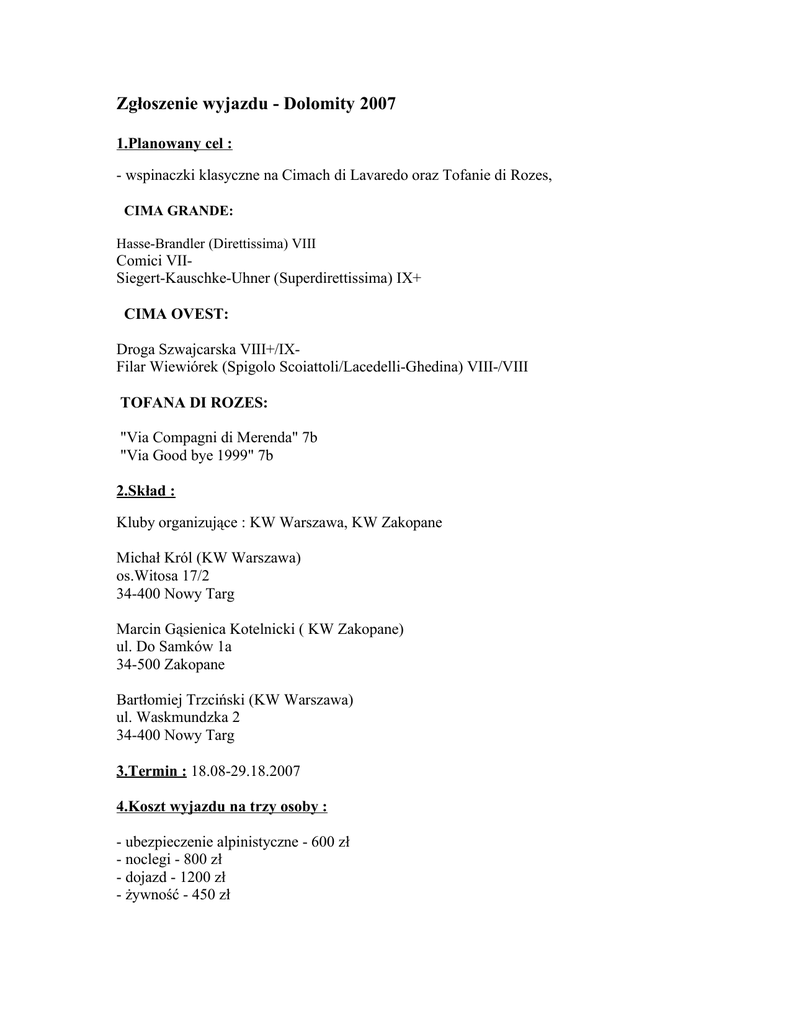 Zgłoszenie wyjazdu - Dolomity 2007 1.Planowany cel : - wspinaczki klasyczne na Cimach di Lavaredo oraz Tofanie di Rozes, CIMA GRANDE: Hasse-Brandler (Direttissima) VIII Comici VIISiegert-Kauschke-Uhner (Superdirettissima) IX+ CIMA OVEST: Droga Szwajcarska VIII+/IXFilar Wiewiórek (Spigolo Scoiattoli/Lacedelli-Ghedina) VIII-/VIII TOFANA DI ROZES: "Via Compagni di Merenda" 7b "Via Good bye 1999" 7b 2.Skład : Kluby organizujące : KW Warszawa, KW Zakopane Michał Król (KW Warszawa) os.Witosa 17/2 34-400 Nowy Targ Marcin Gąsienica Kotelnicki ( KW Zakopane) ul. Do Samków 1a 34-500 Zakopane Bartłomiej Trzciński (KW Warszawa) ul. Waskmundzka 2 34-400 Nowy Targ 3.Termin : 18.08-29.18.2007 4.Koszt wyjazdu na trzy osoby : - ubezpieczenie alpinistyczne - 600 zł - noclegi - 800 zł - dojazd - 1200 zł - żywność - 450 zł 5.Całkowity koszt : 3050 zł Warunki finansowania : - poza dofinansowaniem PZA , wyjazd dofinansowany będzie ze środków prywatnych. 6.Informacje o otrzymaniu w przeszłości dofinansowania z PZA : Michał Król : - Dolina Miyar, Indie 2005 - wytyczenie nowej drogi klasycznej na Lotos Peak 5630m Michał Król, Dawid Kaszlikowski (KW Warszawa), - Dolina Gastein, Austria 2006 - drogi lodowe - Michał Król, Marek Żołądek (KW Warszawa) - Dolina Romsdal, Norwegia 2006 - próba wytyczenia nowej drogi lodowej - Marcin Tomaszewski (KW Szczecin), Michał Król (KW Warszawa) - Grupa Młodzieżowa, Alpy 2006 - Stanisław Piecuch (KW Szczecin), Michał Król (KW Warszawa), Przemek Wójcik (KW Zakopane) - Dolina Miyar 2006 - wytyczenie nowych dróg na Geruda Peak oraz Tama Donog Michał Król (KW Warszawa), Przemek Wójcik (KW Zakopane)