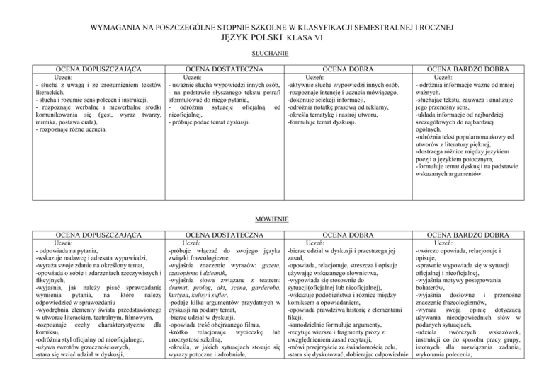 WYMAGANIA NA POSZCZEGÓLNE STOPNIE SZKOLNE W KLASYFIKACJI SEMESTRALNEJ I ROCZNEJ JĘZYK POLSKI KLASA VI SŁUCHANIE OCENA DOPUSZCZAJĄCA OCENA DOSTATECZNA Uczeń: - słucha z uwagą i ze zrozumieniem tekstów literackich, - słucha i rozumie sens poleceń i instrukcji, - rozpoznaje werbalne i niewerbalne środki komunikowania się (gest, wyraz twarzy, mimika, postawa ciała), - rozpoznaje różne uczucia. Uczeń: - uważnie słucha wypowiedzi innych osób, - na podstawie słyszanego tekstu potrafi sformułować do niego pytania, - odróżnia sytuację oficjalną od nieoficjalnej, - próbuje podać temat dyskusji. OCENA DOBRA Uczeń: -aktywnie słucha wypowiedzi innych osób, -rozpoznaje intencję i uczucia mówiącego, -dokonuje selekcji informacji, -odróżnia notatkę prasową od reklamy, -określa tematykę i nastrój utworu, -formułuje temat dyskusji. OCENA BARDZO DOBRA Uczeń: - odróżnia informacje ważne od mniej ważnych. -słuchając tekstu, zauważa i analizuje jego przenośny sens, -układa informacje od najbardziej szczegółowych do najbardziej ogólnych, -odróżnia tekst popularnonaukowy od utworów z literatury pięknej, -dostrzega różnice między językiem poezji a językiem potocznym, -formułuje temat dyskusji na podstawie wskazanych argumentów. MÓWIENIE OCENA DOPUSZCZAJĄCA OCENA DOSTATECZNA OCENA DOBRA OCENA BARDZO DOBRA Uczeń: - odpowiada na pytania, -wskazuje nadawcę i adresata wypowiedzi, -wyraża swoje zdanie na określony temat, -opowiada o sobie i zdarzeniach rzeczywistych i fikcyjnych, -wyjaśnia, jak należy pisać sprawozdanie wymienia pytania, na które należy odpowiedzieć w sprawozdaniu -wyodrębnia elementy świata przedstawionego w utworze literackim, teatralnym, filmowym, -rozpoznaje cechy charakterystyczne dla komiksu, -odróżnia styl oficjalny od nieoficjalnego, -używa zwrotów grzecznościowych, -stara się wziąć udział w dyskusji, Uczeń: -próbuje włączać do swojego języka związki frazeologiczne, -wyjaśnia znaczenie wyrazów: gazeta, czasopismo i dziennik, -wyjaśnia słowa związane z teatrem: dramat, prolog, akt, scena, garderoba, kurtyna, kulisy i sufler, -podaje kilka argumentów przydatnych w dyskusji na podany temat, -bierze udział w dyskusji, -opowiada treść obejrzanego filmu, -krótko relacjonuje wycieczkę lub uroczystość szkolną, -określa, w jakich sytuacjach stosuje się wyrazy potoczne i zdrobniałe, Uczeń: -bierze udział w dyskusji i przestrzega jej zasad, -opowiada, relacjonuje, streszcza i opisuje używając wskazanego słownictwa, -wypowiada się stosownie do sytuacji(oficjalnej lub nieoficjalnej), -wskazuje podobieństwa i różnice między komiksem a opowiadaniem, -opowiada prawdziwą historię z elementami fikcji, -samodzielnie formułuje argumenty, -recytuje wiersze i fragmenty prozy z uwzględnieniem zasad recytacji, -mówi przejrzyście ze świadomością celu, -stara się dyskutować, dobierając odpowiednie Uczeń: -twórczo opowiada, relacjonuje i opisuje, -sprawnie wypowiada się w sytuacji oficjalnej i nieoficjalnej, -wyjaśnia motywy postępowania bohaterów, -wyjaśnia dosłowne i przenośne znaczenie frazeologizmów, -wyraża swoją opinię dotyczącą używania nieodpowiednich słów w podanych sytuacjach, -udziela twórczych wskazówek, instrukcji co do sposobu pracy grupy, istotnych dla rozwiązania zadania, wykonania polecenia, -wskazuje nadawcę i odbiorcę wypowiedzi, -wyjaśnia słownictwo związane z internetem (email, portal społecznościowy, chat, blog, forum dyskusyjne), -przedstawia różne sposoby porozumiewania się ze znajomymi na odległość, -tłumaczy, czym jest reklama, -wymienia cechy reklamy, -identyfikuje nadawcę i adresata SMS-a, a także podaje informacje zawarte w wiadomości oraz określa, w jakim celu została ona napisana, -opowiada treść utworu literackiego, obejrzanego filmu i wysłuchanego słuchowiska radiowego, -nazywa cechy, opisując przedmioty, krajobraz, postać, -podejmuje próbę sformułowania argumentów, -wygłasza z pamięci krótkie fragmenty utworów. -wygłasza z pamięci wierszy i fragmenty prozy, -wypowiada się głośno, wyraźnie zwraca się do odbiorcy, -odpowiednio intonuje i akcentuje wyrazy, -stara się wygłosić przemówienie na forum klasy, -w czasie mówienia stara się nawiązać kontakt z odbiorcą. -wyjaśnia słownictwo związane z internetem (komunikator, post, netykieta), -wymienia zasady kulturalnego zachowania w internecie, -wskazuje, jakie mogą być skutki zbyt częstego korzystania z urządzeń multimedialnych, -wymienia informacje, które powinna zawierać notatka prasowa, -wyjaśnia reguły komunikowania się na forum internetowym, -wskazuje różnice między e-mailem a listem, -wskazuje sformułowania typowe dla reklamy, -tłumaczy, jaki efekt wywołują wskazane elementy reklamy, -wskazuje różnice między listem oficjalnym a prywatnym, -wskazuje cel pisania sprawozdania i listu oficjalnego, -wskazuje sformułowania, których nie należy używać w liście oficjalnym, -wygłasza przemówienie przygotowane według planu, -wymienia zasady dotyczące przemawiania -na podstawie przeczytanego tekstu opowiada o sposobach przekazywania informacji, -wymienia rodzaje prasy ze względu na częstotliwość wydawania, -omawia różnorodną tematykę czasopism i wskazuje czytelników, do których skierowane wybrane tytuły, -odróżnia osobę mówiącą i narratora od argumenty, -argumentuje, odwołując się do doświadczeń własnych lub przeczytanego utworu, obejrzanego filmu, -wyraża swoje odczucia i refleksje, -wygłasza przemówienie przygotowane według planu -w trakcie przemawiania nawiązuje kontakt z odbiorcą, -tłumaczy, na czym polega reklama społeczna, -reklamuje dowolny produkt, -odróżnia pojęcie fikcji literackiej od rzeczywistości, -ocenia bohaterów literackich, -opowiada o uczuciach związanych z przeczytaną lekturą, -wyjaśnia, czym są mass media, -wskazuje cechy charakterystyczne przekazów audio