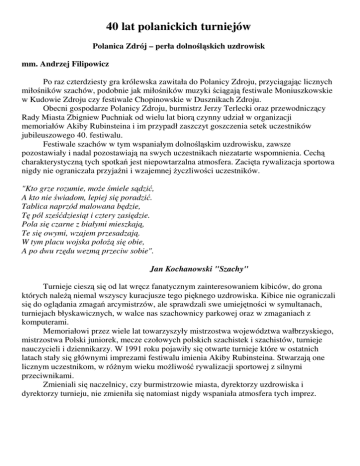 40 lat polanickich turniejów Polanica Zdrój – perła dolno l skich uzdrowisk mm. Andrzej Filipowicz Po raz czterdziesty gra królewska zawitała do Polanicy Zdroju, przyci gaj c licznych miło ników szachów, podobnie jak miło ników muzyki ci gaj festiwale Moniuszkowskie w Kudowie Zdroju czy festiwale Chopinowskie w Dusznikach Zdroju. Obecni gospodarze Polanicy Zdroju, burmistrz Jerzy Terlecki oraz przewodnicz cy Rady Miasta Zbigniew Puchniak od wielu lat bior czynny udział w organizacji memoriałów Akiby Rubinsteina i im przypadł zaszczyt goszczenia setek uczestników jubileuszowego 40. festiwalu. Festiwale szachów w tym wspaniałym dolno l skim uzdrowisku, zawsze pozostawiały i nadal pozostawiaj na swych uczestnikach niezatarte wspomnienia. Cech charakterystyczn tych spotka jest niepowtarzalna atmosfera. Zaci ta rywalizacja sportowa nigdy nie ograniczała przyja ni i wzajemnej yczliwo ci uczestników. "Kto grze rozumie, mo e miele s dzi , A kto nie wiadom, lepiej si poradzi . Tablica naprzód malowana b dzie, T pól sze dziesi t i cztery zasi dzie. Pola si czarne z białymi mieszkaj , Te si owymi, wzajem przesadzaj . W tym placu wojska poło si obie, A po dwu rz du wezm przeciw sobie". Jan Kochanowski "Szachy" Turnieje ciesz si od lat wr cz fanatycznym zainteresowaniem kibiców, do grona których nale niemal wszyscy kuracjusze tego pi knego uzdrowiska. Kibice nie ograniczali si do ogl dania zmaga arcymistrzów, ale sprawdzali swe umiej tno ci w symultanach, turniejach błyskawicznych, w walce nas szachownicy parkowej oraz w zmaganiach z komputerami. Memoriałowi przez wiele lat towarzyszyły mistrzostwa województwa wałbrzyskiego, mistrzostwa Polski juniorek, mecze czołowych polskich szachistek i szachistów, turnieje nauczycieli i dziennikarzy. W 1991 roku pojawiły si otwarte turnieje które w ostatnich latach stały si głównymi imprezami festiwalu imienia Akiby Rubinsteina. Stwarzaj one licznym uczestnikom, w ró nym wieku mo liwo rywalizacji sportowej z silnymi przeciwnikami. Zmieniali si naczelnicy, czy burmistrzowie miasta, dyrektorzy uzdrowiska i dyrektorzy turnieju, nie zmieniła si natomiast nigdy wspaniała atmosfera tych imprez. Arcymistrz Akiba Rubinstein Akiba Rubinstein zalicza si do klasyków królewskiej gry, a jego imi jest zapisane złotymi zgłoskami w historii rozwoju my li szachowej. Twórczo Rubinsteina, jego wspaniałe partie, czy przykłady gry ko cowej studiuj coraz to nowe pokolenia miło ników muzy szachów Caissy. Max Euwe, mistrz wiata w latach 1935-1937 oraz prezydent FIDE w latach 19701978, podczas pobytu w Polanicy w 1967 r. powiedział: "Gdy byłem małym chłopcem, Rubinstein był dla mnie wzorem... Rubinstein był wi cej, ani eli zdolnym i silnym szachist . Był jednym z najzdolniejszych architektów, buduj cych wi tyni szachow . Jego badania na polu szachowym były o wiele gł bsze, ni jego poprzedników. Jego tezy s obowi zuj ce równie dla jego nast pców. Rubinstein jest ojcem współczesnej gry pozycyjnej. Bez Rubinsteina nie byłoby Flohra, Euwego, Smysłowa..." Mistrzem wiata niestety nie został. Nie było mu dane, wskutek zbiegu ró nych okoliczno ci, przyst pi do meczu o mistrzostwo wiata. Nie zostawił te po sobie podr czników, czy ksi ek ze zbiorami wybranych partii. Jego partie komentowali inni szachi ci, zafascynowani gł bi idei rubinsteinowskich, czy te jego wirtuozeri rozgrywania ko cówek. To najwi kszy mistrz gry ko cowej! - pisał o Rubinsteinie, słynny wiede ski arcymistrz Rudolf Spielmann. Akiba Rubinstein, urodzony 12 X 1882 r. w Stawiskach, w pobli u Łom y, był dwunastym dzieckiem w biednej rodzinie ydowskiej. W szkole rabinackiej, w pi tnastym roku ycia wpadł mu w r ce, napisany po hebrajsku, podr cznik szachowy legendarnego Kalabryjczyka Greco. Ten przypadkowy zbieg okoliczno ci zmienił jego całe ycie. Królewska gra pochłon ła go całkowicie i wszystko inne przestało mie jakiekolwiek znaczenie. Małomówny, zamkni ty w sobie Rubinstein, całkowicie odizolowany od spraw zewn trznego wiata, w latach pó niejszych na pytanie jak sp dza czas - odpowiadał całkiem serio: 300 dni w roku pracuj nad szachami po 6 godzin dziennie, 60 dni po wi cam na turnieje szachowe, a 5 dni odpoczywam. Bezgraniczne zamiłowanie do szachów i ta tytaniczna wprost praca szybko przyniosły efekty. Pierwsze kroki szachowe stawia w Białymstoku, ale ju w 1901 r. udaje si do Łodzi, jednego z najsilniejszych o rodków my li szachowej, nie tylko na ziemi polskiej, ale w całej carskiej Rosji. Tam mieszka przez wiele lat i tam przychodz jego pierwsze sukcesy, w zało onym w 1903 r. Łódzkim Towarzystwie Zwolenników Gry Szachowej. Remis 5-5 i wygranie drugiego meczu 6-3, ze słynnym łódzkim mistrzem Henrykiem Salwe, w 1903 r., daj młodemu adeptowi sztuki szachowej awans do elity miasta. Dzi ki temu wyje d a w 1904 r. na ogólno rosyjski turniej do Kijowa, gdzie zdobywa V nagrod za Czigorinem, Bernsteinem, Jurowiczem i Salwe. Rok pó niej debiutuje na arenie mi dzynarodowej, dziel c I-II nagrod w mistrzowskim turnieju w Barmen w 1905 r., co uprawnia go do otrzymywania zaprosze na wielkie imprezy szachowe. W 1907 roku Rubinstein wygrywa ju trzy turnieje mi dzynarodowe i nast pnie przychodzi złoty rok rubinsteinowski - 1912. Nasz arcymistrz pi ciokrotnie zdobywa pierwsz nagrod . Triumfował wtedy w San Sebastian, Piszczanach, Wrocławiu (wspólnie z Durasem), Warszawie i Wilnie. Wygrał w tych miastach z Alechinem, Nimzowitschem, Tarraschem i cał plejad innych arcymistrzów szachownicy. Stał si wtedy pierwszym pretendentem do korony szachowej i wszystko wskazywało na to, e musi doj do jego meczu z ówczesnym mistrzem wiata Emanuelem Laskerem, któremu przesłał wyzwanie. Dr Lasker, matematyk i fizyk, wypowiadał si z du ym uznaniem o grze swojego potencjalnego przeciwnika, podnosz c widoczne walory jego osobowo ci - obok du ej erudycji i elaznego charakteru - znamiona prawdziwego my liciela. Jednak e przedłu ał pertrakt