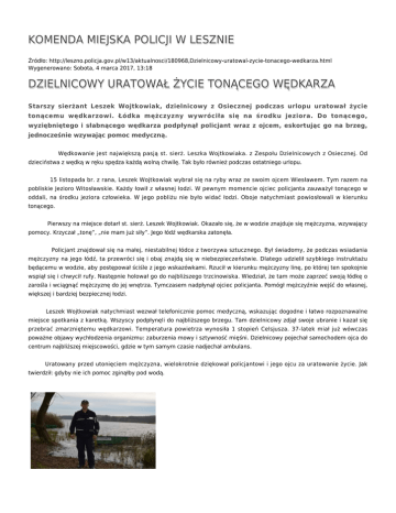 KOMENDA MIEJSKA POLICJI W LESZNIE Źródło: http://leszno.policja.gov.pl/w13/aktualnosci/180968,Dzielnicowy-uratowal-zycie-tonacego-wedkarza.html Wygenerowano: Sobota, 4 marca 2017, 13:18 DZIELNICOWY URATOWAŁ ŻYCIE TONĄCEGO WĘDKARZA Starszy sierżant Leszek Wojtkowiak, dzielnicowy z Osiecznej podczas urlopu uratował życie tonącemu wędkarzowi. Łódka mężczyzny wywróciła się na środku jeziora. Do tonącego, wyziębniętego i słabnącego wędkarza podpłynął policjant wraz z ojcem, eskortując go na brzeg, jednocześnie wzywając pomoc medyczną. Wędkowanie jest największą pasją st. sierż. Leszka Wojtkowiaka. z Zespołu Dzielnicowych z Osiecznej. Od dzieciństwa z wędką w ręku spędza każdą wolną chwilę. Tak było również podczas ostatniego urlopu. 15 listopada br. z rana, Leszek Wojtkowiak wybrał się na ryby wraz ze swoim ojcem Wiesławem. Tym razem na pobliskie Jezioro Witosławskie. Każdy łowił z własnej łodzi. W pewnym momencie ojciec policjanta zauważył tonącego w oddali, na środku jeziora człowieka. W jego pobliżu nie było widać łodzi. Oboje natychmiast powiosłowali w kierunku tonącego. Pierwszy na miejsce dotarł st. sierż. Leszek Wojtkowiak. Okazało się, że w wodzie znajduje się mężczyzna, wzywający pomocy. Krzyczał „tonę”, „nie mam już siły”. Jego łódź wędkarska zatonęła. Policjant znajdował się na małej, niestabilnej łódce z tworzywa sztucznego. Był świadomy, że podczas wsiadania mężczyzny na jego łódź, ta przewróci się i obaj znajdą się w niebezpieczeństwie. Dlatego udzielił szybkiego instruktażu będącemu w wodzie, aby postępował ściśle z jego wskazówkami. Rzucił w kierunku mężczyzny linę, po której ten spokojnie wspiął się i chwycił rufy. Następnie holował go do najbliższego trzcinowiska. Wiedział, że tam może zaprzeć swoją łódkę o zarośla i wciągnąć mężczyznę do jej wnętrza. Tymczasem nadpłynął ojciec policjanta. Pomógł mężczyźnie wejść do własnej, większej i bardziej bezpiecznej łodzi. Leszek Wojtkowiak natychmiast wezwał telefonicznie pomoc medyczną, wskazując dogodne i łatwo rozpoznawalne miejsce spotkania z karetką. Wszyscy podpłynęli do najbliższego brzegu. Tam dzielnicowy zdjął swoje ubranie i kazał się przebrać zmarzniętemu wędkarzowi. Temperatura powietrza wynosiła 1 stopień Celsjusza. 37-latek miał już wówczas poważne objawy wychłodzenia organizmu: zaburzenia mowy i sztywność mięśni. Dzielnicowy pojechał samochodem ojca do centrum najbliższej miejscowości, gdzie w tym samym czasie nadjechał ambulans. Uratowany przed utonięciem mężczyzna, wielokrotnie dziękował policjantowi i jego ojcu za uratowanie życie. Jak twierdził: gdyby nie ich pomoc zginąłby pod wodą. Ocena: 0/5 (0) Tweetnij