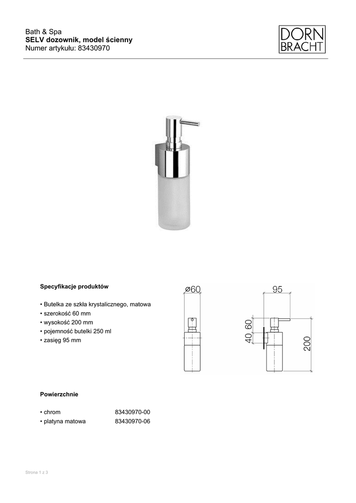 Bath & Spa SELV dozownik, model ścienny Numer artykułu: 83430970 Specyfikacje produktów • Butelka ze szkła krystalicznego, matowa • szerokość 60 mm • wysokość 200 mm • pojemność butelki 250 ml • zasięg 95 mm Powierzchnie • chrom • platyna matowa Strona 1 z 3 83430970-00 83430970-06 Bath & Spa SELV dozownik, model ścienny Numer artykułu: 83430970 Rysunek w rozłożeniu na części Strona 2 z 3 Bath & Spa SELV dozownik, model ścienny Numer artykułu: 83430970 Zamawiana ilość Nr Numer artykułu Nazwa 1 05101050001ff dispenser 1 2 08101049990 hose 1 3 90101052500ff base 1 4 08900400182 glass 1 5 09303009390 screw 1 6 0530310250090 fixing set 1 7 081010530ff holder 1 Strona 3 z 3 Montowana ilość