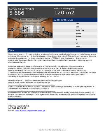 Poznań, Winogrady LOKAL na WYNAJEM 120 m2 5 686 1228/4045/OLW 120 132 5 686 PLN 47 PLN 21 PLN B 12 2002 Opis Biuro open space + 2 małe pokoje z aneksem kuchennym w budynku biurowym zlokalizowanym w dzielnicy Winogrady przy jednej z głównych dróg komunikacyjnych Poznania, co zapewnia dogodne połączenie zarówno z centrum miasta (tramwaj „PESTKA”) oraz lotniskiem i dojazdem do autostrady Warszawa-Berlin. W części handlowej budynku placówki bankowe, oddziały agencji ubezpieczeniowych. Budynek wykonany przy zastosowaniu wysokiej jakości materiałów, klimatyzowany, z podwieszanymi sufitami, okablowanie strukturalne w kat. 5, światłowód i operatorzy telekomunikacyjni w budynku; recepcja dla najemców; całodobowa ochrona, monitoring. Zmodernizowane powierzchnie socjalne zlokalizowane są w częściach wspólnych budynku. Istnieje możliwość wykorzystania powierzchni biurowych zarówno w systemie open space jak i zamkniętych gabinetów. Dostępne moduły już od 100 m2. Do ceny najmu 11 EUR /m2 dochodzą koszty eksploatacyjne. Więcej ofert znajdą Państwo na: vanderhaus.pl _____________________________________________________ Agencja VanDer Haus Nieruchomości zapewnia pełną obsługę transakcji oraz bezpłatną pomoc w zakresie finansowania zakupu nieruchomości! _____________________________________________________ Przedstawiona oferta ma charakter informacyjny i nie stanowi oferty handlowej w rozumieniu Art. 66 par.1 Kodeksu Cywilnego. Treść ogłoszenia oparta na informacjach podanych przez właściciela nieruchomości. Marta Ładecka tel. 502 10 70 10 email: [email protected] VanDer Haus Nieruchomości Sp. z o.o. Powered by TCPDF (www.tcpdf.org)