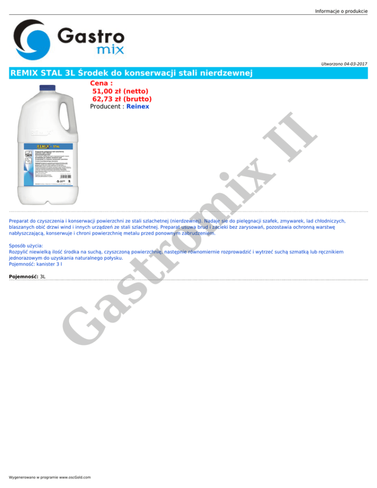 Informacje o produkcie Utworzono 04-03-2017 REMIX STAL 3L Środek do konserwacji stali nierdzewnej Cena : 51,00 zł (netto) 62,73 zł (brutto) m ix II Producent : Reinex tr o Preparat do czyszczenia i konserwacji powierzchni ze stali szlachetnej (nierdzewnej). Nadaje sie do pielęgnacji szafek, zmywarek, lad chłodniczych, blaszanych obić drzwi wind i innych urządzeń ze stali szlachetnej. Preparat usuwa brud i zacieki bez zarysowań, pozostawia ochronną warstwę nabłyszczającą, konserwuje i chroni powierzchnię metalu przed ponownym zabrudzeniem. Sposób użycia: Rozpylić niewielką ilość środka na suchą, czyszczoną powierzchnię, następnie równomiernie rozprowadzić i wytrzeć suchą szmatką lub ręcznikiem jednorazowym do uzyskania naturalnego połysku. Pojemność: kanister 3 l G as Pojemność: 3L Wygenerowano w programie www.oscGold.com