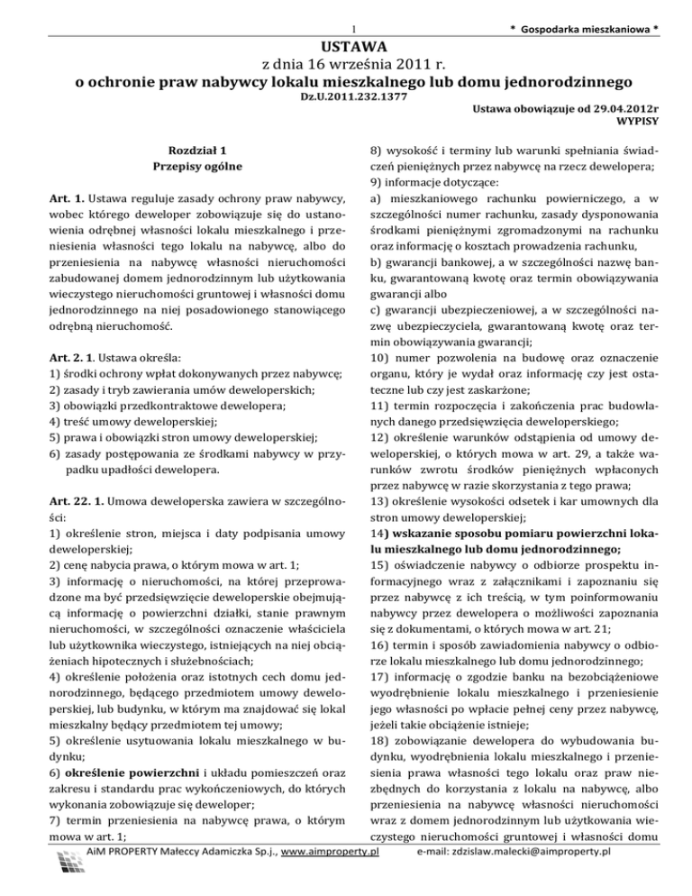 * Gospodarka mieszkaniowa * 1 USTAWA z dnia 16 września 2011 r. o ochronie praw nabywcy lokalu mieszkalnego lub domu jednorodzinnego Dz.U.2011.232.1377 Rozdział 1 Przepisy ogólne Art. 1. Ustawa reguluje zasady ochrony praw nabywcy, wobec którego deweloper zobowiązuje się do ustanowienia odrębnej własności lokalu mieszkalnego i przeniesienia własności tego lokalu na nabywcę, albo do przeniesienia na nabywcę własności nieruchomości zabudowanej domem jednorodzinnym lub użytkowania wieczystego nieruchomości gruntowej i własności domu jednorodzinnego na niej posadowionego stanowiącego odrębną nieruchomość. Art. 2. 1. Ustawa określa: 1) środki ochrony wpłat dokonywanych przez nabywcę; 2) zasady i tryb zawierania umów deweloperskich; 3) obowiązki przedkontraktowe dewelopera; 4) treść umowy deweloperskiej; 5) prawa i obowiązki stron umowy deweloperskiej; 6) zasady postępowania ze środkami nabywcy w przypadku upadłości dewelopera. Art. 22. 1. Umowa deweloperska zawiera w szczególności: 1) określenie stron, miejsca i daty podpisania umowy deweloperskiej; 2) cenę nabycia prawa, o którym mowa w art. 1; 3) informację o nieruchomości, na której przeprowadzone ma być przedsięwzięcie deweloperskie obejmującą informację o powierzchni działki, stanie prawnym nieruchomości, w szczególności oznaczenie właściciela lub użytkownika wieczystego, istniejących na niej obciążeniach hipotecznych i służebnościach; 4) określenie położenia oraz istotnych cech domu jednorodzinnego, będącego przedmiotem umowy deweloperskiej, lub budynku, w którym ma znajdować się lokal mieszkalny będący przedmiotem tej umowy; 5) określenie usytuowania lokalu mieszkalnego w budynku; 6) określenie powierzchni i układu pomieszczeń oraz zakresu i standardu prac wykończeniowych, do których wykonania zobowiązuje się deweloper; 7) termin przeniesienia na nabywcę prawa, o którym mowa w art. 1; Ustawa obowiązuje od 29.04.2012r WYPISY 8) wysokość i terminy lub warunki spełniania świadczeń pieniężnych przez nabywcę na rzecz dewelopera; 9) informacje dotyczące: a) mieszkaniowego rachunku powierniczego, a w szczególności numer rachunku, zasady dysponowania środkami pieniężnymi zgromadzonymi na rachunku oraz informację o kosztach prowadzenia rachunku, b) gwarancji bankowej, a w szczególności nazwę banku, gwarantowaną kwotę oraz termin obowiązywania gwarancji albo c) gwarancji ubezpieczeniowej, a w szczególności nazwę ubezpieczyciela, gwarantowaną kwotę oraz termin obowiązywania gwarancji; 10) numer pozwolenia na budowę oraz oznaczenie organu, który je wydał oraz informację czy jest ostateczne lub czy jest zaskarżone; 11) termin rozpoczęcia i zakończenia prac budowlanych danego przedsięwzięcia deweloperskiego; 12) określenie warunków odstąpienia od umowy deweloperskiej, o których mowa w art. 29, a także warunków zwrotu środków pieniężnych wpłaconych przez nabywcę w razie skorzystania z tego prawa; 13) określenie wysokości odsetek i kar umownych dla stron umowy deweloperskiej; 14) wskazanie sposobu pomiaru powierzchni lokalu mieszkalnego lub domu jednorodzinnego; 15) oświadczenie nabywcy o odbiorze prospektu informacyjnego wraz z załącznikami i zapoznaniu się przez nabywcę z ich treścią, w tym poinformowaniu nabywcy przez dewelopera o możliwości zapoznania się z dokumentami, o których mowa w art. 21; 16) termin i sposób zawiadomienia nabywcy o odbiorze lokalu mieszkalnego lub domu jednorodzinnego; 17) informację o zgodzie banku na bezobciążeniowe wyodrębnienie lokalu mieszkalnego i przeniesienie jego własności po wpłacie pełnej ceny przez nabywcę, jeżeli takie obciążenie istnieje; 18) zobowiązanie dewelopera do wybudowania budynku, wyodrębnienia lokalu mieszkalnego i przeniesienia prawa własności tego lokalu oraz praw niezbędnych do korzystania z lokalu na nabywcę, albo przeniesienia na nabywcę własności nieruchomości wraz z domem jednorodzinnym lub użytkowania wieczystego nieruchomości gruntowej i własności domu AiM PROPERTY Małeccy Adamiczka Sp.j., www.aimproperty.pl e-mail: [email protected] * Gospodarka mieszkaniowa * 2 jednorodzinnego stanowiącego odrębną nieruchomość lub przeniesienia ułamkowej części własności nieruchomości wraz z prawem do wyłącznego korzystania z części nieruchomości służącej zaspokajaniu potrzeb mieszkaniowych. 2. W przypadku zmian, które nastąpiły w treści prospektu informacyjnego lub załączniku w czasie pomiędzy doręczeniem prospektu informacyjnego wraz z załącznikami, a podpisaniem umowy deweloperskiej, w treści umowy deweloperskiej postanowienia wynikające z tych zmian podkreśla się wyraźnie w sposób jednoznaczny i widoczny. 3. Zmiany w treści umowy deweloperskiej, o których mowa w ust. 2, wiążą nabywcę tylko wtedy, gdy wyraził zgodę na włączenie ich do treści umowy. Art. 35. W ustawie z dnia 7 lipca 1994 r. - Prawo budowlane (Dz. U. z 2010 r. Nr 243, poz. 1623, z późn. zm.) wprowadza się następujące zmiany: 1) w art. 34 ust. 6 otrzymuje brzmienie: „6. Minister właściwy do spraw budownictwa, gospodarki przestrzennej i mieszkaniowej określi, w drodze rozporządzenia: 1) szczegółowy zakres i formę projektu budowlanego, uwzględniając zawartość projektu budowlanego w celu zapewnienia czytelności danych; 2) szczegółowe zasady ustalania geotechnicznych warunków posadawiania obiektów budowlanych, uwzględniając przydatność gruntu na potrzeby projektowanego obiektu i jego charakteru oraz zakwalifikowania go do odpowiedniej kategorii geotechnicznej.”; 2) w art. 57 po ust. 1 dodaje się ust. 1a w brzmieniu: „1a. W przypadku zawiadomienia o zakończeniu budowy lub złożenia wniosku o udzielenie pozwolenia na użytkowanie budynku mieszkalnego lub budynku z częścią mieszkalną, w oświadczeniu, o którym mowa w ust. 1 pkt 2 lit. a, zamieszcza się informację o dokonaniu pomiarów powi