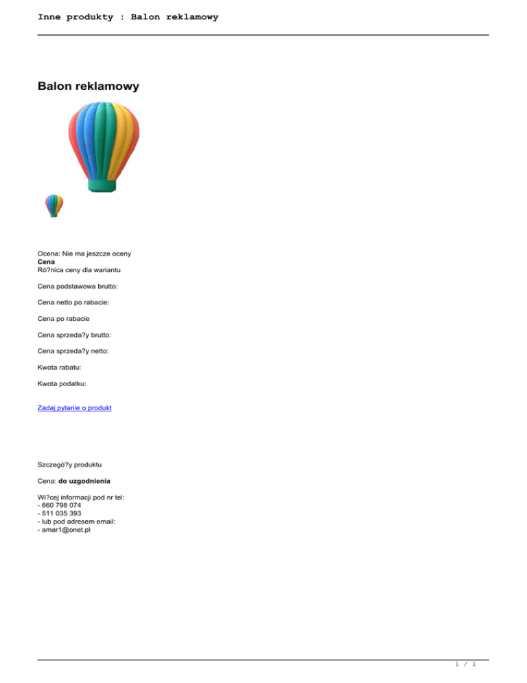 Inne produkty : Balon reklamowy Balon reklamowy Ocena: Nie ma jeszcze oceny Cena Ró?nica ceny dla wariantu Cena podstawowa brutto: Cena netto po rabacie: Cena po rabacie Cena sprzeda?y brutto: Cena sprzeda?y netto: Kwota rabatu: Kwota podatku: Zadaj pytanie o produkt Szczegó?y produktu Cena: do uzgodnienia Wi?cej informacji pod nr tel: - 660 798 074 - 511 035 393 - lub pod adresem email: - [email protected] 1 / 1 Powered by TCPDF (www.tcpdf.org)