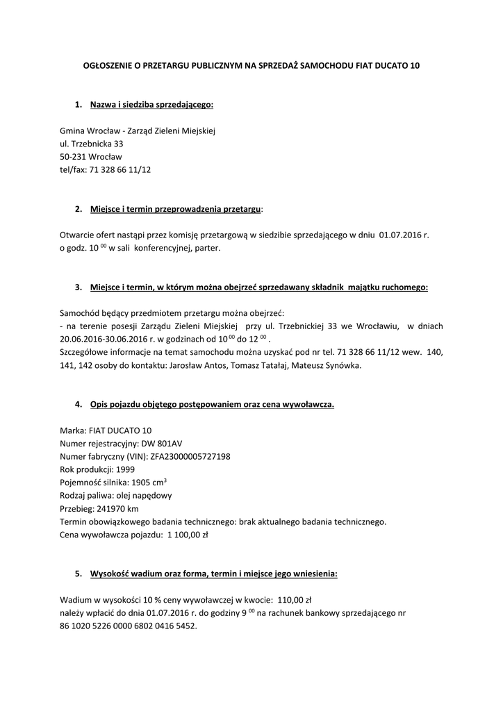 OGŁOSZENIE O PRZETARGU PUBLICZNYM NA SPRZEDAŻ SAMOCHODU FIAT DUCATO 10 1. Nazwa i siedziba sprzedającego: Gmina Wrocław - Zarząd Zieleni Miejskiej ul. Trzebnicka 33 50-231 Wrocław tel/fax: 71 328 66 11/12 2. Miejsce i termin przeprowadzenia przetargu: Otwarcie ofert nastąpi przez komisję przetargową w siedzibie sprzedającego w dniu 01.07.2016 r. o godz. 10 00 w sali konferencyjnej, parter. 3. Miejsce i termin, w którym można obejrzeć sprzedawany składnik majątku ruchomego: Samochód będący przedmiotem przetargu można obejrzeć: - na terenie posesji Zarządu Zieleni Miejskiej przy ul. Trzebnickiej 33 we Wrocławiu, w dniach 20.06.2016-30.06.2016 r. w godzinach od 10 00 do 12 00 . Szczegółowe informacje na temat samochodu można uzyskać pod nr tel. 71 328 66 11/12 wew. 140, 141, 142 osoby do kontaktu: Jarosław Antos, Tomasz Tatałaj, Mateusz Synówka. 4. Opis pojazdu objętego postępowaniem oraz cena wywoławcza. Marka: FIAT DUCATO 10 Numer rejestracyjny: DW 801AV Numer fabryczny (VIN): ZFA23000005727198 Rok produkcji: 1999 Pojemność silnika: 1905 cm3 Rodzaj paliwa: olej napędowy Przebieg: 241970 km Termin obowiązkowego badania technicznego: brak aktualnego badania technicznego. Cena wywoławcza pojazdu: 1 100,00 zł 5. Wysokość wadium oraz forma, termin i miejsce jego wniesienia: Wadium w wysokości 10 % ceny wywoławczej w kwocie: 110,00 zł należy wpłacić do dnia 01.07.2016 r. do godziny 9 00 na rachunek bankowy sprzedającego nr 86 1020 5226 0000 6802 0416 5452. 6. Wymagania jakim powinna odpowiadać oferta w prowadzonym przetargu: Oferta pod rygorem nieważności powinna być sporządzona w formie pisemnej i musi zawierać: 1) wypełniony formularz oferty, 2) w przypadku przystąpienia do przetargu osoby prawnej należy do oferty dołączyć aktualny odpis z właściwego rejestru, wystawiony nie wcześniej niż 6 miesięcy przed upływem terminu składania ofert, a w przypadku przedsiębiorcy odpis z CEIDG, 3) dowód wniesienia wadium, 4) parafowany wzór umowy. Wzór formularza ofertowego oraz projektu umowy w załączeniu. 7. Termin, miejsce i tryb złożenia oferty oraz okres, w którym oferta jest wiążąca: Ofertę należy złożyć w zaklejonej kopercie. Koperta musi być zaadresowana wg poniższego wzoru: Gmina Wrocław - Zarząd Zieleni Miejskiej ul. Trzebnicka 33 50-231 Wrocław "Oferta przetargowa na zakup samochodu marki Fiat Ducato 10 nr rej DW 801AV” Nie otwierać przed dniem 01.07.2016 r. godzina 10 00 Oferty pisemne należy składać w dni robocze (za wyjątkiem sobót) w godz. 9 00 – 15 00 nie później jednak niż do dnia 01.07.2016 r. do godz. 9 00 w sekretariacie Zarządu Zieleni Miejskiej ul. Trzebnicka 33, 50-231 Wrocław. Termin związania ofertą organizator przetargu określa na 30 dni. 8. Organizatorowi przetargu przysługuje prawo zamknięcia przetargu bez wybrania którejkolwiek z ofert, bez podania przyczyn. 9. Inne informacje 1) Przystąpienie do przetargu oznacza, że Oferent akceptuje wszystkie warunki przetargu a w przypadku nabycia pojazdu, na który złożył ofertę, że nie będzie rościł żadnych pretensji do sprzedawcy związanych ze stanem technicznym zakupionego pojazdu. 2) Komisja przetargowa wybierze Oferenta, który zaoferuje najwyższą cenę na pojazd objęty przedmiotem przetargu. Cena sprzedaży nie może być niższa od ceny wywoławczej. 3) Warunkiem przystąpienia do przetargu jest wniesienie wadium określonego w pkt 5 niniejszego ogłoszenia. 4) Wadium należy wpłacić na rachunek bankowy nr 86 1020 5226 0000 6802 0416 5452. 5) Wadium wniesione przez Oferenta zostanie zaliczone na poczet ceny nabycia. 6) Wadium złożone przez Oferentów, których oferty nie zostaną wybrane lub zostaną odrzucone, zostanie zwrócone w terminie 7 dni, odpowiednio od dnia dokonania wyboru lub odrzucenia oferty. 7) Wadium nie podlega zwrotowi w przypadku gdy: a) żaden z uczestników przetargu nie zaoferuje co najmniej ceny wywoławczej, b) uczestnik przetargu, który wygrał przetarg, uchyli się od zawarcia umowy. 8) Złożona oferta nie podlega wyjaśnieniom, ani nie może być przedmiotem negocjacji pomiędzy stronami. 9) Komisja przetargowa odrzuca ofertę, jeżeli: a) została złożona po wyznaczonym terminie, w niewłaściwym miejscu lub przez Oferenta, który nie wniósł wadium, b) nie zawiera dokumentów o których mowa w pkt 6 niniejszego ogłoszenia, lub są one niekompletne, nieczytelne lub budzą inną wątpliwość, zaś złożenie wyjaśnień mogłoby prowadzić do uznania jej za nową ofertę. 10) O odrzuceniu oferty komisja przetargowa zawiadamia niezwłocznie Oferenta. 11) W przypadku złożenia dwóch lub więcej ofert o tej samej najwyższej cenie na dany pojazd, pomiędzy Oferentami, którzy zaproponowali najwyższą cenę, zostanie przeprowadzona aukcja, której ceną wywoławczą będzie cena zaproponowana w ofertach. 12) O terminie ewentualnej aukcji Oferenci zostaną powiadomieni pisemnie, a w przypadku gdy byli obecni przy otwarciu ofert, o którym mowa w pkt. 2, ustnie, podczas otwarcia. 10. Termin zawarcia umowy sprzedaży 1) Zawarcie umowy sprzedaży nastąpi po wyborze przez komisję przetargową najkorzystniejszej oferty. 2) Nabywca jest zobowiązany zapłacić cenę nabycia niezwłocznie po wybraniu oferty zawierającej najwyższą cenę, bądź w terminie wyznaczonym przez Organizatora przetargu, nie dłuższym niż 7 dni. 3) Wydanie przedmiotu sprzedaży nabywcy nastąpi niezwłocznie po wpłaceniu ceny nabycia. 4) Sprzedawca zastrzega sobie własność pojazdu do chwili uiszczenia przez Kupującego ceny nabycia. 5) Wszystkie koszty związane z nabyciem przedmiotu sprzedaży ponosi w całości Kupujący. ZATWIERDZAM ………………………