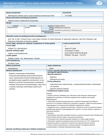 Alternatywne metody oceny ryzyka substancji chemicznych ZAO #13.3.0523 Sylabusy - Centrum Informatyczne UG Dział Kształcenia Nazwa przedmiotu Kod ECTS Alternatywne metody oceny ryzyka substancji chemicznych ZAO Nazwa jednostki prowadzącej przedmiot 13.3.0523 Katedra Chemii i Radiochemii Środowiska Studia wydział Wydział Chemii kierunek Chemia poziom forma moduł specjalnościowy specjalizacja drugiego stopnia niestacjonarne (zaoczne) zarządzanie substancjami niebezpiecznymi wszystkie Nazwisko osoby prowadzącej (osób prowadzących) prof. UG, dr hab. Tomasz Puzyn; mgr Łukasz Lubiński; dr Celina Sikorska; dr Agnieszka Gajewicz; mgr Piotr Urbaszek; mgr Katarzyna Odziomek; dr Karolina Jagiełło Formy zajęć, sposób ich realizacji i przypisana im liczba godzin Formy zajęć Liczba punktów ECTS Wykład, Ćw. laboratoryjne Sposób realizacji zajęć zajęcia w sali dydaktycznej Liczba godzin 5 zajęcia 27 godz. konsultacje 10 godz. praca własna studenta 88 godz. RAZEM: 125 godz. - 5 ECTS Wykład: 9 godz., Ćw. laboratoryjne: 18 godz. Cykl dydaktyczny 2016/2017 letni Status przedmiotu Język wykładowy obowiązkowy Metody dydaktyczne - Wykład z prezentacją multimedialną - •ćwiczenia laboratoryjne (pracowania komputerowa): wykonywanie ćwiczeń (obejmujących poszczególne grupy zagadnień poruszanych na wykładzie) w pracowni komputerowej na podstawie instrukcji otrzymanej od prowadzącego, połą-czone z analizą, dyskusją i prezentacją uzyska-nych wyników. polski Forma i sposób zaliczenia oraz podstawowe kryteria oceny lub wymagania egzaminacyjne Sposób zaliczenia - Egzamin - Zaliczenie na ocenę Formy zaliczenia - wykonanie pracy zaliczeniowej - przeprowadzenie badań i prezentacja ich wyników - egzamin pisemny testowy Podstawowe kryteria oceny Wykład: • Egzamin pisemny składający się z kilkunastu pytań testowych obejmujących zagadnienia wymienione w treściach programo-wych wykładu oraz ćwiczeń laboratoryjnych. • Warunkiem uzyskania pozytywnej oceny z egzaminu pisemnego jest zdobycie minimum 51% punktów możliwych do uzyskania z egzaminu. Skala ocen jest zgodna z obowiązującym na Uniwersy-tecie Gdańskim regulaminem studiów. • Negatywna ocena z egzaminu (pisemnego i ustnego) musi być po-prawiona podczas dodatkowego egzaminu odbywającego się w oparciu o te same zasady co egzamin w pierwszym terminie. Ćwiczenia: • Samodzielne wykonanie wszystkich ćwiczeń w pracowni kompute-rowej. Nieobecność można odrobić podczas zajęć z inną grupą ćwiczeniową. • Prezentacja oraz naukowa dyskusja uzyskanych w trakcie zajęć wyników. • Warunkiem uzyskania pozytywnej oceny jest otrzymanie min. 51% możliwych do uzyskania punktów za wykonane ćwiczenia oraz zaprezentowanie wyników. • Ocena może być podwyższona o połowę studentom szczególnie aktywnie uczestniczącym w dyskusji naukowej podczas zajęć. Sposób weryfikacji założonych efektów kształcenia Alternatywne metody oceny ryzyka substancji chemicznych ZAO #13.3.0523 | 11c83ad76999c02890f5fb9ba300820e | Strona 1 z 3 Alternatywne metody oceny ryzyka substancji chemicznych ZAO #13.3.0523 Sylabusy - Centrum Informatyczne UG Dział Kształcenia Sposób weryfikacji przyswojenia wiedzy: Student wie jak zbudować i prawidłowo ocenić modelu QSAR; wie jak prawidłowo odpowiedzieć na pytanie zakresu rodzajów deskryptorów oraz metod ich obliczania (K_W06, K_W07); prawidłowo wskaże zastosowania metod QSAR i read-accross w projektowaniu leków, chemii kosmetyków, chromatografii, chemii fizycznej, a także w ocenie ryzyka stwarzanego przez nowe związków chemicznych (K_W08) zna oprogramowanie wykorzystywane w modelowaniu QSAR (K_W10). Sposób weryfikacji nabycia umiejętności: Po ukończeniu kursu każdy student potrafi samodzielnie zbudować prosty model QSAR/QSPR (K_U01), krytycznie weryfikuje uzyskane rezultaty modelowania, prawidłowo prowadzi dyskusję uzyskanych wyników odnosząc się do wcześniej zdobytej wiedzy z zakresu nauk chemicznych oraz pokrewnych dyscyplin naukowych (K_U02, K_U04). Określenie przedmiotów wprowadzających wraz z wymogami wstępnymi A. Wymagania formalne brak B. Wymagania wstępne Posiadanie wiedzy podstawowej z zakresu chemii oraz nauk przyrodniczych. Cele kształcenia • Zaznajomienie studentów z obecnym stanem wiedzy i poziomem zaawansowania komputerowych metod przewidywania toksyczności rekomendowanych w rozporządzeniu REACH jako metody alternatywne. • Zapoznanie studentów z metodologią QSAR i jej współczesnymi wyzwaniami. • Zapoznanie studentów z dostępnym oprogramowaniem, które może być użyte w modelowaniu toksyczności substancji chemicznych. Treści programowe A. Problematyka wykładu • Najważniejsze komputerowe metody przewidywania toksyczności. • Źródła danych eksperymentalnych do modelowania QSAR. • Metody wstępnej kontroli danych: problem brakujących danych oraz tzw. punktów odbiegających, transformacje zmiennych, normalizacja rozkładu, badanie korelacji i kowariancji pomiędzy zmiennymi. • Idea i metody obliczania deskryptorów strukturalnych. • Wykorzystanie metod analizy podobieństwa oraz metod read-across do grupowania toksycznych związków chemicznych. • Etapy budowania i walidacji modeli QSAR. Wiarygodność modeli QSAR. Kryteria jakości dla modeli QSAR występujące w REACH oraz w regulacjach prawnych innych państw (Japonia, USA). • Kryteria jakości modelu QSAR sugerowane przez OECD, które muszą być spełnione, aby wyniki zostały uznane za wiarygodne. • Wytyczne Wspólnotowego Centrum Badawczego w zakresie QSAR. B. Problematyka ćwiczeń komputerowych • Rola jakości danych eksperymentalnych i chemometryczne metody wstępnej oceny jakości danych. • Przygotowanie modeli cząsteczek w zapisie współrzędnych wewnętrznych. • Optymalizacja geometrii molekuły przy wykorzystaniu metod kwantowo-mechanicznych, oraz obliczenia deskryptorów struktury. • Metody analizy podob