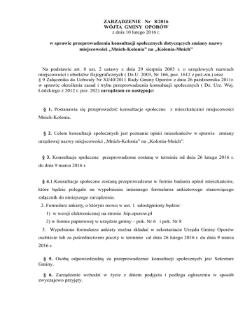 ZARZĄDZENIE Nr 8/2016 WÓJTA GMINY OPORÓW z dnia 10 lutego 2016 r. w sprawie przeprowadzenia konsultacji społecznych dotyczących zmiany nazwy miejscowości „Mnich-Kolonia” na „Kolonia-Mnich” Na podstawie art. 8 ust. 2 ustawy z dnia 29 sierpnia 2003 r. o urzędowych nazwach miejscowości i obiektów fizjograficznych ( Dz.U. 2003, Nr 166, poz. 1612 z poź.zm.) oraz § 9 Załącznika do Uchwały Nr XI/40/2011 Rady Gminy Oporów z dnia 26 października 2011r. w sprawie określenia zasad i trybu przeprowadzenia konsultacji społecznych ( Dz. Urz. Woj. Łódzkiego z 2012 r. poz. 202) zarządzam co następuje: § 1. Postanawia się przeprowadzić konsultacje społeczne z mieszkańcami miejscowości Mnich-Kolonia. § 2. Celem konsultacji społecznych jest poznanie opinii mieszkańców w sprawie zmiany urzędowej nazwy miejscowości „Mnich-Kolonia” na „Kolonia-Mnich”. § 3. Konsultacje społeczne przeprowadzone zostaną w terminie od dnia 26 lutego 2016 r. do dnia 9 marca 2016 r. § 4.1.Konsultacje społeczne zostaną przeprowadzone w formie badania opinii mieszkańców, które będzie polegało na wypełnieniu imiennego formularza ankietowego stanowiącego załącznik do niniejszego zarządzenia. 2. Formularz ankiety, o którym mowa w ust. 1 udostępniony będzie: 1) w wersji elektronicznej na stronie :bip.oporow.pl 2) w formie papierowej w urzędzie gminy – pok. Nr 6 i pok. Nr 8 3. Wypełnione formularze ankiety można składać w sekretariacie Urzędu Gminy Oporów osobiście lub za pośrednictwem poczty w terminie od dnia 26 lutego 2016 r. do dnia 9 marca 2016 r. § 5. Osobą odpowiedzialną za przeprowadzenie konsultacji społecznych jest Sekretarz Gminy. § 6. Zarządzenie wchodzi w życie z dniem podjęcia i podlega ogłoszeniu w sposób zwyczajowo przyjęty. Załącznik do Zarządzenia Nr 8/2016 Wójta Gminy Oporów z dnia 10 lutego 2016 r. w sprawie przeprowadzenia konsultacji społecznych dotyczących zmiany nazwy miejscowości „Mnich-Kolonia” na „Kolonia-Mnich” KONSULTACJE SPOŁECZNE DOTYCZĄCE ZMIANY NAZWY MIEJSCOWOŚCI „MNICH -KOLONIA” NA „KOLONIA-MNICH” ………………………………………………. imię i nazwisko ………………………………………………. ……………………………………………….. adres zamieszkania Celem konsultacji jest doprowadzenie do zgodności między urzędową nazwą miejscowości „Mnich-Kolonia” a nazwą funkcjonującą w obiegu „KoloniaMnich” Czy jest Pan/Pani za zmianą nazwy miejscowości „Mnich-Kolonia” na „KoloniaMnich” □ TAK □ NIE Wyrażam zgodę na przetwarzanie moich danych osobowych zawartych w ankiecie dla potrzeb niezbędnych do przeprowadzenia konsultacji społecznych dotyczących zmiany nazwy miejscowości „Mnich –Kolonia” na „Kolonia-Mnich” zgodnie z ustawą z dnia 29 sierpnia 1997 r. o ochronie danych osobowych (Dz. U. z 2014 r. poz. 1182 z późn. zm.) …………………………… Podpis Pouczenie: Zaznaczyć można tylko 1 odpowiedź stawiając znak „ X” w kratce z lewej strony odpowiedzi, którą się wybrało. Postawienie znaku „X” w więcej niż 1 kratce albo nie postawienie znaku „X” w żadnej kratce powoduje nieważność głosu. UZASADNIENIE Rozporządzeniem Ministra Administracji i Cyfryzacji z dnia 13 grudnia 2012 r. w sprawie wykazu urzędowych nazw miejscowości i ich części ( Dz. U. z 2013r. , poz. 200 z późn. zm.) ustalony został wykaz urzędowych nazw miejscowości w Polsce. W Wykazie tym dla miejscowości „Kolonia-Mnich” istnieje nazwa „Mnich-Kolonia”. Aby doprowadzić do zgodności z nazwa funkcjonującą w obiegu Rada Gminy Oporów będzie wnioskowała do Ministra Administracji i Cyfryzacji o zmianę urzędowej nazwy miejscowości „MnichKolonia” na „Kolonia-Mnich” .Ww. wniosek musi zawierać m.in. omówienie wyników konsultacji przeprowadzonych z mieszkańcami miejscowości, której wniosek dotyczy, z tych względów uzasadnione jest wydanie zarządzenia Wójta Gminy Oporów dotyczących przeprowadzenia konsultacji społecznych dotyczących zmiany nazwy miejscowości.
