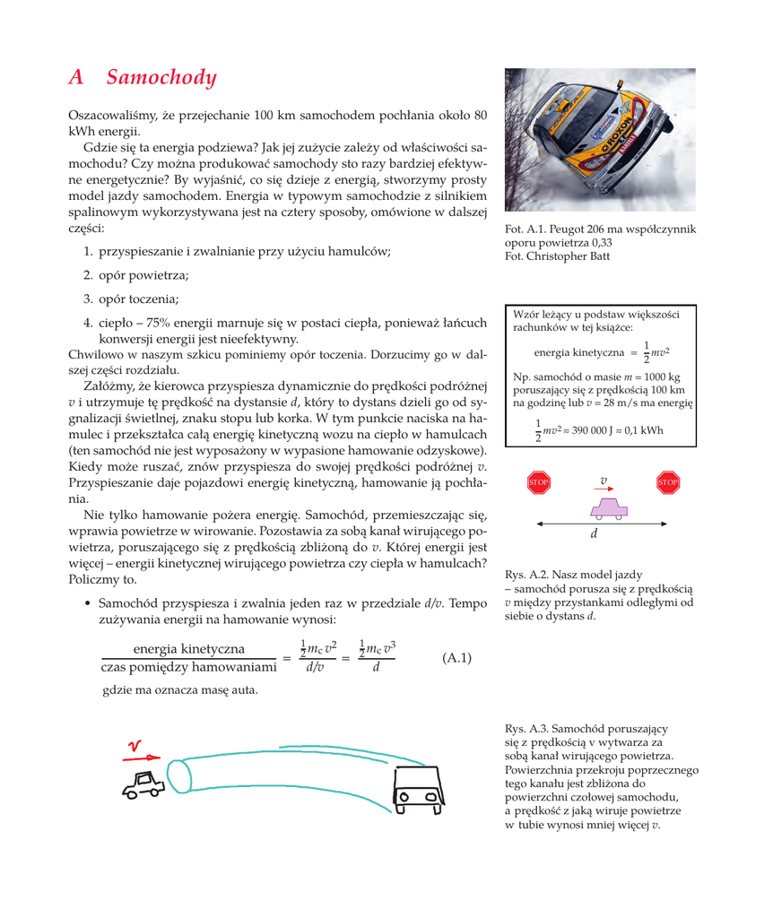 A Samochody Oszacowaliśmy, że przejechanie 100 km samochodem pochłania około 80 kWh energii. Gdzie się ta energia podziewa? Jak jej zużycie zależy od właściwości samochodu? Czy można produkować samochody sto razy bardziej efektywne energetycznie? By wyjaśnić, co się dzieje z energią, stworzymy prosty model jazdy samochodem. Energia w typowym samochodzie z silnikiem spalinowym wykorzystywana jest na cztery sposoby, omówione w dalszej części: 1. przyspieszanie i zwalnianie przy użyciu hamulców; Fot. A.1. Peugot 206 ma współczynnik oporu powietrza 0,33 Fot. Christopher Batt 2. opór powietrza; 3. opór toczenia; 4. ciepło – 75% energii marnuje się w postaci ciepła, ponieważ łańcuch konwersji energii jest nieefektywny. Chwilowo w naszym szkicu pominiemy opór toczenia. Dorzucimy go w dalszej części rozdziału. Załóżmy, że kierowca przyspiesza dynamicznie do prędkości podróżnej v i utrzymuje tę prędkość na dystansie d, który to dystans dzieli go od sygnalizacji świetlnej, znaku stopu lub korka. W tym punkcie naciska na hamulec i przekształca całą energię kinetyczną wozu na ciepło w hamulcach (ten samochód nie jest wyposażony w wypasione hamowanie odzyskowe). Kiedy może ruszać, znów przyspiesza do swojej prędkości podróżnej v. Przyspieszanie daje pojazdowi energię kinetyczną, hamowanie ją pochłania. Nie tylko hamowanie pożera energię. Samochód, przemieszczając się, wprawia powietrze w wirowanie. Pozostawia za sobą kanał wirującego powietrza, poruszającego się z prędkością zbliżoną do v. Której energii jest więcej – energii kinetycznej wirującego powietrza czy ciepła w hamulcach? Policzmy to. • Samochód przyspiesza i zwalnia jeden raz w przedziale d/v. Tempo zużywania energii na hamowanie wynosi: energia kinetyczna = czas pomiędzy hamowaniami 1 2 2 mc v d/v = 1 3 2 mc v d Wzór leżący u podstaw większości rachunków w tej książce: energia kinetyczna = 1 mv 2 2 Np. samochód o masie m = 1000 kg poruszający się z prędkością 100 km na godzinę lub v = 28 m/s ma energię 1 mv 2 ≈ 390 000 J ≈ 0,1 kWh 2 v ST OP ST OP d Rys. A.2. Nasz model jazdy – samochód porusza się z prędkością v między przystankami odległymi od siebie o dystans d. (A.1) gdzie ma oznacza masę auta. Rys. A.3. Samochód poruszający się z prędkością v wytwarza za sobą kanał wirującego powietrza. Powierzchnia przekroju poprzecznego tego kanału jest zbliżona do powierzchni czołowej samochodu, a prędkość z jaką wiruje powietrze w tubie wynosi mniej więcej v. 271 A – Samochody • Kanał wirującego powietrza wytworzony w czasie t ma objętość Avt, gdzie A to powierzchnia przekroju poprzecznego tuby, zbliżona do powierzchni przodu samochodu. (W przypadku samochodu o opływowych kształtach A jest zazwyczaj nieco mniejsze niż powierzchnia czołowa samochodu Aauto, a stosunek efektywnej powierzchni przekroju poprzecznego kanału do powierzchni samochodu jest nazywany współczynnikiem oporu powietrza co. Na użytek kolejnych równań A oznaczać będzie efektywną powierzchnię samochodu co Aauto). Tuba ma masę mpowietrze = ρAvt (gdzie ρ oznacza gęstość powietrza) i wiruje z prędkością v, stąd też jej prędkość kinetyczna wynosi: Używam następującego wzoru: masa = gęstość × objętość Symbol ρ (grecka litera „ro”) oznacza gęstość. 1 1 mpowietrze v2 = ρ Avt v2 2 2 a tempo przekazywania energii kinetycznej wirującemu powietrzu wynosi: 1 2 2 ρ Avtv t = 1 ρ Av3 2 Stąd też całkowite tempo, w jakim samochód traci energię, wynosi: = 12 mav3/d + 1 2 ρAv3 (A.2) Energia oddana hamulcom + energia oddana wirującemu powietrzu (wzór A.2) Obie formy rozpraszania energii są proporcjonalne do sześcianu prędkości (v3). Zgodnie z naszym szkicem kierowca zmniejszający o połowę prędkość v obniża zużycie energii 8-krotnie. Jeżeli przejedzie ten sam dystans, zajmie mu to dwa razy dłużej, ale całkowite zużycie energii będzie czterokrotnie niższe. Na co traci się więcej energii – na hamowanie, czy na przezwyciężanie oporów powietrza? Zależy to od stosunku (ma/d)/(ρA) Jeżeli ten stosunek jest znacznie większy od 1 – więcej energii pochłania hamowanie. Jeżeli jest mniejszy – więcej energii pochłania wirujące powietrze. Przekształcając ten wzór, stwierdzamy, że stosunek ten jest większy od 1, jeżeli: ST OP ST OP Rys. A.4. By dowiedzieć się, czy zużycie energii jest zdominowane przez hamowanie czy przez wirowanie powietrza, porównujemy masę samochodu z masą kanału powietrza pomiędzy przystankami. ma > ρAd Ad to objętość kanału powietrza zamiecionego pomiędzy jednym a drugim przystankiem, a ρAd to masa tuby. Sytuacja jest prosta. Jeżeli masa samochodu jest większa niż masa tuby powietrza wytworzonej pomiędzy dwoma przystankami, przeważa rozpraszanie energii typu „energia kinetyczna na hamowanie”. Jeżeli masa samochodu jest mniejsza, przeważa dyssypacja energii związana z wprawianiem powietrza w ruch wirowy (rys. A.4). Określmy dystans d* pomiędzy przystankami, poniżej którego dyssypacja jest zdominowana przez hamowanie i powyżej którego jest zdominowana przez wirowanie (inaczej: zdominowana przez opór powietrza). Fot. A.5. Moc zużywana przez samochód jest proporcjonalna do powierzchni jego przekroju podczas jazdy autostradowej i do jego masy podczas jazdy miejskiej. Zgadnij, co pali mniej na 100 km – VW po lewej czy statek kosmiczny? 272 O zrównoważonej energii – bez pary w gwizdek Jeżeli powierzchnia czołowa samochodu wynosi: Aauto = 2 m szerokości × 1,5 m wysokości = 3 m2 współczynnik oporu powietrza wynosi co = 1/3, a masa ma = 1000 kg, wówczas ten specjalny dystans wyniesie: d* = ma 1000 kg = = 750 m ρ co Aauto 1,3 kg/m3 × 13 × 3 m2 Tak więc rozpraszanie energii w trybie miejskim jest zdominowane przez energię kinetyczną i hamowanie, jeżeli dystans pomiędzy przystankami jest mniejszy ni