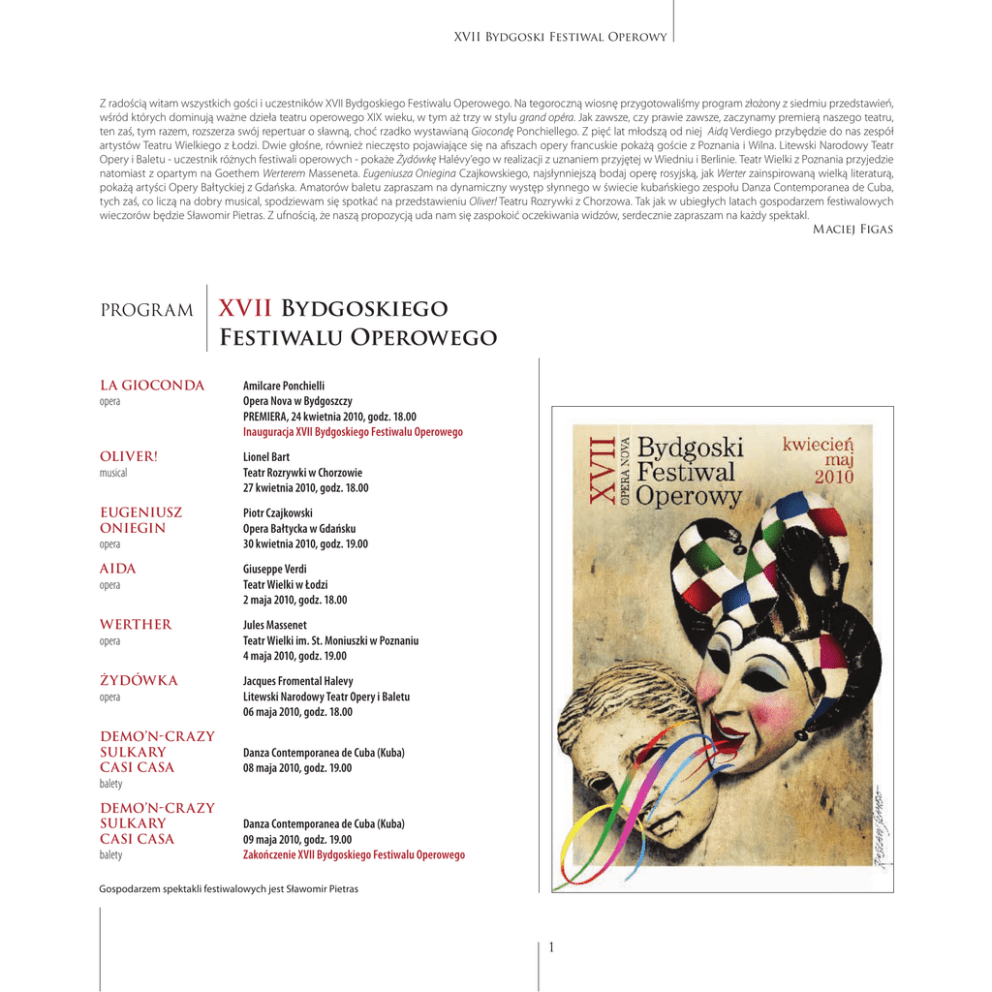 XVII Bydgoski Festiwal Operowy Z radością witam wszystkich gości i uczestników XVII Bydgoskiego Festiwalu Operowego. Na tegoroczną wiosnę przygotowaliśmy program złożony z siedmiu przedstawień, wśród których dominują ważne dzieła teatru operowego XIX wieku, w tym aż trzy w stylu grand opéra. Jak zawsze, czy prawie zawsze, zaczynamy premierą naszego teatru, ten zaś, tym razem, rozszerza swój repertuar o sławną, choć rzadko wystawianą Giocondę Ponchiellego. Z pięć lat młodszą od niej Aidą Verdiego przybędzie do nas zespół artystów Teatru Wielkiego z Łodzi. Dwie głośne, również nieczęsto pojawiające się na afiszach opery francuskie pokażą goście z Poznania i Wilna. Litewski Narodowy Teatr Opery i Baletu - uczestnik różnych festiwali operowych - pokaże Żydówkę Halévy’ego w realizacji z uznaniem przyjętej w Wiedniu i Berlinie. Teatr Wielki z Poznania przyjedzie natomiast z opartym na Goethem Werterem Masseneta. Eugeniusza Oniegina Czajkowskiego, najsłynniejszą bodaj operę rosyjską, jak Werter zainspirowaną wielką literaturą, pokażą artyści Opery Bałtyckiej z Gdańska. Amatorów baletu zapraszam na dynamiczny występ słynnego w świecie kubańskiego zespołu Danza Contemporanea de Cuba, tych zaś, co liczą na dobry musical, spodziewam się spotkać na przedstawieniu Oliver! Teatru Rozrywki z Chorzowa. Tak jak w ubiegłych latach gospodarzem festiwalowych wieczorów będzie Sławomir Pietras. Z ufnością, że naszą propozycją uda nam się zaspokoić oczekiwania widzów, serdecznie zapraszam na każdy spektakl. Maciej Figas PROGR AM XVII Bydgoskiego Festiwalu Operowego LA GIOCONDA opera Amilcare Ponchielli Opera Nova w Bydgoszczy PREMIERA, 24 kwietnia 2010, godz. 18.00 Inauguracja XVII Bydgoskiego Festiwalu Operowego OLIVER! musical Lionel Bart Teatr Rozrywki w Chorzowie 27 kwietnia 2010, godz. 18.00 EUGENIUSZ ONIEGIN opera Piotr Czajkowski Opera Bałtycka w Gdańsku 30 kwietnia 2010, godz. 19.00 AIDA opera Giuseppe Verdi Teatr Wielki w Łodzi 2 maja 2010, godz. 18.00 WERTHER opera Jules Massenet Teatr Wielki im. St. Moniuszki w Poznaniu 4 maja 2010, godz. 19.00 ŻYDÓWK A opera Jacques Fromental Halevy Litewski Narodowy Teatr Opery i Baletu 06 maja 2010, godz. 18.00 DEMO’NCR AZY SULK ARY CASI CASA balety DEMO’NCR AZY SULK ARY CASI CASA balety Danza Contemporanea de Cuba (Kuba) 08 maja 2010, godz. 19.00 Danza Contemporanea de Cuba (Kuba) 09 maja 2010, godz. 19.00 Zakończenie XVII Bydgoskiego Festiwalu Operowego Gospodarzem spektakli festiwalowych jest Sławomir Pietras 1 XVII Bydgoski Festiwal Operowy AMILCARE PONCHIELLI Dyrektor La Gioconda Muzyka Tekst Prapremiera Premiera Kierownictwo muzyczne Inscenizacja i reżyseria Scenografia Kostiumy Choreografia Reżyseria świateł Przygotowanie chóru Współpraca muzyczna Asystent scenografa Asystent kostiumografa Stylizacja fryzur I Asystent reżysera II Asystent reżysera Asystent choreografa Postaci i wykonawcy Gioconda, Śpiewaczka Laura Adorno, Genuenka Alvise Badoero La Cieca, matka Giocondy Enzo Grimaldo, Książę Genueński Barnaba, wędrowny pieśniarz Zuàne, zawodnik w regatach, Śpiewak, Pilot Isèpo, Skryba Dyryguje LA GIOCONDA Maciej Figas Opera Amilcare Ponchielli Opera w czterech aktach Tobia Gorrio (Arrigo Boito) Mediolan, 8 kwietnia 1876 Bydgoszcz, 24 i 25 kwietnia 2010 Ruben Silva Krzysztof Nazar Marek Chowaniec Magdalena Tesławska Zofia Rudnicka Bogumił Palewicz Henryk Wierzchoń Jerzy Wołosiuk Mariusz Napierała Agata Uchman Lidia Gałązka Edward Stasiński Hanna Pawlitka - Pawłowska Ilona Jaświn - Madejska Magdalena Barylak, Halina Fulara-Duda, Katarzyna Nowak-Stańczyk, Gabriela Orłowska-Silva Anna Borucka, Małgorzata Ratajczak, Darina Gapicz, Jacek Greszta, Łukasz Goliński, Bartłomiej Tomaka Barbara Krahel, Anetta Szczesik-Wakarecy Sylwester Kostecki, Edward Kulczyk, Tadeusz Szlenkier Leszek Skrla, Adam Woźniak Łukasz Goliński, Andrzej Nowakowski, Karol Malinowski Pavlo Tolstoy, Marcin Naruszewicz, Grzegorz Szachnowski Orkiestra, Chór , Balet oraz Statyści Opery Nova Ruben Silva Oper a Nova W Bydgoszczy OPERA NOVA W BYDGOSZCZY Akt I Paszcza lwa Dziedziniec Pałacu Dożów. W głębi schody z posągami gigantów i portyk della Carta z drzwiami prowadzącymi do bazyliki Świętego Marka. Na jednej ze ścian płaskorzeźba z lwim łbem, poniżej inskrypcja: DENONTIAE SECRETE PER VIA /D’INQUISITIONE CONTRA CADA/UNA PERSONA CON L’IMPUNITÀ/SECRETEZA ET BENEFITII GIUSTO ALLE LEGI. Piękny wiosenny dzień w sam raz na uroczyste Regaty na Canale Grande. Zgromadzony na placu lud obserwuje spod kolumny Barnaba – uliczny śpiewak, a zarazem szpicel Rady Dziesięciu. Wypatruje Giocondę, wędrowną śpiewaczkę, którą chciałby zdobyć, a która zmierza właśnie z niewidomą matkę na nieszpory. Gioconda w głowie ma tylko dalmatyńskiego żeglarza, któremu na imię Enzo. Zaloty Barnaby oczywiście odtrąca, ten zaś w odwecie lży jej matkę skutecznie judząc przeciw niej tłum pomówieniami o czary. W obronie kaleki dzielnie staje Enzo, jednakże tumult podburzonego tłumu cichnie dopiero, gdy na placu zjawia się Inkwizytor Alvise z małżonką. Jej wstawiennictwo sprawia, że niewidomej nic już nie grozi, toteż ta z wdzięczności ofiaruje weneckiej damie najcenniejszą rzecz, jaką ma, mianowicie różaniec. Tymczasem Enzo rozpoznaje w żonie inkwizytora Laurę, kobietę, którą kochał przed laty, z którą los go rozłączył, gdy rodzina wydała ją za innego. Zawsze dobrze poinformowany Barnaba zna tę historię, wie też, że Enzo nie jest żadnym żeglarzem, tylko wygnanym z Wenecji genueńskim księciem Grimaldo di Santafior. W mig spostrzega, że uczucia rywala nadal są żywe, co daje mu asumpt do uknucia intrygi. Kiedy tłum znika w kościele, Barnaba sam na sam z nieprzytomnym z miłości mężczyzną obiecuje mu schadzkę z małżonką inkwizytora. By zabrzmieć wiarygodnie, oznajmia wprost, że jest szpiegiem Rady