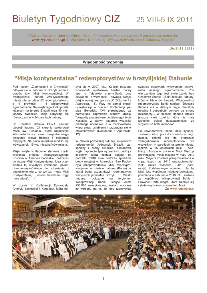 Biuletyn Tygodniowy CIZ 25 VIII-5 IX 2011 Biuletyn Centrum Informacyjnego Zakonów opracowywany przez zespół portalu internetowego www.zyciezakonne.pl i sekretariat Konferencji Wyższych Przełożonych Zakonów Męskich 36/2011 (131) Wiadomość tygodnia “Misja kontynentalna” redemptorystów w brazylijskiej Itabunie Pod hasłem „Zjednoczeni w Chrystusie” odbywa się w Itabunie w Brazylii jeden z etapów tzw. Misji Kontynentalnej. W ewangelizacji ponad 250-tysięcznego miasta bierze udział 62 redemptorystów z z 4 prowincji i 4 wiceprowincji Zgromadzenia Najświętszego Odkupiciela leżących na terenie Brazylii oraz 40 misjonarzy świeckich. Misje odbywają się równocześnie w 14 parafiach Itabuny. Bp Czesław Stanula CSsR, pasterz diecezji Itabuna, 24 sierpnia celebrował Mszę św. Posłania, która rozpoczęła kilkunastodniowy czas bezpośredniego głoszenia słowa Bożego i celebracji misyjnych. Na placu miejskim modliło się wówczas ok. 15 tys. mieszkańców miasta. Misje święte w Itabunie stanowią część wielkiego projektu ewangelizacyjnego Kościoła w Ameryce Łacińskiej, noszącego nazwę Misji Kontynentalnej. Idea przewodnia tej inicjatywy episkopatu południowoamerykańskiego to ożywienie i pogłębienie wiary, co wyraża motto Misji Kontynentalnej: „Jestem katolikiem, żyję moją wiarą”. (…) W czasie V Konferencji Episkopatu Ameryki Łacińskiej i Karaibów, która od- była się w 2007 roku, Kościół naszego Kontynentu wystosował bardzo mocny apel o "głębokie przemyślenie oraz ożywienie, z wiernością i odwagą, swojej misji w nowej rzeczywistości" (Dokument z Aparecida, 11). Przy tej samej okazji, uczestnicząc w pracach Konferencji, papież Benedykt XVI przestrzegał, że największe zagrożenie stanowi dzisiaj "pospolity pragmatyzm codziennego życia Kościoła, w którym pozornie wszystko przebiega normalnie, a w rzeczywistości wiara ulega osłabieniu i przeradza się w małostkowość" (Dokument z Aparecida, 12). W obliczu powyższej sytuacji, misjonarze redemptoryści Jednostek Brazylii, zakonnicy i osoby świeckie, postanowili wyjść naprzeciw tym wyzwaniom. Jedną z inicjatyw, która została podjęta na początku 2010 roku podczas spotkania grupy misyjnej w Aparecida (Sao Paulo), było przeprowadzenie Misji Międzyprowincjalnej w mieście Itabuna (Bahia), w której będą uczestniczyli redemptoryści wszystkich jednostek Brazylii. Miasto Itabuna, położone na terytorium Wiceprowincji Bahia, liczące około 250.000 mieszkańców, zostało wybrane ze względu na to, że jego rzeczywista 1 sytuacja odpowiada wyzwaniom charyzmatu naszego Zgromadzenia. Potwierdzeniem tego jest stwierdzenie bpa Czesława Stanuli CSsR, biskupa Itabuny, który w liście do Zarządu Wiceprowincji redemptorystów Bahia napisał: "Diecezja Itabuna ma w dalszym ciągu charakter misyjny i potrzebuje pomocy ze strony misjonarzy... W mieście Itabuna istnieje jeszcze wiele dzielnic, które nie mają rzetelnej opieki duszpasterskiej ze względu na brak kapłanów". Po uświadomieniu sobie takiej sytuacji, zarówno biskup jak i duchowieństwo tego miasta, skłonili się do propozycji zaangażowania redemptorystów we wszystkich 14 parafiach na terenie miasta, łącznie w 55 ośrodkach misji i celebracji. Uroczyste otwarcie Misji Międzyprowincjalnej miało miejsce w maju 2010 roku. Misja ta zostanie przeprowadzona w ciągu trzech lat: 2010 (przygotowanie), 2011 (misja właściwa), 2012 (postmisja). Podstawowym oparciem dla tej Misji jest wspólnota międzyprowincjalna, powołana w Itabunie w 2010 roku, złożona ze współbraci Wiceprowincji Bahia i Prowincji Porto Alegre, która zajmuje się całościowym koordynowaniem Misji. Za: www.redemptor.pl Wiadomości krajowe Abp Jan Paweł Lenga MIC odznaczony Krzyżem Komandorskim Krzyż Komandorski Orderu Zasługi Rzeczypospolitej Polskiej odebrał 2 września z rąk wojewody wielkopolskiego Piotra Florka abp Jan Paweł Lenga, marianin, rezydent domu zakonnego Zgromadzenia Księży Marianów w Licheniu. Był on pierwszym i długoletnim administratorem apostolskim Kazachstanu i Azji Środkowej, a następnie biskupem diecezji karagandzkiej w Kazachstanie. Odznaczenie zostało nadane abp. Janowi Pawłowi Lendze MIC przez prezydenta Rzeczpospolitej Polskiej Bronisława Komorowskiego na wniosek Ministra Spraw Zagranicznych. Jak czytamy w uzasadnieniu decyzji prezydenta RP abp Lenga został odznaczony Krzyżem Komandorskim Orderu Zasługi Rzeczypospolitej Polski „za wybitne zasługi w działalności na rzecz środowisk polonijnych i krzewienie polskości w Kazachstanie”. – Krzyż Komandorski Orderu Zasługi Rzeczypospolitej Polskiej jest to order, który nadaje się obywatelom polskim, którzy urodzili się za granicą, bądź też obywatelom polskim, którzy mieszkają poza granicami naszego kraju. W związku z posługą, którą ksiądz arcybiskup pełnił przez 36 lat w dalekiej Azji, Minister Spraw Zagranicznych wystąpił do Prezydenta RP o nadanie tak zaszczytnego odznaczenia – powiedział wojewoda wielkopolski Piotr Florek podczas uroczystości wręczenia orderu abp. Lendze. Dziękując za przyznanie odznaczenia 61-letni obecnie hierarcha przybliżył przybyłym na uroczystość historię swojej posługi w Kazachstanie i na stepach dalekiej Azji. – Urodziłem się na Ukrainie, mam obywatelstwo kazachskie, uczyłem się w podziemiu w seminariach na Litwie i na Łotwie, służyłem w republikach Środkowej Azji, a okazuje się, że nagroda czeka na mnie w Polsce. Nigdy o tym nawet nie marzyłem, a tu taka niespodzianka. Dziękuję tym, którzy obserwowali moją pracę, dziękuję Panu Prezydentowi, że podjął taką decyzję – powiedział laureat. Jan Paweł Lenga urodził się 28 marca 1950 w polskiej rodzinie w Gródku (Horodok) na Ukrainie. Jego rodzina przeprowadziła się na Łotwę, gdzie przyszły kapłan pracował jako robotnik na kolei. Raz w tygodniu jeździł do zakonnika ze Zgromadzenia K