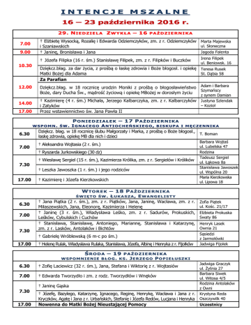 INTENCJE MSZALNE 16 – 23 października 2016 r. 29. NIEDZIELA ZWYKŁA – 16 PAŹDZIERNIKA 7.00 9.00 † Elżbietę Wysocką, Rozalię i Edwarda Odziemczyków, zm. z r. Odziemczyków Marta Majewska ul. Słoneczna i Szaniawskich Jagoda Falenta † Janinę, Bronisława i Jana † Józefa Filipka (16 r. śm.) Stanisławę Filipek, zm. z r. Filipków i Buczków 10.30 12.00 14.00 17.00 Dziękcz.błag. za dar życia, z prośbą o łaskę zdrowia i Boże błogosł. i opiekę Teresa Rusek Matki Bożej dla Adama St. Dąbia 58 Za Parafian Dziękcz.błag. w 18 rocznicę urodzin Moniki z prośbą o błogosławieństwo Adam i Barbara Szymańscy Boże, dary Ducha Św., mądrość życiową i opiekę MBożej w dorosłym życiu † Kazimierę (4 r. śm.) Michała, Jerzego Kalbarczyka, zm. z r. Kalbarczyków i Zatyków Przez wstawiennictwo św. Jana Pawła II WSPOMN. ŚW. 6.30 7.00 7.30 17.00 Irena Filipek ul. Beniowsk. 16 z synem Damian Justyna Szlendak – Kozioł PONIEDZIAŁEK – 17 PAŹDZIERNIKA IGNACEGO ANTIOCHEŃSKIEGO, BISKUPA I MĘCZENNIKA Dziękcz. błag. w 18 rocznicę ślubu Małgorzaty i Marka, z prośbą o Boże błogosł., T. Boman łaskę zdrowia, opiekę MB dla nich i dzieci † Aleksandra Wojtasia (2 r. śm.) † Ryszarda Jurkowskiego (30 dz) † Wiesławę Sergiel (15 r. śm.), Kazimierza Królika, zm. z r. Sergielów i Królików † Leszka Jawoszka (1 r. śm.) i jego rodziców † Kazimierę i Józefa Kierzkowskich Barbara Wojtaś ul. Lubelska 47 Rodzina Tadeusz Sergiel ul. Łąkowa 8a Stanisława Jawoszek ul. Wspólna 20 Maria Kierzkowska ul. Lipowa 18 WTOREK – 18 PAŹDZIERNIKA ŚWIĘTO ŚW. 6.30 7.00 7.30 ŁUKASZA, EWANGELISTY † Jana Piątka (2 r. śm.), zm. z r. Piątków, Jana, Janinę, Wacława, zm. z r. Miłaszewskich, Jana, Eleonorę, Kazimierza i Helenę † Janinę (3 r. śm.), Władysława Leśko, zm. z r. Sadurów, Prokuskich, Leśków, Cybulskich i Cuchów † Stanisława, Stanisławę, Antoniego, Mariannę, Stanisława i Katarzynę, zm. z r. Lasków, Antolaków i Bichtów † Gabrielę Wróblewską (6 m-c po śm.) 17.00 † Helenę Rulak, Władysława Rulaka, Stanisława, Józefa, Albinę i Henryka z r. Fijołków Zofia Piątek ul. Kośc. 21/17 Elżbieta Prokuska Swaty 86 Henryk Lasek Ownia 21 Sąsiedzi z Jarmołówki Jadwiga Fijołek ŚRODA – 19 PAŹDZIERNIKA WSPOMNIENIE BŁOG. KS. JERZEGO POPIEŁUSZKI 6.30 † Zofię Laciewicz (32 r. śm.), Jana, Stefana i Wiktorię z r. Wojtasiów 7.00 † Edwarda Tworzydło i zm. z rodz. Tworzydłów i Wnęków † Janinę Gąska 7.30 17.00 Jadwiga Graczyk ul. Żytnia 27 Barbara Siwek ul. Witosa 4/5 Rodzina Antolaków z Owni Krystyna Reda Oszczywilk 40 † Józefę, Bazylego, Katarzynę, Ignacego, Reginę, Henrykę, Wacława i Jana z r. Kryczków, Agatę i Jana z r. Urbańskich, Stefanię i Józefa Redów, Lucjana i Henryka Uczestnicy Nowenna do Matki Bożej Nieustającej Pomocy CZWARTEK – 20 PAŹDZIERNIKA WSPOMNIENIE ŚW. 6.30 7.00 7.30 17.00 JANA KANTEGO, PREZBITERA † Władysława Łukasiaka (1 r. śm.), Zofię, Jana , Mariannę, Jadwigę, Henryka, Kazimierza z r. Łukasiaków, Szumerów, Stanisławę i Stanisława Bichtów, Jolantę Celej † Zygmunta Żaczka † Bolesława Głowienka (30 dz.) † Jerzego Głowienka (3 r. śm.), zm. z r. Głowienków, Kieliszków, Białachów, Paplińskich, Ireneusza Bilskiego Dzięk. z okazji urodzin dla Magdaleny i Agnieszki, oraz w podziękowaniu za obronę pracy magisterskiej † Kazimierę Szczygielską (2 r. śm.), Stanisława, Ewę, Dariusza Szczygielskich Stanisława Bichta ul. Jana Pawła 10 Rodz. Ryszkowskich Rodzina Alfreda Głowienka ul. Dolna 21 Leszek Kiełtyka ul. Wąska 3 Tomasz Szczygielski PIĄTEK – 21 PAŹDZIERNIKA WSPOMNIENIE BŁ. 6.30 7.00 7.30 17.00 JAKUBA STRZEMIĘ, BISKUPA † Edwarda i Krystynę Szewczyk, zm. z r. Szewczyków i Jędrychów † Rodziców: Anielę i Eugeniusza Substelnych † Janinę Gągała (30 dz) † Mariana Wojtasia i zm. z r. Berezińskich i Wojtasiów † Mariannę Jakubasik (1 r. śm.) † Stanisławę Czerską i zm. z r. Czerskich Andrzej Szewczyk ul. Krótka 6 Barbara Mączyńska ul. Królewska 107 Rodzina Janina Wojtaś ul. Łąkowa 23 Tadeusz Jakubasik Ownia 106 Teresa Czerska ul. K. Wojt. 25/37 SOBOTA – 22 PAŹDZIERNIKA WSPOMNIENIE ŚW. JANA PAWŁA II, PAPIEŻA 6.30 † Adelę Warowną (1 r. śm.) 7.00 …………………………………………………………………………………………………………… 7.30 15.00 16.00 17.00 † Adama Pawłowskiego (5 r. śm.) i Eugenię Pawłowską (2 r. śm.) † Andrzeja Sułkowskiego (7 r. śm.) Barbara Jędrych Nowa Dąbia 63 Jacek Nowaczyk Chrustne 15 Iwona Prządka ul. Kochanow. 8 Agnieszka Sułkowska ul. Lubelska 35 Ślub: Gawryszewska – Kudlak Ślub: Urbanowicz – Praski Dziękcz. błag. za dar życia w 10 rocznicę urodzin Franciszka i 50 rocznicę Hanna Kryczka urodzin Artura, z prośbą o Boże błogosł. i opiekę MB dla całej rodziny 30. NIEDZIELA ZWYKŁA – 23 PAŹDZIERNIKA Danuta Szwed 7.00 † Jana (48 r. śm.), Zofię, Krystynę, Katarzynę, Stanisława, Henię i Wacława ul. K. Wojtyły Pałyska, zm. z r. Szwedów – 19/20 9.00 † Reginę Flak (8 r. śm.), Władysława, Bolesława, Jana zm. z rodz. Flaków Krystyna Lipiec Swaty 49 i Wojewodów † Jana Stonia, Genowefę i Jana Majków, Wandę i Władysława Wasilewskich Bogumiła Wasilewska ul. Słowackiego 106 † Janinę i Wacława Sędziak, zm. z r. Sędziaków i Koneckich Halina Sędziak ul. JP II 3 10.30 12.00 14.00 17.00 Za Parafian O łaskę dobrego przygotowania do sakramentu małżeństwa z prośbą o silną wiarę, nadzieję i miłość – DZIEŃ SKUPIENIA Halina Żaczek † Henryka Warownego (7 r. śm.), zm. z r. Warownych i Żaczków