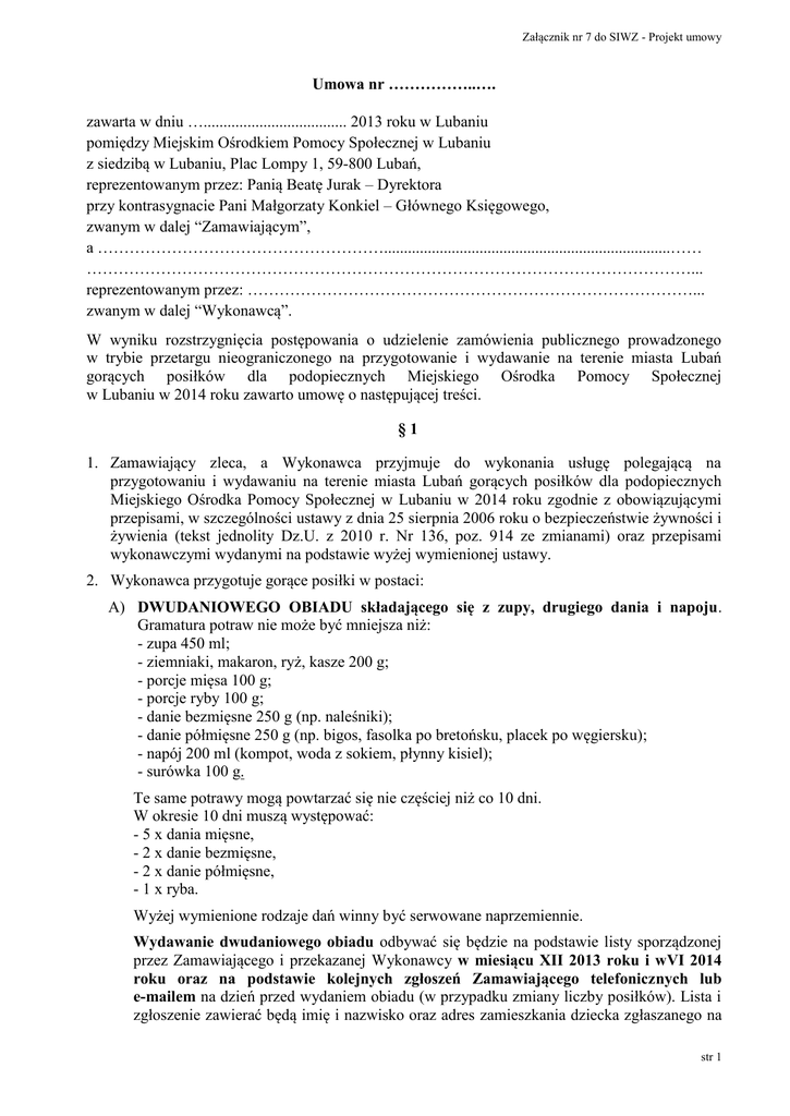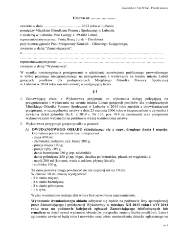 Załącznik nr 7 do SIWZ - Projekt umowy Umowa nr ……………..…. zawarta w dniu ….................................... 2013 roku w Lubaniu pomiędzy Miejskim Ośrodkiem Pomocy Społecznej w Lubaniu z siedzibą w Lubaniu, Plac Lompy 1, 59-800 Lubań, reprezentowanym przez: Panią Beatę Jurak – Dyrektora przy kontrasygnacie Pani Małgorzaty Konkiel – Głównego Księgowego, zwanym w dalej “Zamawiającym”, a ………………………………………………........................................................................…… ……………………………………………………………………………………………………... reprezentowanym przez: …………………………………………………………………………... zwanym w dalej “Wykonawcą”. W wyniku rozstrzygnięcia postępowania o udzielenie zamówienia publicznego prowadzonego w trybie przetargu nieograniczonego na przygotowanie i wydawanie na terenie miasta Lubań gorących posiłków dla podopiecznych Miejskiego Ośrodka Pomocy Społecznej w Lubaniu w 2014 roku zawarto umowę o następującej treści. §1 1. Zamawiający zleca, a Wykonawca przyjmuje do wykonania usługę polegającą na przygotowaniu i wydawaniu na terenie miasta Lubań gorących posiłków dla podopiecznych Miejskiego Ośrodka Pomocy Społecznej w Lubaniu w 2014 roku zgodnie z obowiązującymi przepisami, w szczególności ustawy z dnia 25 sierpnia 2006 roku o bezpieczeństwie żywności i żywienia (tekst jednolity Dz.U. z 2010 r. Nr 136, poz. 914 ze zmianami) oraz przepisami wykonawczymi wydanymi na podstawie wyżej wymienionej ustawy. 2. Wykonawca przygotuje gorące posiłki w postaci: A) DWUDANIOWEGO OBIADU składającego się z zupy, drugiego dania i napoju. Gramatura potraw nie może być mniejsza niż: - zupa 450 ml; - ziemniaki, makaron, ryż, kasze 200 g; - porcje mięsa 100 g; - porcje ryby 100 g; - danie bezmięsne 250 g (np. naleśniki); - danie półmięsne 250 g (np. bigos, fasolka po bretońsku, placek po węgiersku); - napój 200 ml (kompot, woda z sokiem, płynny kisiel); - surówka 100 g. Te same potrawy mogą powtarzać się nie częściej niż co 10 dni. W okresie 10 dni muszą występować: - 5 x dania mięsne, - 2 x danie bezmięsne, - 2 x danie półmięsne, - 1 x ryba. Wyżej wymienione rodzaje dań winny być serwowane naprzemiennie. Wydawanie dwudaniowego obiadu odbywać się będzie na podstawie listy sporządzonej przez Zamawiającego i przekazanej Wykonawcy w miesiącu XII 2013 roku i wVI 2014 roku oraz na podstawie kolejnych zgłoszeń Zamawiającego telefonicznych lub e-mailem na dzień przed wydaniem obiadu (w przypadku zmiany liczby posiłków). Lista i zgłoszenie zawierać będą imię i nazwisko oraz adres zamieszkania dziecka zgłaszanego na str 1 Załącznik nr 7 do SIWZ - Projekt umowy obiad. B) ZUPY. Gramatura potraw nie może być mniejsza niż: - zupa 500 ml; - chleb 100 g. C) ZUPY Z DODATKIEM. Dodatek stanowią: parówka, kaszanka, jajka, pasztet, pieczeń, ser topiony. Gramatura potraw nie może być mniejsza niż: - zupa 500 ml; - chleb 100 g; - dodatek 100 g; Wydawanie zup i zup z dodatkiem odbywać się będzie na podstawie listy sporządzonej przez Zamawiającego i przekazanej Wykonawcy w miesiącu XII 2013 roku i VI 2014 roku oraz na podstawie kolejnych zgłoszeń Zamawiającego telefonicznych lub emailem na dzień przed wydaniem zupy (w przypadku zmiany liczby posiłków). Lista i zgłoszenie zawierać będą imię i nazwisko, adres zamieszkania oraz ilość zup/zup z dodatkiem do wydania dziennie dla danej osoby. 3. Wykonawca przygotuje posiłki na bazie własnych produktów (w tym produktów sezonowych), we wszystkich wydawanych posiłkach wykonawca zapewni wartości kaloryczne i odżywcze - zgodnie z normami Instytutu Żywności i Żywienia w Warszawie. Posiłki muszą charakteryzować się dobrą jakością, posiadać walory smakowe oraz właściwą temperaturę (nie niższą niż: zupy 750C, drugie danie 630C, gorące napoje 800C), winny być urozmaicone, bez zastosowania produktów nieświeżych, o złej jakości i wysoko przetworzonych (zupy w proszku) oraz produktów zawierających ilość konserwantów przekraczających normy określone w odpowiednich przepisach. 4. Wykonawca zobowiązany będzie do wydawania posiłków gorących, przygotowanych w dniu wydawania od poniedziałku do piątku z wyłączeniem dni wolnych od pracy i dni świątecznych, z tym że: a) DWUDANIOWE OBIADY od poniedziałku do piątku; b) ZUPY od poniedziałku do czwartku; c) ZUPY Z DODATKIEM w piątki i dni poprzedzające dni wolne od pracy i dni świąteczne. 5. Obowiązujące godziny wydawania posiłków: a) dla zup i zup z dodatkiem w godzinach od 930 do 1200, b) dla dwudaniowego obiadu w godzinach od 1200 do 1530. 6. Zamawiający nie jednorazowych. dopuszcza możliwości wydawania posiłków w naczyniach 7. W godzinach wydawania posiłków w lokalu musi obowiązywać całkowity zakaz sprzedaży i spożywania alkoholu, palenia tytoniu, wprowadzania zwierząt. 8. Wykonawca w lokalu najmniej 30 osób. zapewni możliwość jednoczesnego spożywania posiłków przez co 9. Wykonawca zobowiązany jest zapewnić bezpieczeństwo osobom spożywającym posiłki w lokalu. 10. Wykonawca jest zobowiązany zapewnić w lokalu, w którym będą wydawane posiłki: niezbędne wyposażenie w ilości wystarczającej do obsługi konsumentów, personel do wydawania posiłków oraz odpowiednie termosy do przewożenia posiłków (w przypadku, gdy posiłki będą przygotowywane w innym miejscu). str 2 Załącznik nr 7 do SIWZ - Projekt umowy 11. Wydawanie dwudaniowych obiadów na wynos będzie możliwe w przypadkach szczególnych, uzgodnionych każdorazowo z przedstawicielem Zamawiającego. Posiłki na wynos nie będą mogły być wydawane w formie suchego prowiantu. Posiłki nie będą mogły być wydawane wstecz (za dni poprzednie) ani z wyprzedzeniem (za dni następne). 12. Wykonawca z