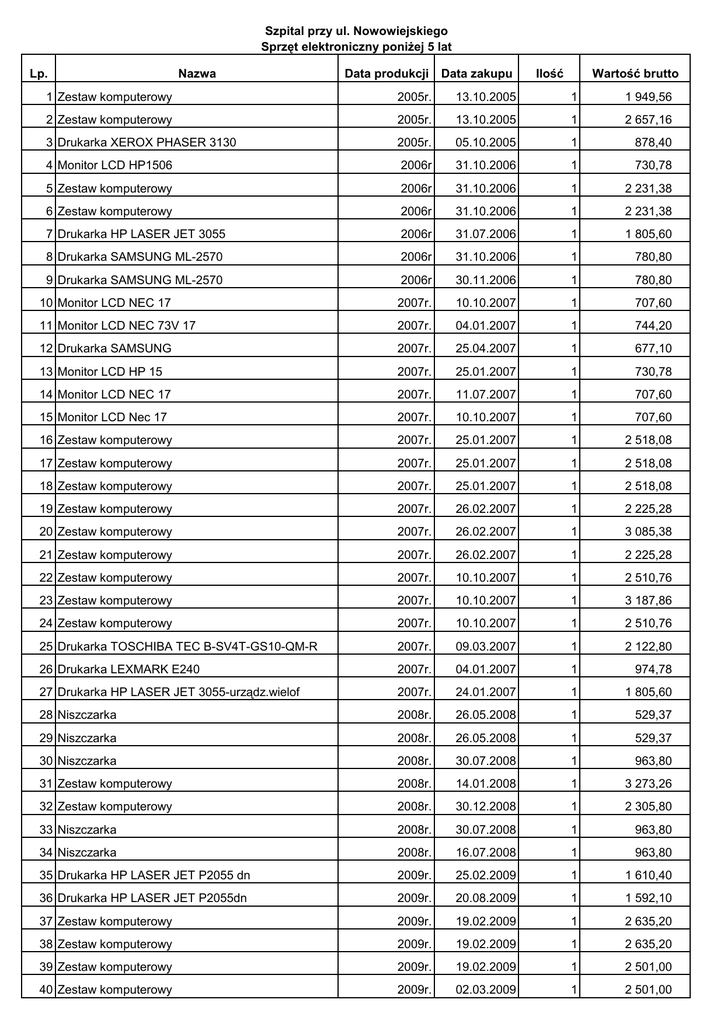 Szpital przy ul. Nowowiejskiego Sprzęt elektroniczny poniŜej 5 lat Lp. Nazwa Data produkcji Data zakupu Ilość Wartość brutto 1 Zestaw komputerowy 2005r. 13.10.2005 1 1 949,56 2 Zestaw komputerowy 2005r. 13.10.2005 1 2 657,16 3 Drukarka XEROX PHASER 3130 2005r. 05.10.2005 1 878,40 4 Monitor LCD HP1506 2006r 31.10.2006 1 730,78 5 Zestaw komputerowy 2006r 31.10.2006 1 2 231,38 6 Zestaw komputerowy 2006r 31.10.2006 1 2 231,38 7 Drukarka HP LASER JET 3055 2006r 31.07.2006 1 1 805,60 8 Drukarka SAMSUNG ML-2570 2006r 31.10.2006 1 780,80 9 Drukarka SAMSUNG ML-2570 2006r 30.11.2006 1 780,80 10 Monitor LCD NEC 17 2007r. 10.10.2007 1 707,60 11 Monitor LCD NEC 73V 17 2007r. 04.01.2007 1 744,20 12 Drukarka SAMSUNG 2007r. 25.04.2007 1 677,10 13 Monitor LCD HP 15 2007r. 25.01.2007 1 730,78 14 Monitor LCD NEC 17 2007r. 11.07.2007 1 707,60 15 Monitor LCD Nec 17 2007r. 10.10.2007 1 707,60 16 Zestaw komputerowy 2007r. 25.01.2007 1 2 518,08 17 Zestaw komputerowy 2007r. 25.01.2007 1 2 518,08 18 Zestaw komputerowy 2007r. 25.01.2007 1 2 518,08 19 Zestaw komputerowy 2007r. 26.02.2007 1 2 225,28 20 Zestaw komputerowy 2007r. 26.02.2007 1 3 085,38 21 Zestaw komputerowy 2007r. 26.02.2007 1 2 225,28 22 Zestaw komputerowy 2007r. 10.10.2007 1 2 510,76 23 Zestaw komputerowy 2007r. 10.10.2007 1 3 187,86 24 Zestaw komputerowy 2007r. 10.10.2007 1 2 510,76 25 Drukarka TOSCHIBA TEC B-SV4T-GS10-QM-R 2007r. 09.03.2007 1 2 122,80 26 Drukarka LEXMARK E240 2007r. 04.01.2007 1 974,78 27 Drukarka HP LASER JET 3055-urządz.wielof 2007r. 24.01.2007 1 1 805,60 28 Niszczarka 2008r. 26.05.2008 1 529,37 29 Niszczarka 2008r. 26.05.2008 1 529,37 30 Niszczarka 2008r. 30.07.2008 1 963,80 31 Zestaw komputerowy 2008r. 14.01.2008 1 3 273,26 32 Zestaw komputerowy 2008r. 30.12.2008 1 2 305,80 33 Niszczarka 2008r. 30.07.2008 1 963,80 34 Niszczarka 2008r. 16.07.2008 1 963,80 35 Drukarka HP LASER JET P2055 dn 2009r. 25.02.2009 1 1 610,40 36 Drukarka HP LASER JET P2055dn 2009r. 20.08.2009 1 1 592,10 37 Zestaw komputerowy 2009r. 19.02.2009 1 2 635,20 38 Zestaw komputerowy 2009r. 19.02.2009 1 2 635,20 39 Zestaw komputerowy 2009r. 19.02.2009 1 2 501,00 40 Zestaw komputerowy 2009r. 02.03.2009 1 2 501,00 Lp. Nazwa Data produkcji Data zakupu 41 Zestaw komputerowy 2009r. 30.04.2009 1 2 792,58 42 Zestaw komputerowy 2009r. 30.04.2009 1 2 330,20 43 Zestaw komputerowy 2009r. 30.04.2009 1 2 726,70 44 Zestaw komputerowy 2009r. 30.04.2009 1 2 330,20 45 Zestaw komputerowy 2009r. 29.05.2009 1 4 384,68 46 Zestaw komputerowy-serwer 2009r. 24.11.2009 1 10 785,43 47 Telefax LEXMARK 2009r. 09.03.2009 1 400,00 Razem Ilość Wartość brutto 95 277,37