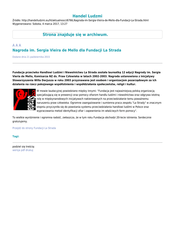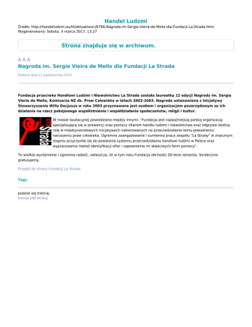 Handel Ludzmi Źródło: http://handelludzmi.eu/hl/aktualnosci/6766,Nagroda-im-Sergia-Vieira-de-Mello-dla-Fundacji-La-Strada.html Wygenerowano: Sobota, 4 marca 2017, 13:27 Strona znajduje się w archiwum. AAA Nagroda im. Sergia Vieira de Mello dla Fundacji La Strada Dodane dnia 21 października 2015 Fundacja przeciwko Handlowi Ludźmi i Niewolnictwu La Strada została laureatką 12 edycji Nagrody im. Sergia Vieria de Mello, Komisarza NZ ds. Praw Człowieka w latach 2002-2003. Nagroda ustanowiona z inicjatywy Stowarzyszenia Willa Decjusza w roku 2003 przyznawana jest osobom i organizacjom pozarządowym za ich działania na rzecz pokojowego współistnienia i współdziałania społeczeństw, religii i kultur. W mowie laudacyjnej powiedziano między innymi: "Fundacja jest najważniejszą polską organizacją specjalizującą się w prewencji oraz pomocy ofiarom handlu ludźmi i niewolnictwa oraz odgrywa istotną rolę w międzynarodowych inicjatywach nakierowanych na przeciwdziałanie temu poważnemu naruszeniu praw człowieka. Ogromne zaangażowanie i sumienna praca zespołu "La Strady" w znacznym stopniu przyczyniła się do powstania systemu przeciwdziałania handlowi ludźmi w Polsce oraz wypracowania metod identyfikacji ofiar i zapewnienia im właściwych form pomocy". To wielkie wyróżnienie i ogromna radość, zwłaszcza, że w tym roku Fundacja obchodzi 20-lecie istnienia. Serdecznie gratulujemy. Przejdź do strony Fundacji La Strada Tagi: podziel się treścią: wersja pdf drukuj