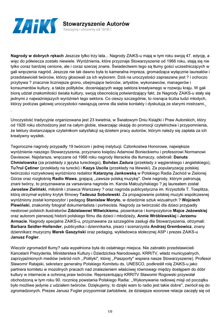 Nagrody w dobrych rękach Jeszcze tylko trzy lata... Nagrody ZAiKS-u mają w tym roku swoją 47. edycję, a więc do półwiecza zostało niewiele. Wyróżnienia, które przyznaje Stowarzyszenie od 1966 roku, stają się nie tylko coraz bardziej cenione, ale i coraz szerzej znane. Świadectwem tego są tłumy gości uczestniczących w gali wręczenia nagród. Jeszcze nie tak dawno była to kameralna impreza, gromadząca wyłącznie laureatów i przedstawicieli twórców, którzy głosowali za ich wyborem. Dziś na uroczystości zapraszane jest ? i ochoczo przybywa ? znacznie liczniejsze grono, obejmujące twórców, artystów, wykonawców, managerów i konsumentów kultury, a także polityków, doceniających wagę sektora kreatywnego w rozwoju kraju. W gali biorą udział znakomitości świata kultury, swoją obecnością potwierdzający fakt, że Nagrody ZAiKS-u stały się jednymi z najważniejszych wyróżnień tego sektora. Co cieszy szczególnie, to rosnąca liczba ludzi młodych, którzy podczas galowej uroczystości nawiązują cenne dla siebie kontakty i dyskutują ze starymi mistrzami. Uroczystość tradycyjnie organizowana jest 23 kwietnia, w Światowym Dniu Książki i Praw Autorskich, który od 1926 roku obchodzony jest na całym globie, stwarzając okazję do promocji czytelnictwa i przypomnienia, że lektury dostarczające czytelnikom satysfakcji są dziełem pracy autorów, którym należy się zapłata za ich kreatywny wysiłek. Tegoroczne nagrody przypadły 19 twórcom i jednej instytucji. Członkostwa Honorowe, największe wyróżnienie naszego Stowarzyszenia, przyznano księdzu Adamowi Bonieckiemu i profesorowi Normanowi Daviesowi. Najstarsze, wręczane od 1966 roku nagrody literackie dla tłumaczy, odebrali: Danuta Chmielowska (za przekłady z języka tureckiego), Bohdan Zadura (przekłady z węgierskiego i angielskiego), Tu?rul Çetiner (przekłady na turecki) i Kazys Uscila (przekłady na litewski). Za popularyzację polskiej twórczości rozrywkowej wyróżniono redaktor Katarzynę Jankowską w Polskiego Radia Zachód w Zielonej Górze oraz rozgłośnię Radio Wawa, grającą ,,zawsze polską muzykę''. Dwie nagrody, którym patronują znani twórcy, to przyznawana za varsaviana nagroda im. Karola Małcużyńskiego ? jej laureatem został Jarosław Zieliński, miłośnik i znawca Warszawy ? oraz nagroda publicystyczna im. Krzysztofa T. Toeplitza, którą otrzymał wybitny krytyk filmowy Tadeusz Sobolewski. Za propagowanie polskiej muzyki współczesnej wyróżniony został kompozytor i pedagog Stanisław Moryto, w dziedzinie sztuk wizualnych ? Wojciech Plewiński, znakomity fotograf dokumentalista i portrecista. Nagrody za twórczość dla dzieci przypadły nestorowi polskich ilustratorów Zdzisławowi Witwickiemu, piosenkarce i kompozytorce Majce Jeżowskiej oraz autorom pierwszej historii polskiego filmu dla dzieci i młodzieży, Annie Wróblewskiej i Jerzemu Armacie. Nagrody specjalne ZAiKS-u, przyznawane za szczególne zasługi dla Stowarzyszenia, otrzymali: Barbara Seidler-Hollender, publicystka i dziennikarka, pisarz i scenarzysta Andrzej Grembowicz, znany dziennikarz muzyczny Marek Gaszyński oraz pedagog, wykładowca stołecznej ASP i prezes ZAiKS-u Janusz Fogler. Wieczór zgromadził tłumy? sala wypełniona była do ostatniego miejsca. Nie zabrakło przedstawicieli Kancelarii Prezydenta, Ministerstwa Kultury i Dziedzictwa Narodowego, KRRiTV, władz municypalnych, zaprzyjaźnionych mediów (wśród nich ,,Polityki'', której ,,Paszporty'' wspiera nasze Stowarzyszenie). Profesor Sławomir Ratajski, sekretarz generalny Polskiego Komitetu ds. UNESCO, podkreślił rolę ZAiKS-u jako partnera komitetu w mozolnych pracach nad znalezieniem właściwej równowagi między dostępem do dóbr kultury w internecie a ochroną praw twórców. Reprezentujący KRRiTV Sławomir Rogowski przywołał obchodzoną w tym roku 90. rocznicę powstania Polskiego Radia: ,,Wykonywanie radiowej misji od początku było możliwe jedynie z udziałem twórców. Dziękujemy, to dzięki wam to radio jest takie dobre'', zwrócił się do zgromadzonych. Prezes Janusz Fogler przypomniał żartobliwie, że dzisiejsze wzorowe relacje zaczęły się od 1/5 wielkiego sporu o tantiemy należne twórcom, których Polskie Radio wraz z filharmonią nie chciały na początku swej działalności wypłacać. ,,Dziś my, artyści, twórcy, wykonawcy, mamy problem z internetem i czystymi nośnikami. Importerzy i producenci sprzętu elektronicznego robią wszystko, żeby płacić jak najmniej, staramy się jednak o to, by twórcy nie tracili''. W doskonały nastrój wprowadził wszystkich profesor Norman Davies, który swe podziękowania za przyznane mu Członkostwo Honorowe ZAiKS-u zamienił w pełne humoru i odwołań do historii ? jakże by inaczej ? wystąpienie. Uzasadnił swoje kwalifikacje członkowskie przypominając... swe wizytówki: miał mieć tytuł ,,profesor'', potem ,,historyk'', ale wybrał ,,autor''. Mówiąc o wcale licznych krytykach swej twórczości powiedział, że najbardziej atakują go Polacy. ,,W emigracyjnym piśmie nazwano mnie sowieckim agentem ? opowiadał. ? Gdy poszedłem do prawnika, by przygotować sprawę, usłyszałem: ?Dziękuj pan Bogu, że pisze pan o Polsce, a nie o Serbii. Ostatni mój klient dostał za to nożem w plecy?.'' Ale królowa brytyjska w rozmowie z nim nie pytała go, czy jego książki są subiektywne, jak uważają anglosascy historycy: ,,Chciała wiedzieć, czy są ciekawe''. Są z pewnością, potwierdzają to wysokie ich miejsca na listach bestsellerów. W wypowiedziach nagrodzonych nie brakowało goryczy. Kazys Uscila, litewski tłumacz, w poruszającej, wygłoszonej piękną i szlachetną polszczyzną przemowie, z bólem mówił o nie najlepszych stosunkach łączących dziś Litwę i Polskę. ,,W badaniach, w których Litwinów proszono o określenie największego wroga, pierwsi byli Rosjanie, co nie dziwi, ale ponad 25 procent pytanych na dru