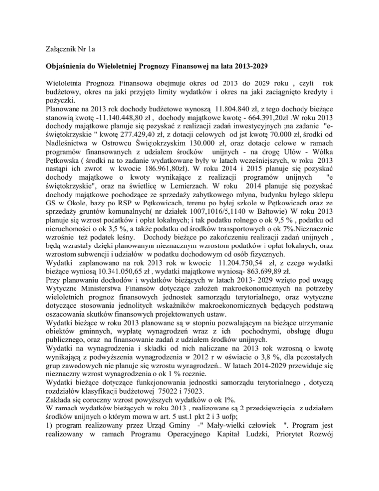 Załącznik Nr 1a Objaśnienia do Wieloletniej Prognozy Finansowej na lata 2013-2029 Wieloletnia Prognoza Finansowa obejmuje okres od 2013 do 2029 roku , czyli rok budżetowy, okres na jaki przyjęto limity wydatków i okres na jaki zaciągnięto kredyty i pożyczki. Planowane na 2013 rok dochody budżetowe wynoszą 11.804.840 zł, z tego dochody bieżące stanowią kwotę -11.140.448,80 zł , dochody majątkowe kwotę - 664.391,20zł .W roku 2013 dochody majątkowe planuje się pozyskać z realizacji zadań inwestycyjnych ;na zadanie "eświętokrzyskie " kwotę 277.429,40 zł, z dotacji celowych od jst kwotę 70.000 zł, środki od Nadleśnictwa w Ostrowcu Świętokrzyskim 130.000 zł, oraz dotacje celowe w ramach programów finansowanych z udziałem środków unijnych - na drogę Ulów - Wólka Pętkowska ( środki na to zadanie wydatkowane były w latach wcześniejszych, w roku 2013 nastąpi ich zwrot w kwocie 186.961,80zł). W roku 2014 i 2015 planuje się pozyskać dochody majątkowe o kwoty wynikające z realizacji programów unijnych "e świętokrzyskie", oraz na świetlicę w Lemierzach. W roku 2014 planuje się pozyskać dochody majątkowe pochodzące ze sprzedaży zabytkowego młyna, budynku byłego sklepu GS w Okole, bazy po RSP w Pętkowicach, terenu po byłej szkole w Pętkowicach oraz ze sprzedaży gruntów komunalnych( nr działek 1007,1016/5,1140 w Bałtowie) W roku 2013 planuje się wzrost podatków i opłat lokalnych; i tak podatku rolnego o ok 9,5 % , podatku od nieruchomości o ok 3,5 %, a także podatku od środków transportowych o ok 7%.Nieznacznie wzrośnie też podatek leśny. Dochody bieżące po zakończeniu realizacji zadań unijnych , będą wzrastały dzięki planowanym nieznacznym wzrostom podatków i opłat lokalnych, oraz wzrostom subwencji i udziałów w podatku dochodowym od osób fizycznych. Wydatki zaplanowano na rok 2013 rok w kwocie 11.204.750,54 zł, z czego wydatki bieżące wyniosą 10.341.050,65 zł , wydatki majątkowe wyniosą- 863.699,89 zł. Przy planowaniu dochodów i wydatków bieżących w latach 2013- 2029 wzięto pod uwagę Wytyczne Ministerstwa Finansów dotyczące założeń makroekonomicznych na potrzeby wieloletnich prognoz finansowych jednostek samorządu terytorialnego, oraz wytyczne dotyczące stosowania jednolitych wskaźników makroekonomicznych będących podstawą oszacowania skutków finansowych projektowanych ustaw. Wydatki bieżące w roku 2013 planowane są w stopniu pozwalającym na bieżące utrzymanie obiektów gminnych, wypłatę wynagrodzeń wraz z ich pochodnymi, obsługę długu publicznego, oraz na finansowanie zadań z udziałem środków unijnych. Wydatki na wynagrodzenia i składki od nich naliczane na 2013 rok wzrosną o kwotę wynikającą z podwyższenia wynagrodzenia w 2012 r w oświacie o 3,8 %, dla pozostałych grup zawodowych nie planuje się wzrostu wynagrodzeń.. W latach 2014-2029 przewiduje się nieznaczny wzrost wynagrodzenia o ok 1 % rocznie. Wydatki bieżące dotyczące funkcjonowania jednostki samorządu terytorialnego , dotyczą rozdziałów klasyfikacji budżetowej 75022 i 75023. Zakłada się coroczny wzrost powyższych wydatków o ok 1%. W ramach wydatków bieżących w roku 2013 , realizowane są 2 przedsięwzięcia z udziałem środków unijnych o którym mowa w art. 5 ust.1 pkt 2 i 3 uofp; 1) program realizowany przez Urząd Gminy -" Mały-wielki człowiek ". Program jest realizowany w ramach Programu Operacyjnego Kapitał Ludzki, Priorytet Rozwój wykształcenia i kompetencji w regionie , którego celem jest zakup pomocy i programów szkolnych.. Łączne nakłady finansowe na powyższy program wyniosą 119.877,50 zł , z czego limit wydatków w 2013 roku wyniesie 2.578,19 zł. 2) program realizowany przez Gminę Bałtów/ Zespół Szkół Publicznych w Bałtowie ze Stowarzyszeniem "MOTYW" w latach 2012-2014 "Przedszkole w Gminie Bałtów szansa na równy start", przy współudziale środków POKL, którego celem jest zwiększenie szans przedszkolaków na równy start. Łączne nakłady finansowe na zadanie wyniosą - 383.520 zł , z czego limit wydatków na 2013 rok wyniesie - 204.721,56 zł. W roku 2013 wydatkowane będą środki finansowe na programy, projekty lub zadania pozostałe , dotyczące: 1) zapewnienia trwałości projektu na zadanie zrealizowane w 2011 roku, dotyczące wodociągowania gminy - kwota 20.000 zł 2) zapewnienia trwałości projektu na zadanie zrealizowane w 2011 roku, dotyczące kanalizacji gminy - kwota 159.600 zł. 3) zapewnienie trwałości projektu "Super dzieci" zrealizowanego w 2012 roku, na co przeznacza się kwotę 5.000 zł 4) odbiór i zagospodarowanie odpadów komunalnych z terenu Gminy Bałtów - kwota 95.290,98 zł W ramach wydatków majątkowych realizowane są : 1) projekty z udziałem środków o których mowa w art 5 ust.1 pkt 2 i 3 ustawy o finansach publicznych,. W roku 2013 planowane są 4 programy z udziałem środków pochodzących z budżetu unii europejskiej; 1) program na dofinansowanie rozbudowy infrastruktury informatycznej JST koordynowany przez Urząd Marszałkowski ze środków EFRRWŚ, którego celem jest wsparcie innowacyjności i budowa społeczeństwa informacyjnego. Całkowity koszt projektu dla Gminy Bałtów wyniesie 285.487,48zł. Limit wydatków na rok 2013 wyniesie - 258.135,79 zł. 2) program na dofinansowanie budowy systemu informacji przestrzennej koordynowany przez Urząd Marszałkowski ze środków EFRRWŚ, którego celem jest wsparcie innowacyjności i budowa społeczeństwa informacyjnego. Projekt realizowany jest w latach 2011-2013 i jego łączne nakłady finansowe wyniosą - 85.967,67 zł. Limit wydatków w 2013 roku -to kwota 84.967,67 zł. 3) program na dofinansowanie projektu w ramach RPO Województwa Świętokrzyskiego , dotyczący Budowy drogi gminnej Nr 000051T Ulów -Wólka Pętkowska . Program będzie realizowany w latach 2011-2014 . Łączne nakłady finansowe to kwota 3.151.603 zł, z czego w 2013 roku wy