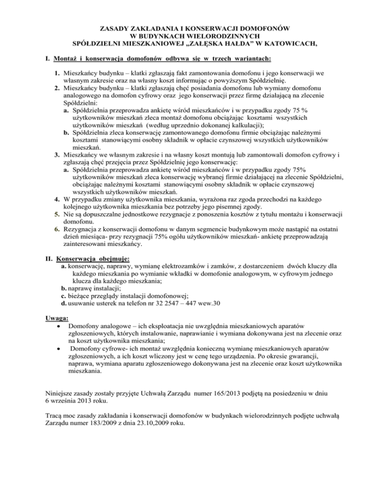 ZASADY ZAKŁADANIA I KONSERWACJI DOMOFONÓW W BUDYNKACH WIELORODZINNYCH SPÓŁDZIELNI MIESZKANIOWEJ „ZAŁĘSKA HAŁDA” W KATOWICACH, I. Montaż i konserwacja domofonów odbywa się w trzech wariantach: 1. Mieszkańcy budynku – klatki zgłaszają fakt zamontowania domofonu i jego konserwacji we własnym zakresie oraz na własny koszt informując o powyższym Spółdzielnię. 2. Mieszkańcy budynku – klatki zgłaszają chęć posiadania domofonu lub wymiany domofonu analogowego na domofon cyfrowy oraz jego konserwacji przez firmę działającą na zlecenie Spółdzielni: a. Spółdzielnia przeprowadza ankietę wśród mieszkańców i w przypadku zgody 75 % użytkowników mieszkań zleca montaż domofonu obciążając kosztami wszystkich użytkowników mieszkań (według uprzednio dokonanej kalkulacji); b. Spółdzielnia zleca konserwację zamontowanego domofonu firmie obciążając należnymi kosztami stanowiącymi osobny składnik w opłacie czynszowej wszystkich użytkowników mieszkań. 3. Mieszkańcy we własnym zakresie i na własny koszt montują lub zamontowali domofon cyfrowy i zgłaszają chęć przejęcia przez Spółdzielnię jego konserwację: a. Spółdzielnia przeprowadza ankietę wśród mieszkańców i w przypadku zgody 75% użytkowników mieszkań zleca konserwację wybranej firmie działającej na zlecenie Spółdzielni, obciążając należnymi kosztami stanowiącymi osobny składnik w opłacie czynszowej wszystkich użytkowników mieszkań. 4. W przypadku zmiany użytkownika mieszkania, wyrażona raz zgoda przechodzi na każdego kolejnego użytkownika mieszkania bez potrzeby jego pisemnej zgody. 5. Nie są dopuszczalne jednostkowe rezygnacje z ponoszenia kosztów z tytułu montażu i konserwacji domofonu. 6. Rezygnacja z konserwacji domofonu w danym segmencie budynkowym może nastąpić na ostatni dzień miesiąca- przy rezygnacji 75% ogółu użytkowników mieszkań- ankietę przeprowadzają zainteresowani mieszkańcy. II. Konserwacja obejmuje: a. konserwację, naprawy, wymianę elektrozamków i zamków, z dostarczeniem dwóch kluczy dla każdego mieszkania po wymianie wkładki w domofonie analogowym, w cyfrowym jednego klucza dla każdego mieszkania; b. naprawę instalacji; c. bieżące przeglądy instalacji domofonowej; d. usuwanie usterek na telefon nr 32 2547 – 447 wew.30 Uwaga: Domofony analogowe – ich eksploatacja nie uwzględnia mieszkaniowych aparatów zgłoszeniowych, których instalowanie, naprawianie i wymiana dokonywana jest na zlecenie oraz na koszt użytkownika mieszkania; Domofony cyfrowe- ich montaż uwzględnia konieczną wymianę mieszkaniowych aparatów zgłoszeniowych, a ich koszt wliczony jest w cenę tego urządzenia. Po okresie gwarancji, naprawa, wymiana aparatu zgłoszeniowego dokonywana jest na zlecenie oraz koszt użytkownika mieszkania. Niniejsze zasady zostały przyjęte Uchwałą Zarządu numer 165/2013 podjętą na posiedzeniu w dniu 6 września 2013 roku. Tracą moc zasady zakładania i konserwacji domofonów w budynkach wielorodzinnych podjęte uchwałą Zarządu numer 183/2009 z dnia 23.10,2009 roku.
