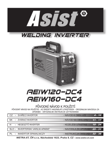 PŮVODNÍ NÁVOD K POUŽITÍ PÔVODNÝ NÁVOD NA POUŽITIE - Az eredeti használati utasítások - Originalna navodila za uporabo - Oryginalne instrukcje użytkowania CZ – SVÁŘECÍ INVERTOR SK – ZVÁRACÍ INVERTOR H – HEGESZTŐ INVERTER 4 - 10 - Návod k obsluze - Návod na obsluhu 11 - 17 - Kezelési utasítas 18 - 24 SLO– INVERTERSKI VARILNI APARAT - Navodila za uporabo 25 - 31 PL – INWERTOR SPAWALNICZY - Instrukcja obsługi 32 - 38 WETRA-XT, ČR s.r.o, Náchodská 1623, Praha 9, CZ - www.wetra-xt.com SYMBOLS Nářadí je určeno pouze pro domácí - hobby použití. Náradie je určené iba pre domáce - hobby použitie. A szerszám célja az otthoni - hobby használatra. Orodje je namenjeno izključno za domačo ali hobi uporabo. Narzędzie jest przeznaczone jedynie do użycia domowego lub hobbystycznego. Před prvním použitím si pročtěte návod k obsluze Pred prvím použitím si prečítajte návod na použitie Beüzemelés előtt olvassa el a használati utasítást Pred prvo uporabo preberite navodila za uporabo! Przed pierwszym użyciem uważnie przeczytaj instrukcję obsługi. Nebezpečí Nebezpečie Figyelmeztetés Nevarnost! Niebezpieczeństwo Používejte ochranu sluchu Používajte ochranu sluchu Használjon fülvédőt Uporabljajte zaščitna sredstva za varovanje sluha! Używaj środków ochrony słuchu Používejte ochranu zraku Používajte ochranu zraku Használjon védőszemüveget Uporabljajte zaščitna sredstva za varovanje vida! Używaj środków ochrony wzroku Používejte Ochrannou dýchací roušku Používajte ochrannú dýchaciu rúžku Használjon porvédő maszkot Uporabljajte zaščitno dihalno masko! Używaj maski ochronnej Dvojitá izolace Dvojitá izolácia Dupla szigetelés Dvojna izolacija. Podwójna izolacja Nebezpečí úrazu elektrickým proudem Nebezpečie úrazu elektrickým prúdom Áramütésveszély Nevarnost poškodbe z električnim tokom! Niebezpieczeństwo porażenia prądem elektrycznym cd cd cd cd cd cd Nevystavujte dešti nebo vodě Nevistavujte daždu alebo vode Nu expuneti la apa sau ploaie Ne izpostavljajte dežju oziroma vodi! Nie narażaj na kontakt z deszczem lub wodą Originální návod CZ AEIW120-DC4, AEIW160-DC4 - SVÁŘECÍ INVERTOR OBECNÉ BEZPEČNOSTNÍ POKYNY Tyto bezpečnostní pokyny si pečlivě prostudujte, zapamatujte a uschovejte UPOZORNĚNÍ: Při používání elektrických strojů a elektrického nářadí je nutno respektovat a dodržovat následující bezpečnostní pokyny z důvodů ochrany před úrazem elektrickým proudem, zraněním osob a nebezpečím vzniku požáru. Výrazem „elektrické nářadí“ je ve všech níže uvedených pokynech myšleno jak elektrické nářadí napájené ze sítě (napájecím kabelem), tak nářadí napájené z baterií (bez napájecího kabelu). Uschovejte všechna varovaní a pokyny pro příští použití. došlo k jeho řádnému připojení a používání. Použití těchto zařízení může omezit nebezpečí vznikající prachem. h)Pevně upevněte obrobek. Použijte truhlářskou svěrku nebo svěrák pro upevnění dílu, který budete obrábět. i) Nepoužívejte elektrické nářadí pokud jste pod vlivem alkoholu, drog, léků nebo jiných omamných či návykových látek. j) Toto zařízení není určené pro použití osobami (včetně dětí) se sníženými fyzickými, smyslovými nebo mentálními schopnostmi nebo s nedostatkem zkušeností a znalostí, pokud nejsou pod dozorem nebo nedostali pokyny s ohledem na použiti zařízení od osoby zodpovědné za jejich bezpečnost. Děti musí být pod dozorem, aby jste se ujistili, že si nehrají se zařízením. 4. Používání elektrického nářadí a jeho údržba a) El. nářadí vždy odpojte z el. sítě v případě jakéhokoliv problému při práci, před každým čistěním nebo údržbou, při každém přesunu a po ukončení práce! Nikdy nepracujte s el. nářadím, pokud je jakýmkoliv způsobem poškozené. b)Pokud začne nářadí vydávat abnormální zvuk nebo zápach, okamžitě ukončete práci. c)Elektrické nářadí nepřetěžujte. Elektrické nářadí bude pracovat lépe a bezpečněji, pokud jej budete provozovat v otáčkách, pro které bylo navrženo. Používejte správné nářadí, které je určeno pro danou činnost. Správné nářadí bude lépe a bezpečněji vykonávat práci, pro kterou bylo zkonstruováno. d)Nepoužívejte elektrické nářadí, které nelze bezpečně zapnout a vypnout ovládacím spínačem. Používání takového nářadí je nebezpečné. Vadné spínače musí být opraveny certifikovaným servisem. e)Odpojte nářadí od zdroje elektrické energie předtím, než začnete provádět jeho seřizování, výměnu příslušenství nebo údržbu. Toto opatření zamezí nebezpečí náhodného spuštění. f) Nepoužívané elektrické nářadí ukliďte a uschovejte tak, aby bylo mimo dosah dětí a nepovolaných osob. Elektrické nářadí v rukou nezkušených uživatelů může být nebezpečné. Elektrické nářadí skladujte na suchém a bezpečném místě. g)Udržujte elektrické nářadí v dobrém stavu. Pravidelně kontrolujte seřízení pohybujících se částí a jejich pohyblivost. Kontrolujte zda nedošlo k poškození ochranných krytů nebo jiných částí, které mohou ohrozit bezpečnou funkci elektrického nářadí. Je-li nářadí poškozeno, před dalším použitím zajistěte jeho řádnou opravu. Mnoho úrazů je způsobeno špatně udržovaným elektrickým nářadím. h)Řezací nástroje udržujte ostré a čisté. Správně udržované a naostřené nástroje usnadňují práci, omezují nebezpečí zranění a práce s nimi se snáze kontroluje. Použití jiných příslušenství než těch, která jsou uvedena v návodu k obsluze mohou způsobit poškození nářadí a být příčinou zranění. i) Elektrické nářadí, příslušenství, pracovní nástroje atd. používejte v sou