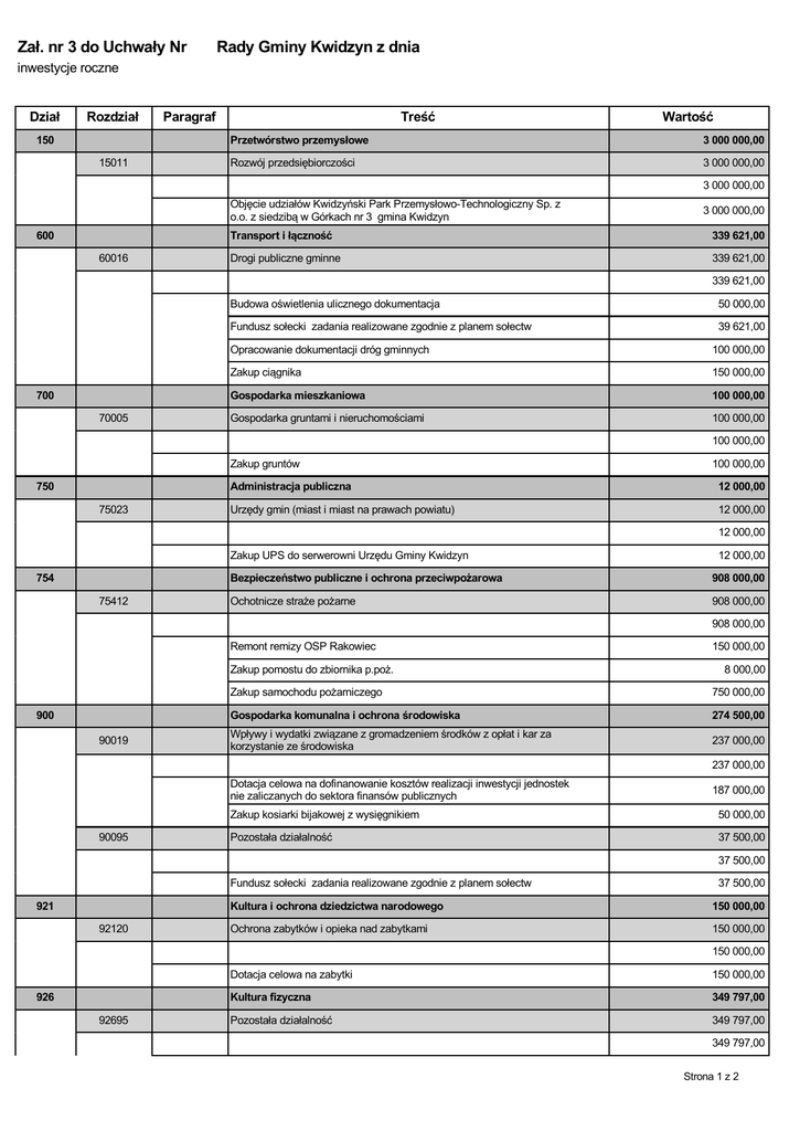 Zał. nr 3 do Uchwały Nr inwestycje roczne Dział 150 600 Rozdział 15011 Paragraf Rady Gminy Kwidzyn z dnia Przetwórstwo przemysłowe Treść Rozwój przedsiębiorczości Objęcie udziałów Kwidzyński Park Przemysłowo-Technologiczny Sp. z o.o. z siedzibą w Górkach nr 3 gmina Kwidzyn 60016 Transport i łączność Drogi publiczne gminne Budowa oświetlenia ulicznego dokumentacja Fundusz sołecki zadania realizowane zgodnie z planem sołectw 700 750 754 90019 Gospodarka gruntami i nieruchomościami Administracja publiczna Urzędy gmin (miast i miast na prawach powiatu) Bezpieczeństwo publiczne i ochrona przeciwpożarowa Ochotnicze straże pożarne 921 926 92695 339 621,00 339 621,00 50 000,00 39 621,00 150 000,00 100 000,00 100 000,00 100 000,00 12 000,00 12 000,00 12 000,00 12 000,00 908 000,00 908 000,00 908 000,00 150 000,00 Zakup samochodu pożarniczego 750 000,00 Wpływy i wydatki związane z gromadzeniem środków z opłat i kar za korzystanie ze środowiska 237 000,00 Gospodarka komunalna i ochrona środowiska Zakup kosiarki bijakowej z wysięgnikiem Pozostała działalność Fundusz sołecki zadania realizowane zgodnie z planem sołectw 92120 339 621,00 Remont remizy OSP Rakowiec Dotacja celowa na dofinanowanie kosztów realizacji inwestycji jednostek nie zaliczanych do sektora finansów publicznych 90095 3 000 000,00 100 000,00 Zakup pomostu do zbiornika p.poż. 900 3 000 000,00 Gospodarka mieszkaniowa Zakup UPS do serwerowni Urzędu Gminy Kwidzyn 75412 3 000 000,00 100 000,00 Zakup gruntów 75023 3 000 000,00 Opracowanie dokumentacji dróg gminnych Zakup ciągnika 70005 Wartość Kultura i ochrona dziedzictwa narodowego Ochrona zabytków i opieka nad zabytkami 8 000,00 274 500,00 237 000,00 187 000,00 50 000,00 37 500,00 37 500,00 37 500,00 150 000,00 150 000,00 150 000,00 Dotacja celowa na zabytki 150 000,00 Pozostała działalność 349 797,00 Kultura fizyczna 349 797,00 349 797,00 Strona 1 z 2 Fundusz sołecki zagospodarowanie przestrzeni publicznej dla celów rekreacyjno - sportowych realizowane przez sołectwa Razem 349 797,00 5 133 918,00 Strona 2 z 2