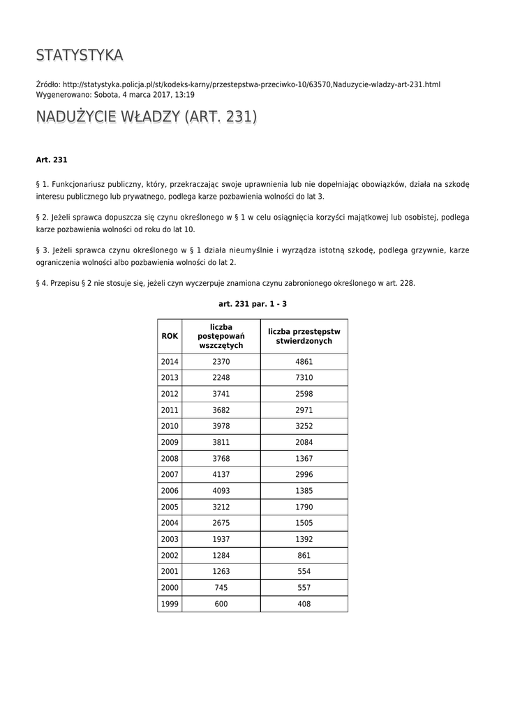 STATYSTYKA Źródło: http://statystyka.policja.pl/st/kodeks-karny/przestepstwa-przeciwko-10/63570,Naduzycie-wladzy-art-231.html Wygenerowano: Sobota, 4 marca 2017, 13:19 NADUŻYCIE WŁADZY (ART. 231) Art. 231 § 1. Funkcjonariusz publiczny, który, przekraczając swoje uprawnienia lub nie dopełniając obowiązków, działa na szkodę interesu publicznego lub prywatnego, podlega karze pozbawienia wolności do lat 3. § 2. Jeżeli sprawca dopuszcza się czynu określonego w § 1 w celu osiągnięcia korzyści majątkowej lub osobistej, podlega karze pozbawienia wolności od roku do lat 10. § 3. Jeżeli sprawca czynu określonego w § 1 działa nieumyślnie i wyrządza istotną szkodę, podlega grzywnie, karze ograniczenia wolności albo pozbawienia wolności do lat 2. § 4. Przepisu § 2 nie stosuje się, jeżeli czyn wyczerpuje znamiona czynu zabronionego określonego w art. 228. art. 231 par. 1 - 3 ROK liczba postępowań wszczętych liczba przestępstw stwierdzonych 2014 2370 4861 2013 2248 7310 2012 3741 2598 2011 3682 2971 2010 3978 3252 2009 3811 2084 2008 3768 1367 2007 4137 2996 2006 4093 1385 2005 3212 1790 2004 2675 1505 2003 1937 1392 2002 1284 861 2001 1263 554 2000 745 557 1999 600 408 Ocena: 3.3/5 (4) Tweetnij