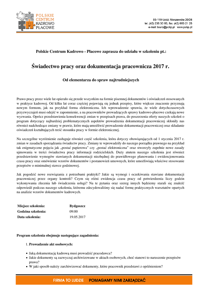Polskie Centrum Kadrowo - Płacowe zaprasza do udziału w szkoleniu pt.: Świadectwo pracy oraz dokumentacja pracownicza 2017 r. Od elementarza do spraw najtrudniejszych Prawo pracy przez wiele lat opierało się przede wszystkim na formie pisemnej dokumentów i oświadczeń stosowanych w praktyce kadrowej. Od kilku lat coraz częściej pojawiają się jednak przepisy, które większe znaczenie przyznają nowym formom, jak na przykład forma elektroniczna. Ich wprowadzenie sprawia, że wiele dotychczasowych przyzwyczajeń musi odejść w zapomnienie, a na pracowników prowadzących sprawy kadrowo-płacowe czekają nowe wyzwania. Oprócz przedstawienia konsekwencji zmian w przepisach prawa, do poszerzenia oferty naszych szkoleń o program dotyczący najbardziej problematycznych aspektów prowadzenia dokumentacji pracowniczej skłoniły nas również nadchodzące zmiany w prawie, które mają umożliwić prowadzenie dokumentacji pracowniczej oraz składanie oświadczeń kształtujących treść stosunku pracy w formie elektronicznej. Na szczególne wyróżnienie zasługuje również część szkolenia, która dotyczy obowiązujących od 1 stycznia 2017 r. zmian w zasadach sporządzania świadectw pracy. Zmiany te wprowadziły do naszego porządku prawnego na przykład tak enigmatyczne pojęcia jak „postać papierowa” czy „postać elektroniczna” oraz stworzyły zupełnie nowe zasady ujmowania w treści świadectwa pracy informacji rodzicielskich. Duży atutem naszego szkolenia jest również przedstawienie wymogów stawianych dokumentacji niezbędnej do prawidłowego planowania i ewidencjonowania czasu pracy oraz omówienie wzorów dokumentów i postanowień umownych, które umożliwiają właściwe stosowanie przepisów o minimalnej stawce godzinowej. Jak pogodzić nowe rozwiązania z potrzebami praktyki? Jakie są wymogi i oczekiwania stawiane dokumentacji pracowniczej przez organy kontroli? Czym się różni ewidencja czasu pracy od potwierdzenia liczy godzin wykonywania zlecenia lub świadczenia usługi? Na te pytania oraz szereg innych będziemy starali się znaleźć odpowiedź podczas naszego szkolenia, któremu zdecydowaliśmy się nadać formę praktycznych warsztatów opartych na analizie wzorów dokumentów kadrowych. Miejsce szkolenia: Bydgoszcz Godzina szkolenia: 09:00 Data szkolenia: 19.05.2017 Program szkolenia obejmuje następujące zagadnienia: 1. Prowadzenie akt osobowych: Jaką dokumentację kadrową musi prowadzić pracodawca? Jakie dokumenty są zazwyczaj archiwizowane w aktach osobowych, choć stanowi to naruszenie przepisów prawa? W jaki sposób należy zarchiwizować dokumenty, które pracownik przedstawi z opóźnieniem? Jakie są zasady zgodnej z prawem ingerencji w dokumenty zgromadzone w aktach osobowych? Czy oświadczenia złożone w postaci elektronicznej podlegają archiwizacji w aktach osobowych? Kto ponosi odpowiedzialność za nieprawidłowe prowadzenie dokumentacji pracowniczej? 2. Nawiązanie stosunku pracy: Jakie są konsekwencje stosowania nieprawidłowych kwestionariuszy osobowych? W jakich sytuacjach można odstąpić od aktualizacji informacji o dodatkowych warunkach zatrudnienia? Instrukcja prawidłowego sporządzenia umowy o pracę w oparciu o wzór umowy o pracę; Czy w umowie o pracę zawartej w celu zastępstwa należy wskazane dane osoby zastępowanej oraz rodzaj usprawiedliwionej nieobecności? W jaki sposób powinno się określać wyłącznie umowy o pracę na czas określony spod ustawowych limitów? Czy przekształcenie umowy na czas określony w umowę na czas nieokreślony należy potwierdzić w formie pisemnej? Potwierdzenie przedłużenia umowy o pracę do dnia porodu. 3. Ustanie oraz zmiana stosunku pracy: Jakie elementy należy uwzględnić w porozumieniu o zmianie treści/rozwiązaniu umowy o pracę? Oświadczenie o wypowiedzeniu umowy o pracę a oświadczenie o rozwiązaniu umowy o pracę bez zachowania okresu wypowiedzenia; W jaki sposób pozyskiwać informację, która organizacja związkowa reprezentuje pracownika, jeśli w zakładzie działa więcej niż jedna organizacja związkowa? Jakie informacje należy zawrzeć w poleceniu, mocą którego następuje zwolnienie pracownika z obowiązku świadczenia pracy? Jak powinno być sformułowane porozumienie stron o zwolnieniu z obowiązku świadczenia pracy? Jakie informacje należy zawrzeć w poleceniu wykorzystania urlopu wypoczynkowego w okresie wypowiedzenia? Jakie elementy powinno zawierać porozumienie o przeniesieniu prawa do urlopu wypoczynkowego na kolejny stosunek pracy? 4. Sporządzenie świadectwa pracy od 1 stycznia 2017 r. W jakich sytuacjach należy wydać świadectwo pracy w nowym stanie prawnym? Jak pogodzić nowe zasady wydawania świadectw pracy z dotychczasowymi regułami? W jakich sytuacjach konieczne jest wydanie świadectwa pracy do 30 czerwca 2017 r.? Co oznacza postać papierowa lub elektroniczna wniosku o wydanie świadectwa pracy? Jaki poprawnie liczyć terminy związane z powstaniem obowiązku wydania świadectwa pracy? W jakich sytuacjach pracodawca musi wydać świadectwa pracy w dniu rozwiązania stosunku pracy a w ciągu 7 dni od dnia ustania stosunku pracy? Czy świadectwo pracy można wydać za pośrednictwem firmy kurierskiej? Jakie konsekwencje niesie nadanie charakteru pomocniczego wzorowi świadectwa pracy? Czy świadectwo pracy może zostać sporządzone w sposób zupełnie odmienny od wzoru stanowiącego załącznik do rozporządzenia? Jakie dokumenty związane z wydaniem świadectwa pracy mogą być sporządzone w postaci papierowej lub elektronicznej, a jakie wymagają zastosowania formy pisemnej? Czy pracownik może SMS-em bądź za pomocą poczty elektronicznej żądać sprostowania świadectwa pracy? W jakich sytuacjach i w jaki sposób należy wskazać w świadectwie pracy podstawę prawną rozwiązania stosunku pracy (np. art. 52 Kodeksu pracy)? W jakich sytuacjach należy w świadectwie pracy zawrzeć informację o wykorzystan
