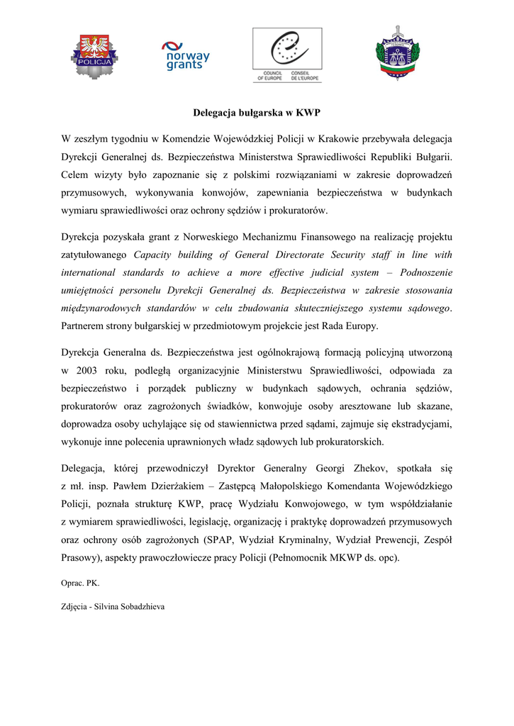Delegacja bułgarska w KWP W zeszłym tygodniu w Komendzie Wojewódzkiej Policji w Krakowie przebywała delegacja Dyrekcji Generalnej ds. Bezpieczeństwa Ministerstwa Sprawiedliwości Republiki Bułgarii. Celem wizyty było zapoznanie się z polskimi rozwiązaniami w zakresie doprowadzeń przymusowych, wykonywania konwojów, zapewniania bezpieczeństwa w budynkach wymiaru sprawiedliwości oraz ochrony sędziów i prokuratorów. Dyrekcja pozyskała grant z Norweskiego Mechanizmu Finansowego na realizację projektu zatytułowanego Capacity building of General Directorate Security staff in line with international standards to achieve a more effective judicial system – Podnoszenie umiejętności personelu Dyrekcji Generalnej ds. Bezpieczeństwa w zakresie stosowania międzynarodowych standardów w celu zbudowania skuteczniejszego systemu sądowego. Partnerem strony bułgarskiej w przedmiotowym projekcie jest Rada Europy. Dyrekcja Generalna ds. Bezpieczeństwa jest ogólnokrajową formacją policyjną utworzoną w 2003 roku, podległą organizacyjnie Ministerstwu Sprawiedliwości, odpowiada za bezpieczeństwo i porządek publiczny w budynkach sądowych, ochrania sędziów, prokuratorów oraz zagrożonych świadków, konwojuje osoby aresztowane lub skazane, doprowadza osoby uchylające się od stawiennictwa przed sądami, zajmuje się ekstradycjami, wykonuje inne polecenia uprawnionych władz sądowych lub prokuratorskich. Delegacja, której przewodniczył Dyrektor Generalny Georgi Zhekov, spotkała się z mł. insp. Pawłem Dzierżakiem – Zastępcą Małopolskiego Komendanta Wojewódzkiego Policji, poznała strukturę KWP, pracę Wydziału Konwojowego, w tym współdziałanie z wymiarem sprawiedliwości, legislację, organizację i praktykę doprowadzeń przymusowych oraz ochrony osób zagrożonych (SPAP, Wydział Kryminalny, Wydział Prewencji, Zespół Prasowy), aspekty prawoczłowiecze pracy Policji (Pełnomocnik MKWP ds. opc). Oprac. PK. Zdjęcia - Silvina Sobadzhieva Spotkanie w KWP Wydział Konwojowy – aspekty praktyczne służby Wydział Konwojowy - prezentacja SPAP