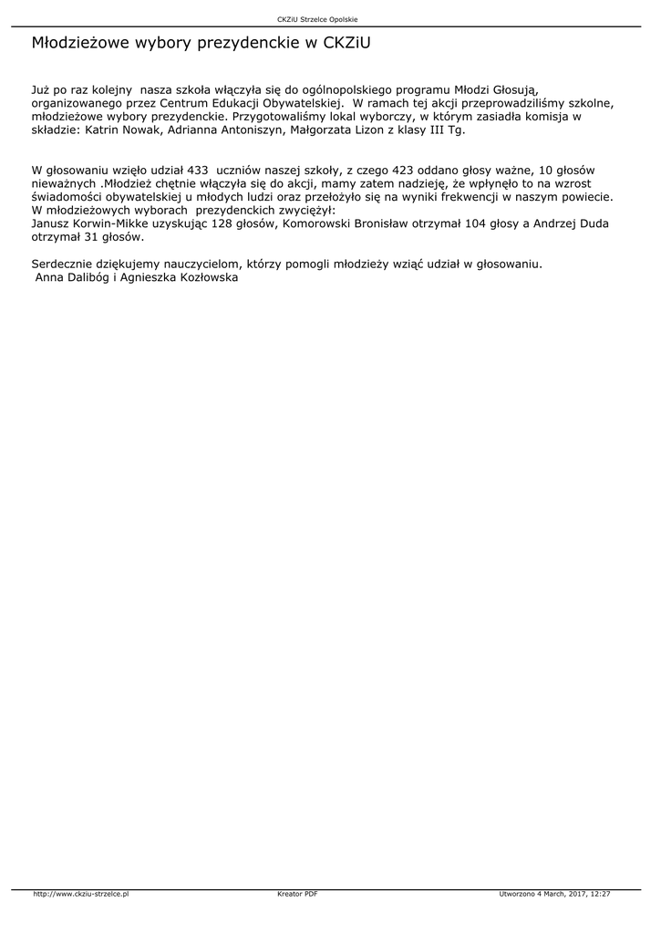 CKZiU Strzelce Opolskie Młodzieżowe wybory prezydenckie w CKZiU Już po raz kolejny nasza szkoła włączyła się do ogólnopolskiego programu Młodzi Głosują, organizowanego przez Centrum Edukacji Obywatelskiej. W ramach tej akcji przeprowadziliśmy szkolne, młodzieżowe wybory prezydenckie. Przygotowaliśmy lokal wyborczy, w którym zasiadła komisja w składzie: Katrin Nowak, Adrianna Antoniszyn, Małgorzata Lizon z klasy III Tg. W głosowaniu wzięło udział 433 uczniów naszej szkoły, z czego 423 oddano głosy ważne, 10 głosów nieważnych .Młodzież chętnie włączyła się do akcji, mamy zatem nadzieję, że wpłynęło to na wzrost świadomości obywatelskiej u młodych ludzi oraz przełożyło się na wyniki frekwencji w naszym powiecie. W młodzieżowych wyborach prezydenckich zwyciężył: Janusz Korwin-Mikke uzyskując 128 głosów, Komorowski Bronisław otrzymał 104 głosy a Andrzej Duda otrzymał 31 głosów. Serdecznie dziękujemy nauczycielom, którzy pomogli młodzieży wziąć udział w głosowaniu. Anna Dalibóg i Agnieszka Kozłowska http://www.ckziu-strzelce.pl Kreator PDF Utworzono 4 March, 2017, 12:27