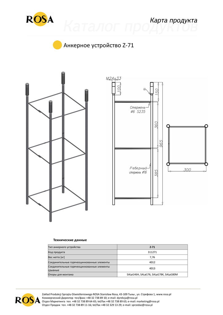 Анкерное устройство Z-71 Технические данные Тип анкерного устройства Z-71 Код продукта 311271 Вес нетто [кг] 7,76 Соединительные горячеоцинкованные элементы Соединительные горячеоцинкованные элементы срывные Опоры для монтажа 4012 4013 SALø146H, SALø176, SALø178K, SALø180M Zakład Produkcji Sprzętu Oświetleniowego ROSA Stanisław Rosa, 43-109 Tыхы , ул. Стрефова 1, www.rosa.pl Коммерческий Директор тел/факс +48 32 738 89 10; e-mail: [email protected] Отдел Маркетинга тел. +48 32 738 89 64-65; tel/fax +48 32 738 89 63; e-mail: [email protected] Отдел Продаж тел. +48 32 738 89 11-16; tel/fax +48 32 329 13 29; e-mail: [email protected]