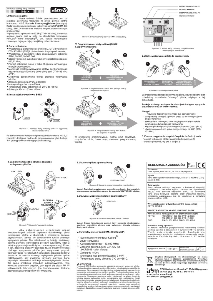 DIODA SYGNALIZACYJNA PP Instrukcja obsługi karty radiowej PRZYCISK KANAŁ PP S-MIX DIODA SYGNALIZACYJNA FU DTM 433 MHz (ZSP) i pilotami wielu innych producentów; 4Współpraca z centralami NICE obsługującymi odbiorniki SMXI, SMXIS, SMXIF, OXI; 4Stabilny odbiornik superheterodynowy, częstotliwość pracy: 433,92 Mhz; 4Pamięć odbiornika mieści w sobie 35 pilotów różnego typu, różnych producentów; 4Możliwość prostego wpisywania pilotów, bez konieczności używania przycisków karty (tylko piloty serii DTM 433 MHz (ZSP) ; 4Możliwość zablokowania funkcji prostego wpisywania pilotów; 4Zasilanie odbiornika 5V DC, z centrali; 4Maksymalny pobór prądu 15mA ; 4Temperatura pracy odbiornika od -20°C do +55°C; 4Gabaryty: 42mm x 33mm x10mm. Rysunek 2. Instalacja karty radiowej S-MIX bez obudowy. IV. Programowanie karty radiowej S-MIX 1. Wpisywanie pilota Rysunek 5. Widok karty radiowej z objaśnieniem ważniejszych elementów. 1 2 2. Zdalne wpisywanie pilota do pamięci karty WCISNĄĆ I PRZYTRZYMAĆ PRZYCISK "PP" + PRZYCISNĄĆ ODPOWIEDNI PRZYCISK NOWEGO PILOTA WCISNĄĆ DOWOLNY PRZYCISK "STAREGO" PILOTA NA Rysunek 3. Programowanie funkcji "PP" (krok po kroku) dla przycisku nr 1 pilota. Funkcja zdalnego wpisywania pilota jest dostępna wyłącznie dla pilotów serii ZSP (DTM 433 MHz). 2 1 CZAS 2 NICE WCISNĄĆ I PRZYTRZYMAĆ PRZYCISK "FU" Rysunek 1. Instalacja karty radiowej S-MIX w oryginalnej obudowie radia NICE. Po zamontowaniu karty w oryginalnej obudowie radia NICE, z zewnątrz dostępna będzie do programowania tylko funkcja ’PP’ (dostęp tylko do jednego przycisku karty). 4. Zablokowanie / odblokowanie zdalnego wpisywania pilotów. + PRZYCISNĄĆ ODPOWIEDNI PRZYCISK NOWEGO PILOTA Rysunek 4. Programowanie funkcji “FU” (furtka) dla przycisku nr 2 pilota. W procedurze programowania, można użyć dowolnych przycisków pilota, które mają sterować programowaną funkcją. 5. Usunięcie pilota z pamięci karty 2 1 2 MAX. 3 SEK. 1 MIN. 5 SEK. USUWANY PILOT Rysunek 8. Usuwanie pojedynczego pilota z pamięci karty. Uwaga! Zbyt długie przytrzymanie przycisków na karcie, doprowadzi do sformatowania pamięci i tym samym do usunięcia WSZYSTKICH pilotów. 6. Usuwanie wszystkich pilotów z pamięci karty BLOKADA ZOSTAŁA WŁĄCZONA 3. Zmiana przypisania przycisków pilota do funkcji karty 4usunąć wybranego pilota z pamięci karty (patrz pkt.5) 4dopisać ponownie, wg pkt. 1 lub pkt 2. DEKLARACJA ZGODNOŚCI Nr 01/2011 Wyrób Karta zdalnego sterowania radiowego, serii: DTM 433MHz (ZSP) model: S-MIX Opis wyrobu Karta radiowa zdalnego sterowania o kodowanej transmisji, posiadająca 2 sterowane wyjścia, pracująca na częstotliwości 433,92 Mhz. Zasilana napięciem 5VDC. Do sterowania kartą służą bateryjnie zasilane piloty (nadajniki) radiowe, Urządzenie przeznaczone jest do współpracy z centralami bramowymi firmy NICE. 15 SEKUND Wyrób jest zgodny z Dyrektywami Unii Europejskiej: R&TTE 99/5/EC BLOKADA BEZ BLOKADY Uwaga! Nieudane dopisanie pilota może być spowodowane: 4 słabą baterią któregoś z pilotów, przez co nie wytrzymuje on długiej transmisji, 4 zakłóceniami radiowymi, które mogły pojawić się w trakcie trwania procedury zdalnego wpisywania 4 włączoną blokadą funkcji zdalnego wpisywania (patrz pkt. 4) 4 użyciem w procedurze, pilota innego rodzaju niż ZSP (DTM 433 MHz). Producent DTM System, ul.Brzeska 7, PL 85-145 Bydgoszcz 11 1 3 WCISNĄĆ DOWOLNY PRZYCISK "NOWEGO" PILOTA NA 15 SEKUND W procedurze zdalnego dopisywania pilota, nowo dopisany pilot dziedziczy ustawienia "starego" pilota, użytego w tej procedurze. 1 3 CZAS PRZERWY MAKSYMALNIE 3 SEKUNDY Rysunek 6. Zdalne wpisywanie pilota. III. Instalacja karty radiowej S-MIX S-MIX 2 1 CZAS II. Dane techniczne 4Współpraca z pilotami Nice serii SMILO, DTM System serii PRZYCISK KANAŁ FU CZAS I. Informacje ogólne Karta radiowa S-MIX przeznaczona jest do realizacji sterowania radiowego na płycie głównej central bramowych NICE. Posiada 2 kanały wyjściowe (sterujące). Karta współpracuje z pilotami radiowymi serii ZSP (DTM 433 MHz), SMILO (Nice) oraz wieloma innymi pilotami różnych producentów. W połączeniu z pilotami serii ZSP (DTM 433 MHz), transmisja sygnału oparta jest w pełni na standardzie kodowania KeeLoq® firmy Microchip®, tzw. kodzie dynamicznie zmiennym, dającym najwyższej klasy zabezpieczenie. SPRZĘT RADIOWY W KLASIE 1 WEDŁUG R&TTE 4 Rysunek 9. Usuwanie wszystkich pilotów z pamięci. Rysunek 7. Włączenie / wyłączenie blokady. Aby zabezpieczyć urządzenie przed nieuprawnionymi próbami dopisania dodatkowego pilota (szczególnie istotne w obszarach o chronionym dostępie użytkowników), zaleca się zablokowanie funkcji zdalnego wpisywania pilotów. Aby zablokować tę funkcję, naciskamy obydwa przyciski jednocześnie po czym puszczamy jeden z nich (drugi pozostaje naciśnięty az do końca procedury). Po ok. 4 sek. zapali się dioda PP (oznacza to, że aktualnie blokada zdalnego wpisywania pilotów jest wyłączona), przycisk trzymamy dalej. Po kolejnych 4 sekundach zapali się dioda FU (oznacza, że funkcja zdalnego wpisywania pilotów będzie zablokowana), gdy zwolnimy trzymany przycisk, karta zapamięta ustawienia i zablokuje zdalne wpisywanie pilotów. Tak samo przebiega procedura odblokowywania, tylko wówczas zwalniamy przycisk, gdy zapali się dioda PP. W ustawieniach fabrycznych (po formatowaniu), blokada zdalnego wpisywania pilotów jest wyłączona. Uwaga! Proces formatowania pamięci karty powoduje nieodwracalne usunięcie wszystkich pilotów oraz wyłączenie blokady zdalnego dopisywania pilotów. V. Parametry pilotów serii DTM 433 MHz (ZSP) 4 System zmiennokodowy Keeloq ; 4 2 lub 4 przyciski; 4 Częstotliwość pracy - 433,92 MHz; 4 Zasilanie baterią L1028 23A 12V lub 2xCR2016 - pilot Victory; 4 Zasięg do 150m; 4 Skuteczna moc promieniowania: 3 mW; 4 Temperatura pracy pilota od 0°C do +55°C. VI. Gwarancja Producent DTM System, przekazuje urz