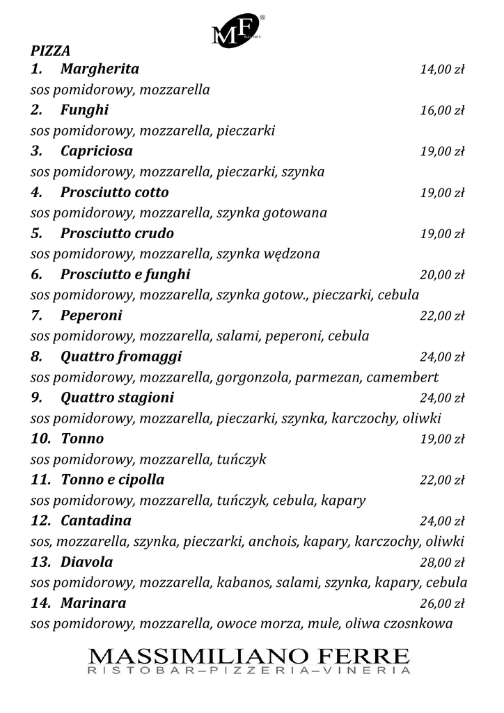 PIZZA 1. Margherita 14,00 zł sos pomidorowy, mozzarella 16,00 zł 2. Funghi sos pomidorowy, mozzarella, pieczarki 3. Capriciosa 19,00 zł sos pomidorowy, mozzarella, pieczarki, szynka 19,00 zł 4. Prosciutto cotto sos pomidorowy, mozzarella, szynka gotowana 5. Prosciutto crudo 19,00 zł sos pomidorowy, mozzarella, szynka wędzona 6. Prosciutto e funghi 20,00 zł sos pomidorowy, mozzarella, szynka gotow., pieczarki, cebula 22,00 zł 7. Peperoni sos pomidorowy, mozzarella, salami, peperoni, cebula 8. Quattro fromaggi 24,00 zł sos pomidorowy, mozzarella, gorgonzola, parmezan, camembert 9. Quattro stagioni 24,00 zł sos pomidorowy, mozzarella, pieczarki, szynka, karczochy, oliwki 10. Tonno 19,00 zł sos pomidorowy, mozzarella, tuńczyk 11. Tonno e cipolla 22,00 zł sos pomidorowy, mozzarella, tuńczyk, cebula, kapary 12. Cantadina 24,00 zł sos, mozzarella, szynka, pieczarki, anchois, kapary, karczochy, oliwki 13. Diavola 28,00 zł sos pomidorowy, mozzarella, kabanos, salami, szynka, kapary, cebula 14. Marinara 26,00 zł sos pomidorowy, mozzarella, owoce morza, mule, oliwa czosnkowa PIZZA 15. Gambaretti 28,00 zł sos pomidorowy, mozzarella, krewetki, scampi, oliwa czosnkowa 16. Zarina 29,00 zł sos pom., mozzarella, wędzony łosoś, krewetki, szczypior, twaróg 23,00 zł 17. Hawai sos pomidorowy, mozzarella, pieczarki, szynka, ananas 18. Dosutto 28,00 zł sos pomidorowy, mozzarella, szynka parmeńska, rucola 19. Rucola 24,00 zł sos pomidorowy, mozzarella, rucola, suszone pomidory 19,00 zł 20. Bolognese sos bolognese, mozzarella 21. Farmerska 24,00 zł sos pomidorowy, mozzarella, kurczak, pieczarki, kukurydza, curry 22. Spinaci 26,00 zł sos pomidorowy, mozzarella, szpinak, gorgonzola, oliwa czosnkowa 23. Rustica 25,00 zł sos pomidorowy, mozzarella, pieczarki, bekon, jajko, cebula 27,00 zł 24. Rzeźnicka sos pomidorowy, mozzarella, szynka, kabanos, salami, cebula 25. Wegetariana 25,00 zł sos pomidorowy, mozzarella, pomidor, brokuł, papryka, karczochy, pieczarki, cebula Dodatkowo do pizzy: Cebula, czosnek, papryka, sos pomidorowy, parmezan Pieczarki, kukurydza, pomidory, oliwki, camembert Wędliny, kurczak, szynka gotow., ser mozzarella, tuńczyk Szynka parmeńska, gorgonzola, karczochy, kapary, anchois Ryby, owoce morza, scampi,mule 3,00 zł 6,00 zł 8,00 zł 11,00 zł 12,00 zł