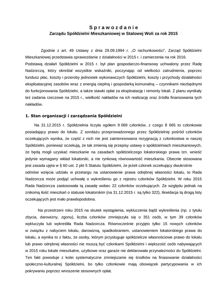 Sprawozdanie Zarządu Spółdzielni Mieszkaniowej w Stalowej Woli za rok 2015 Zgodnie z art. 49 Ustawy z dnia 29.09.1994 r. „O rachunkowości”, Zarząd Spółdzielni Mieszkaniowej przedstawia sprawozdanie z działalności w 2015 r. i zamierzenia na rok 2016. Podstawą działań Spółdzielni w 2015 r. był plan gospodarczo-finansowy uchwalony przez Radę Nadzorczą, który określał wszystkie wskaźniki, poczynając od wielkości zatrudnienia, poprzez fundusz płac, koszty i przeroby jednostek wykonawczych Spółdzielni, koszty i przychody działalności eksploatacyjnej zasobów wraz z energią cieplną i gospodarką komunalną – czynnikami niezbędnymi do funkcjonowania Spółdzielni, a także stawki opłat za eksploatację i remonty lokali. Z planu wynikały też zadania rzeczowe na 2015 r., wielkość nakładów na ich realizację oraz źródła finansowania tych nakładów. 1. Stan organizacji i zarządzania Spółdzielni Na 31.12.2015 r. Spółdzielnia liczyła ogółem 9 069 członków, z czego 8 665 to członkowie posiadający prawo do lokalu. Z sondażu przeprowadzonego przez Spółdzielnię pośród członków oczekujących wynika, że część z nich nie jest zainteresowana rezygnacją z członkostwa w naszej Spółdzielni, ponieważ oczekują, że tak zmienią się przepisy ustawy o spółdzielniach mieszkaniowych, że będą mogli uzyskać mieszkanie na zasadach spółdzielczego lokatorskiego prawa tzn. wnieść jedynie wymagany wkład lokatorski, a nie rynkową równowartość mieszkania. Obecnie stosowana jest zasada ujęta w § 60 ust. 2 pkt 5 Statutu Spółdzielni, że jeżeli członek oczekujący dwukrotnie odmówi wzięcia udziału w przetargu na ustanowienie prawa odrębnej własności lokalu, to Rada Nadzorcza może podjąć uchwałę o wykreśleniu go z rejestru członków Spółdzielni. W roku 2015 Rada Nadzorcza zastosowała tą zasadę wobec 22 członków oczekujących. Ze względu jednak na znikomą ilość mieszkań o statusie lokatorskim (na 31.12.2015 r. są tylko 322), likwidacja tą drogą listy oczekujących jest mało prawdopodobna. Na przestrzeni roku 2015 na skutek wystąpienia, wykluczenia bądź wykreślenia (np. z tytułu zbycia, darowizny, zgonu), liczba członków zmniejszyła się o 351 osób, w tym 39 członków wykluczyła lub wykreśliła Rada Nadzorcza. Równocześnie przyjęto tylko 15 nowych członków w związku z nabyciem lokalu, darowizną, spadkobraniem, ustanowieniem lokatorskiego prawa do lokalu, a wynika to z faktu, że osoby, którym przysługuje spółdzielcze własnościowe prawo do lokalu lub prawo odrębnej własności nie muszą być członkami Spółdzielni i większość osób nabywających w 2015 roku lokale mieszkalne, użytkowe oraz garaże nie deklarowała przynależności do Spółdzielni. Ten fakt powoduje z kolei systematyczne zmniejszanie się środków na finasowanie działalności społeczno-kulturalnej Spółdzielni, bo tylko członkowie mają obowiązek partycypowania w ich pokrywaniu poprzez wnoszenie stosownych opłat. 2 W 2015 roku zawarto kolejnych 56 umów o ustanowienie odrębnej własności lokali. Spowodowało to zmniejszenie majątku Spółdzielni zarówno w ilości i wartości gruntów własnych o ok. 2,5 tys. m 2 na kwotę 206 tys. zł. Łącznie na koniec 2015 r. Spółdzielnia zarządza 6 138 lokalami wyodrębnionymi, w tym: - 5 950 mieszkaniami, - 153 garażami, 35 lokalami użytkowymi. Pozostało na majątku Spółdzielni: - 4 738 mieszkań w tym: - 322 mieszkania lokatorskie (z czego 58 bez tytułu prawnego) - 4 365 mieszkań własnościowych - 51 mieszkań w najmie (z czego 6 bez tytułu prawnego) - 707 garaży - 292 lokale użytkowe oraz 594 tys. m2 gruntów o wartości ok. 17,5 mln. zł. Według stanu na 31.12.2015 r. mieszkania będące majątkiem Spółdzielni stanowią 44,3 % ogółu mieszkań zarządzanych przez Spółdzielnię. Organizacja działalności Spółdzielni, w tym zasady zarządzania zasobami ustalane są odpowiednimi uchwałami Rady Nadzorczej i Zarządu. Elementami struktury organizacyjnej Spółdzielni są komórki funkcjonalne, samodzielne stanowiska pracy, Administracje Osiedli, Spółdzielczy Dom Kultury, zarządzający także klubem osiedlowym „Emka”. Komórkami tymi kierowali odpowiednio kierownicy działów, Kierownicy Administracji Osiedli, trzy w Stalowej Woli i jedna w Rudniku nad Sanem, Kierownik Zakładu Budowlano–Remontowego, Kierownik Zakładu Instalacyjno-Dźwigowego i Dyrektor Spółdzielczego Domu Kultury. W stosunku do ogólnej ilości 225 osób zatrudnionych na koniec 2015 r. kadra kierownicza, łącznie z Zarządem stanowiła 6,2 %. Pod względem poziomu wykształcenia 57,1 % osób zajmujących stanowiska kierownicze i samodzielne posiada wykształcenie wyższe, pozostałe osoby legitymują się średnim wykształceniem kierunkowym, a także długim stażem pracy. Zarówno kadra kierownicza, jak i pozostali pracownicy doskonalą umiejętności zawodowe poprzez udział w różnego typu szkoleniach i kursach, co ma szczególne znaczenie wobec częstej zmiany obowiązujących bądź wprowadzania nowych przepisów prawa (Prawo spółdzielcze, budowlane, Kodeks Pracy, przepisy dotyczące podatków, świadczeń z ubezpieczeń społecznych i inne). W 2015 roku z różnych form podnoszenia kwalifikacji w 40 szkoleniach 29 pracowników, natomiast z obowiązkowych szkoleń wstępnych i okresowych skorzystało w zakresie bhp i ppoż. – 152 osoby. W tym okresie w Spółdzielni Mieszkaniowej staż pracy odbywało 2 bezrobotnych. Ponadto z Urzędu Pracy otrzymaliśmy pomoc na prace interwencyjne – 1 stanowisko: inspektor ds. organizacji i samorządu do 28.03.2015 r. 3 Na przestrzeni 2015 r. pracownikom i zleceniobiorcom zostały wypłacone wynagrodzenia w wysokości 10 904 tys. zł, w tym z osobowego funduszu płac 10 713 tys. zł. Średnia płaca brutto wyniosła 3 835,76 zł. W okresie sprawozdawczym Zarząd, jako organ Samorządu Spółdzielni pracował 
