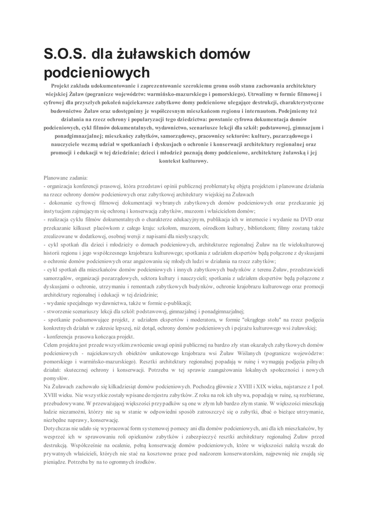 S.O.S. dla żuławskich domów podcieniowych Projekt zakłada udokumentowanie i zaprezentowanie szerokiemu gronu osób stanu zachowania architektury wiejskiej Żuław (pogranicze województw: warmińsko-mazurskiego i pomorskiego). Utrwalimy w formie filmowej i cyfrowej dla przyszłych pokoleń najciekawsze zabytkowe domy podcieniowe ulegające destrukcji, charakterystyczne budownictwo Żuław oraz udostępnimy je współczesnym mieszkańcom regionu i internautom. Podejmiemy też działania na rzecz ochrony i popularyzacji tego dziedzictwa: powstanie cyfrowa dokumentacja domów podcieniowych, cykl filmów dokumentalnych, wydawnictwo, scenariusze lekcji dla szkół: podstawowej, gimnazjum i ponadgimnazjalnej; mieszkańcy zabytków, samorządowcy, pracownicy sektorów: kultury, pozarządowego i nauczyciele wezmą udział w spotkaniach i dyskusjach o ochronie i konserwacji architektury regionalnej oraz promocji i edukacji w tej dziedzinie; dzieci i młodzież poznają domy podcieniowe, architekturę żuławską i jej kontekst kulturowy. Planowane zadania: - organizacja konferencji prasowej, która przedstawi opinii publicznej problematykę objętą projektem i planowane działania na rzecz ochrony domów podcieniowych oraz zabytkowej architektury wiejskiej na Żuławach - dokonanie cyfrowej filmowej dokumentacji wybranych zabytkowych domów podcieniowych oraz przekazanie jej instytucjom zajmującym się ochroną i konserwacją zabytków, muzeom i właścicielom domów; - realizacja cyklu filmów dokumentalnych o charakterze edukacyjnym, publikacja ich w internecie i wydanie na DVD oraz przekazanie kilkuset placówkom z całego kraju: szkołom, muzeom, ośrodkom kultury, bibliotekom; filmy zostaną także zrealizowane w dodatkowej, osobnej wersji z napisami dla niesłyszących; - cykl spotkań dla dzieci i młodzieży o domach podcieniowych, architekturze regionalnej Żuław na tle wielokulturowej historii regionu i jego współczesnego krajobrazu kulturowego; spotkania z udziałem ekspertów będą połączone z dyskusjami o ochronie domów podcieniowych oraz angażowaniu się młodych ludzi w działania na rzecz zabytków; - cykl spotkań dla mieszkańców domów podcieniowych i innych zabytkowych budynków z terenu Żuław, przedstawicieli samorządów, organizacji pozarządowych, sektora kultury i nauczycieli; spotkania z udziałem ekspertów będą połączone z dyskusjami o ochronie, utrzymaniu i remontach zabytkowych budynków, ochronie krajobrazu kulturowego oraz promocji architektury regionalnej i edukacji w tej dziedzinie; - wydanie specjalnego wydawnictwa, także w formie e-publikacji; - stworzenie scenariuszy lekcji dla szkół: podstawowej, gimnazjalnej i ponadgimnazjalnej; - spotkanie podsumowujące projekt, z udziałem ekspertów i moderatora, w formie "okrągłego stołu" na rzecz podjęcia konkretnych działań w zakresie lepszej, niż dotąd, ochrony domów p odcieniowych i pejzażu kulturowego wsi żuławskiej; - konferencja prasowa kończąca projekt. Celem projektu jest przede wszystkim zwrócenie uwagi opinii publicznej na bardzo zły stan okazałych zabytkowych domów podcieniowych - najciekawszych obiektów unikatowego krajobrazu wsi Żuław Wiślanych (pogranicze województw: pomorskiego i warmińsko-mazurskiego). Resztki architektury regionalnej popadają w ruinę i wymagają podjęcia pilnych działań: skutecznej ochrony i konserwacji. Potrzeba w tej sprawie zaangażowania lokalnych społeczności i nowych pomysłów. Na Żuławach zachowało się kilkadziesiąt domów podcieniowych. Pochodzą głównie z XVIII i XIX wieku, najstarsze z I poł. XVIII wieku. Nie wszystkie zostały wpisane do rejestru zabytków. Z roku na rok ich ubywa, popadają w ruinę, są rozbierane, przebudowywane. W przeważającej większości przypadków są one w złym lub bardzo złym stanie. W większości mieszkają ludzie niezamożni, którzy nie są w stanie w odpowiedni sposób zatroszczyć się o zabytki, dbać o bieżące utrzymanie, niezbędne naprawy, konserwację. Dotychczas nie udało się wypracować form systemowej pomocy ani dla domów podcieniowych, ani dla ich mieszkańców, by wesprzeć ich w sprawowaniu roli opiekunów zabytków i zabezpieczyć resztki architektury regionalnej Żuław przed destrukcją. Współcześnie na ocalenie, pełną konserwację domów podcieniowych, które w większości należą wszak do prywatnych właścicieli, których nie stać na kosztowne prace pod nadzorem konserwatorskim, najpewniej nie znajdą się pieniądze. Potrzeba by na to ogromnych środków. Dlatego zamierzamy udokumentować, zarchiwizować i utrwalić dla przyszłych pokoleń aktualny stan domów podcieniowych i spopularyzować ten ważny element dziedzictwa kultury ludowej. Istotnym celem jest pokazanie wartości tego dziedz ictwa, zarówno w odniesieniu do krajobrazu kulturowego północno-wschodniej Polski, jak i budowania tożsamości lokalnej oraz regionalnej współczesnych mieszkańców regionu objętego projektem. Projekt ma charakter interdyscyplinarny. Zakłada także szereg dalszych działań o charakterze dokumentacyjnym, edukacyjnym, informacyjnym i popularyzatorskim. W porozumieniu i we współpracy z ekspertami z całego regionu wykonana zostanie filmowa dokumentacja wybranych najciekawszych, najważniejszych, najbardziej zagrożony ch domów podcieniowych. Pozwoli to zachować cenne obiekty w formie cyfrowej, utrwalić je w ich obecnym stanie. M ateriał filmowy zostanie zrealizowany w taki sposób, że będzie mógł być wykorzystany dla potrzeb przyszłych prac konserwatorskich, naukowych i edukacyjnych. Stworzenie w ramach projektu cyklu filmów dokumentalnych o domach podcieniowych, architekturze regionalnej Żuław, a także dziedzictwie kultury ludowej materialnym i niematerialnym, o wieloetnicznej historii i krajobrazie kulturowym północno-wschodniej Polski, pozwoli w formie atrakcyjnej dla współczesnego odbiorcy przedstawić problematykę ochrony arch