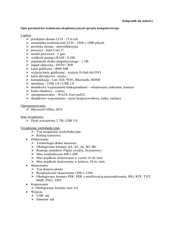 Załącznik do umowy Opis parametrów techniczno-eksploatacyjnych sprzętu komputerowego Laptop: przekątna ekranu LCD - 15.6 cali nominalna rozdzielczość LCD - 1920 x 1080 pikseli powłoka ekranu - antyrefleksyjna procesor - Intel Core i7 model procesora - 5 gen. wielkość pamięci RAM - 8 GB pojemność dysku magnetycznego - 1 TB napęd optyczny - DVD+/-RW karta graficzna - 4096 MB wyjścia karty graficznej - wyjście D-Sub lub DVI karta dźwiękowa - stereo komunikacja - Lan 1Gb, WiFi, Bluetooth, HDMI interfejsy - USB 3.0 i USB 2.0 dodatkowe wyposażenie/funkcjonalność - wbudowany mikrofon, kamera kolor obudowy - czarny, oprogramowanie - Win10, Eset nod32, dodatkowe wyposażenie - mysz bezprzewodowa, torba, zasilacz Oprogramowanie: Microsoft Office 2016 Inne urządzenia: Dysk zewnętrzny 2 TB, USB 3.0 Urządzenie wielofunkcyjne: Typ urządzenie wielofunkcyjne Rodzaj kolorowa Drukowanie Technologia druku laserowa Obsługiwane formaty A4, A5, A6, B5, B6 Rodzaje nośników Papier zwykły, broszurowy Max rozdzielczość 600 x 600 Max prędkość drukowania w czerni 18 str./min Max prędkość drukowania w kolorze 18 str./min Skanowanie Typ skanera płaski Rozdzielczość skanowania 1200 x 1200 Obsługiwane formaty PDF, PDF z możliwością przeszukiwania, JPG, RTF, TXT, BMP, PNG, TIFF Kopiowanie Obsługiwane formaty max A4 Wejścia USB tak Ethernet tak