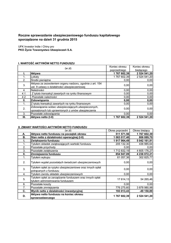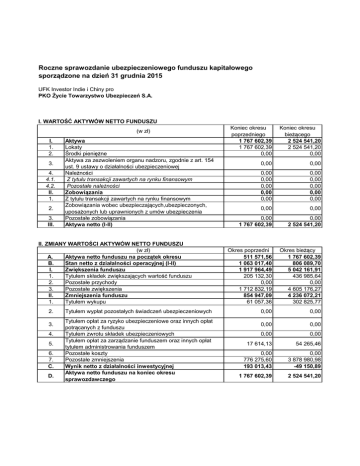 Roczne sprawozdanie ubezpieczeniowego funduszu kapitałowego sporządzone na dzień 31 grudnia 2015 UFK Investor Indie i Chiny pro PKO Życie Towarzystwo Ubezpieczeń S.A. UFK Investor Indie i Chiny pro I. WARTOŚĆ AKTYWÓW NETTO FUNDUSZU (w zł) I. 1. 2. 3. 4. 4.1. 4.2. II. 1. 2. 3. III. Aktywa Lokaty Środki pieniężne Aktywa za zezwoleniem organu nadzoru, zgodnie z art. 154 ust. 9 ustawy o działalności ubezpieczeniowej Należności Z tytułu transakcji zawartych na rynku finansowym Pozostałe należności Zobowiązania Z tytułu transakcji zawartych na rynku finansowym Zobowiązania wobec ubezpieczających,ubezpieczonych, uposażonych lub uprawnionych z umów ubezpieczenia Pozostałe zobowiązania Aktywa netto (I-II) II. ZMIANY WARTOŚCI AKTYWÓW NETTO FUNDUSZU (w zł) A. Aktywa netto funduszu na początek okresu B. Stan netto z działalności operacyjnej (I-II) I. Zwiększenia funduszu 1. Tytułem składek zwiększających wartość funduszu Pozostałe przychody 2. 3. Pozostałe zwiększenia II. Zmniejszenia funduszu 1. Tytułem wykupu 2. 3. 4. 5. 6. 7. C. D. Tytułem wypłat pozostałych świadczeń ubezpieczeniowych Tytułem opłat za ryzyko ubezpieczeniowe oraz innych opłat potrącanych z funduszu Tytułem zwrotu składek ubezpieczeniowych Tytułem opłat za zarządzanie funduszem oraz innych opłat tytułem administrowania funduszem Pozostałe koszty Pozostałe zmniejszenia Wynik netto z działalności inwestycyjnej Aktywa netto funduszu na koniec okresu sprawozdawczego Koniec okresu poprzedniego 1 767 602,39 1 767 602,39 0,00 Koniec okresu bieżącego 2 524 541,20 2 524 541,20 0,00 0,00 0,00 0,00 0,00 0,00 0,00 0,00 0,00 0,00 0,00 0,00 0,00 0,00 0,00 0,00 1 767 602,39 0,00 2 524 541,20 Okres poprzedni 511 571,56 1 063 017,40 1 917 964,49 205 132,30 0,00 1 712 832,19 854 947,09 61 057,36 Okres bieżący 1 767 602,39 806 089,70 5 042 161,91 436 985,64 0,00 4 605 176,27 4 236 072,21 302 825,77 0,00 0,00 0,00 0,00 0,00 0,00 17 614,13 54 265,46 0,00 776 275,60 193 013,43 0,00 3 878 980,98 -49 150,89 1 767 602,39 2 524 541,20 III. LICZBA I WARTOŚĆ JEDNOSTEK ROZRACHUNKOWYCH Pozycja 1. Liczba jednostek rozrachunkowych: liczba jednostek rozrachunkowych na początek okresu 1.1 sprawozdawczego liczba jednostek rozrachunkowych na koniec okresu 1.2 sprawozdawczego 2. Wartość jednostki rozrachunkowej: wartość jednostki rozrachunkowej na początek okresu 2.1 sprawozdawczego minimalna wartość jednostki rozrachunkowej w okresie 2.2 sprawozdawczym maksymalna wartość jednostki rozrachunkowej w okresie 2.3 sprawozdawczym wartość jednostki rozliczeniowej na koniec okresu 2.4 sprawozdawczego Okres poprzedni Okres bieżący 3 073,4248 8 685,5800 8 685,5800 12 534,3389 166,45 203,51 158,13 184,08 204,23 252,35 203,51 201,41 IV. ZESTAWIENIE AKTYWÓW NETTO FUNDUSZU - półroczne Udział w aktywach netto funduszu (w %) 2 3 2 524 541,20 100,00% Wartość bilansowa (w zł) 1 I. Lokaty (suma 1-12) 1. Papiery wartościowe emitowane, poręczone lub gwarantowane przez Skarb Państwa lub organizacje międzynarodowe, których członkiem jest Rzeczpospolita Polska 2. 3. 4. 5. 6. 7. 8. 9. 10. 11. 12. Obligacje emitowane lub poręczone przez jednostki samorządu terytorialnego lub związki jednostek samorządu terytorialnego Inne dłużne papiery wartościowe o stałej stopie dochodu Akcje Udziały Jednostki uczestnictwa i certyfikaty inwestycyjne w funduszach inwestycyjnych Instrumenty pochodne, o ile służą zmniejszeniu ryzyka związanego z innymi aktywami stanowiącymi pokrycie rezerw techniczno-ubezpieczeniowych Inne papiery wartościowe o zmiennej kwocie dochodu Pożyczki Nieruchomości Depozyty bankowe Pozostałe lokaty II. Aktywa za zezwoleniem organu nadzoru, zgodnie z art. 154 ust. 9 ustawy o działalności ubezpieczeniowej III. IV. V. VI. 1 2 3 Środki pieniężne Należności Zobowiązania Aktywa netto (w tym) krajowe zagraniczne - kraje UE zagraniczne - kraje poza UE 0,00 0,00% 0,00 0,00% 0,00 0,00 0,00 0,00% 0,00% 0,00% 2 524 541,20 100,00% 0,00 0,00% 0,00 0,00 0,00 0,00 0,00 0,00% 0,00% 0,00% 0,00% 0,00% 0,00 0,00% 0,00 0,00 0,00 2 524 541,20 2 524 541,20 0,00 0,00 0,00% 0,00% 0,00% 100,00% 100,00% 0,00% 0,00% V. ZESTAWIENIE AKTYWÓW NETTO FUNDUSZU - roczne Udział w aktywach netto funduszu (w %) 2 3 2 524 541,20 100,00% Wartość bilansowa (w zł) 1 I. Lokaty (suma 1-12) 1. Papiery wartościowe emitowane, poręczone lub gwarantowane przez Skarb Państwa lub organizacje międzynarodowe, których członkiem jest Rzeczpospolita Polska 1.1 1.2 1.3 2. 3. 3.1 3.2 4. 4.1 4.2 5. 6. 6.1 6.2 6.2.1 6.2.2 7. 7.1 7.2 7.3 7.4 7.5 8. 9. 9.1 9.2 9.3 9.4 10. 11. 12. Obligacje Bony skarbowe Inne Obligacje emitowane lub poręczone przez jednostki samorządu terytorialnego lub związki jednostek samorządu terytorialnego Inne dłużne papiery wartościowe o stałej stopie dochodu Notowane na rynku regulowanym Pozostałe Akcje Akcje notowane na rynku regulowanym Pozostałe akcje Udziały Jednostki uczestnictwa i certyfikaty inwestycyjne w funduszach inwestycyjnych Jednostki uczestnictwa Certyfikaty inwestycyjne Certyfikaty inwestycyjne funduszy inwestycyjnych dokonujących lokat wyłącznie w nieruchomości Certyfikaty inwestycyjne innych funduszy inwestycyjnych Instrumenty pochodne, o ile służą zmniejszeniu ryzyka związanego z innymi aktywami stanowiącymi pokrycie rezerw techniczno-ubezpieczeniowych Opcje Kontrakty terminowe Swapy walutowe Swapy procentowe Inne instrumenty pochodne Inne papiery wartościowe o zmiennej kwocie dochodu Pożyczki Zabezpieczone hipotecznie Zabezpieczone gwarancjami instytucji finansowej Pożyczki pod zastaw praw wynikających z umów ubezpieczenia na życie Inne pożyczki Nieruchomości Depozyty bankowe Pozostałe lokaty II. Aktywa za zezwoleniem organu nadzoru, zgodnie z art. 154 ust. 9 ustawy o działalności ubezpieczeniowej III. IV. V. VI. 1 2 3 Środki pieniężne Należności Zobowiązania Aktywa netto (w tym) krajowe zagraniczne - kraje UE zagraniczne - kraje po
